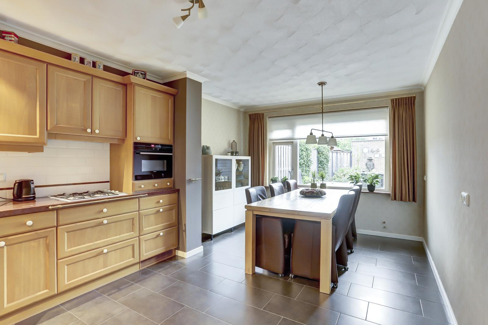 Ruime entree/hal met trapopgang, meterkast en toilet. De lichte woonkamer bevindt zich aan de straatzijde beschikt over vloerverwarming en staat in verbinding met de eetkamer en keuken aan de achterzijde. De keuken is uitgerust met o.a. een vaatwasser, kookplaat, afzuigkap, koelkast en combi-oven/magnetron.