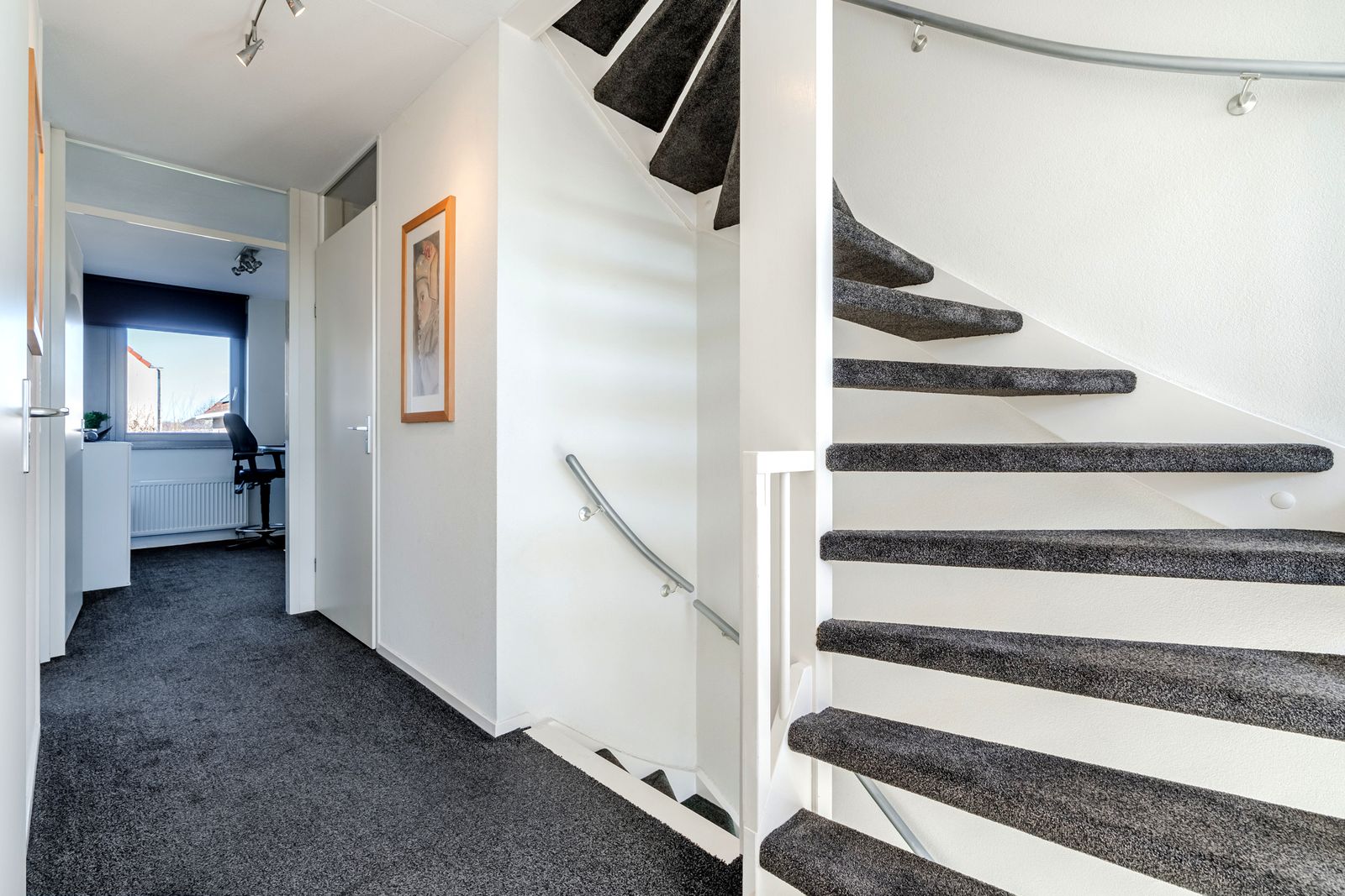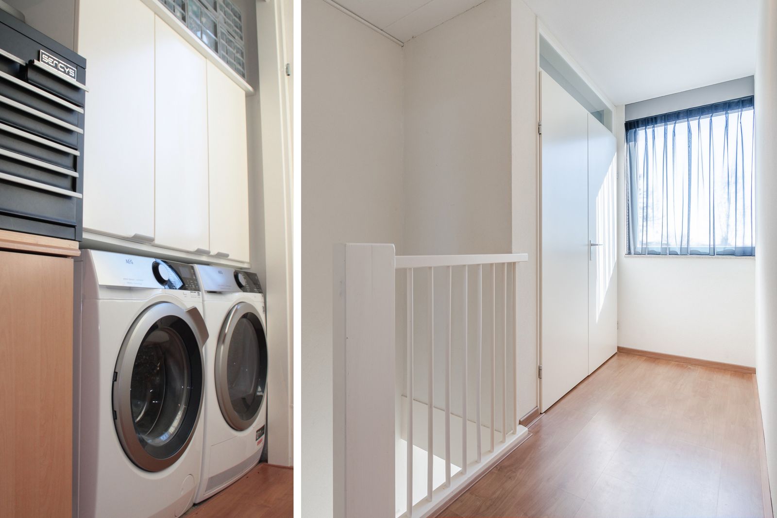 Op de overloop van de zolder bevindt zich daarnaast een praktische, afgesloten technische ruimte met aansluitingen voor wasmachine en droger, cv-installatie, PV-omvormer en ruimte voor een toekomstige (hybride) warmtepomp of thuisaccu.
