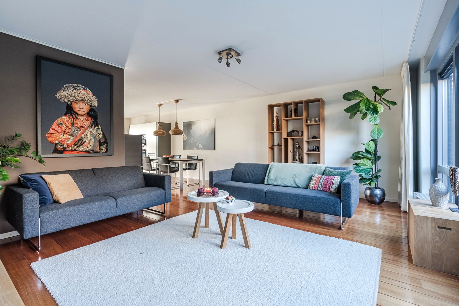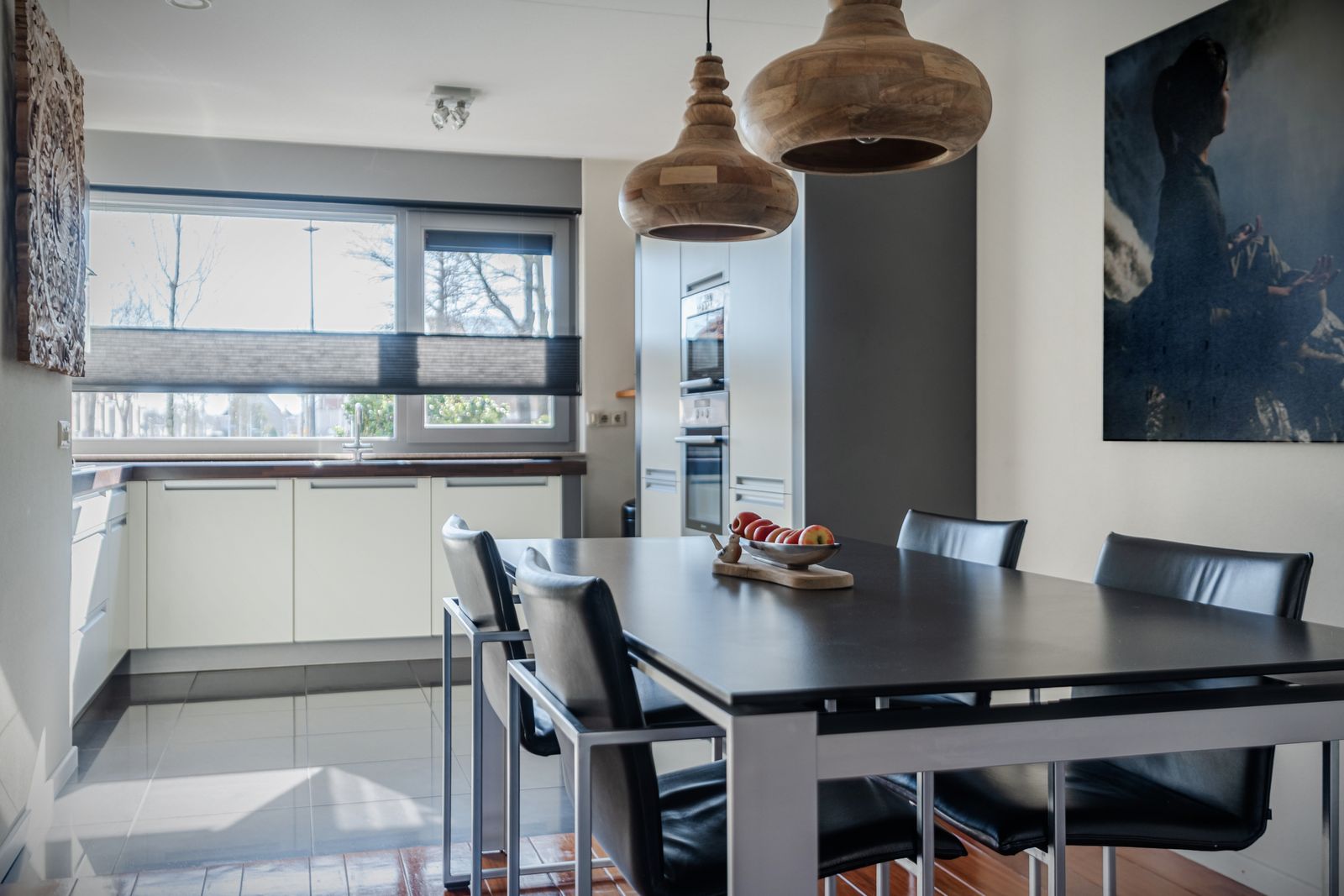 The sense of space becomes apparent the moment you enter the bright hallway with its open layout and tall windows, and continues into the generous L-shaped living room. This well-proportioned living area provides a natural separation between the sitting and dining areas, while the modern open kitchen seamlessly connects to the space.