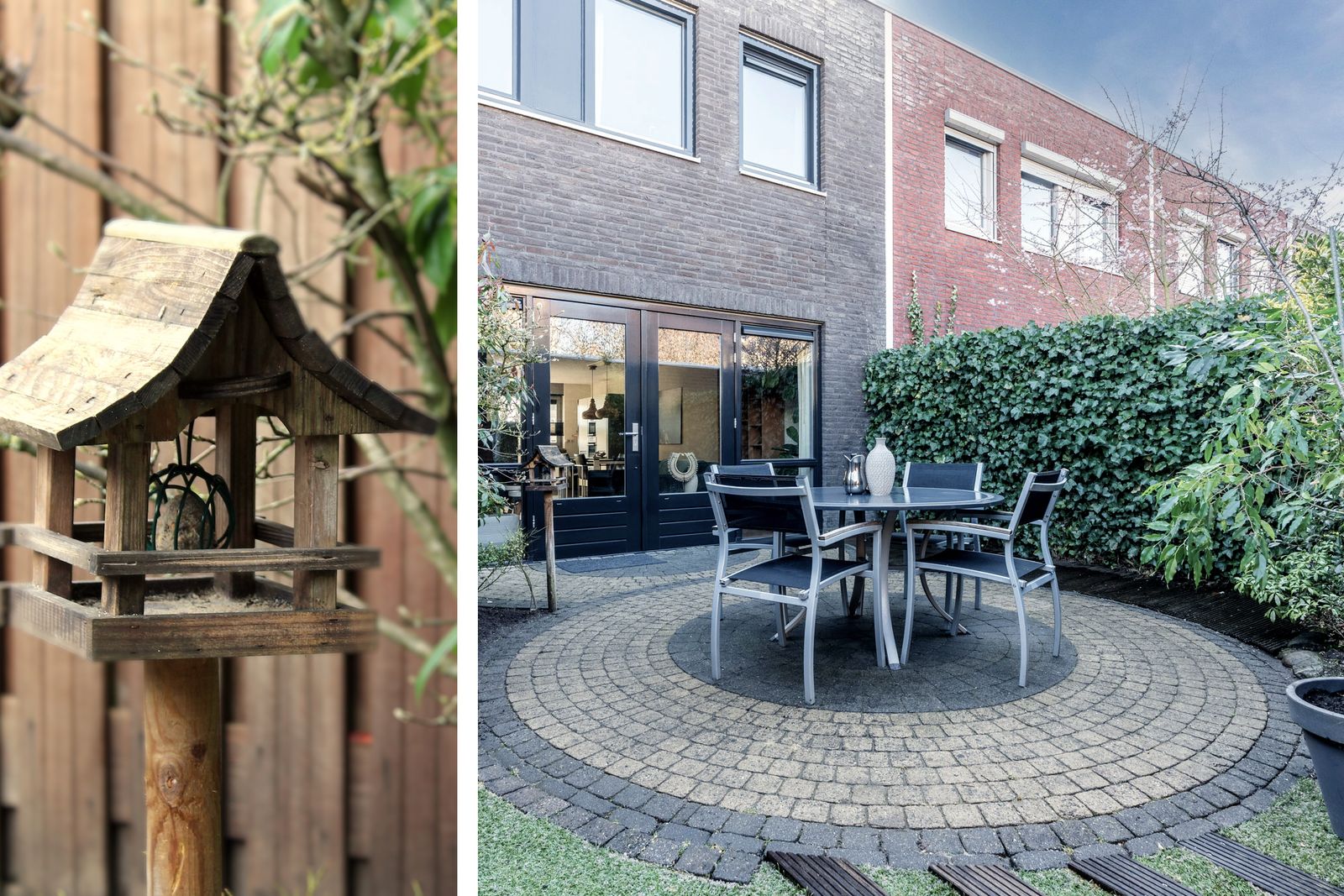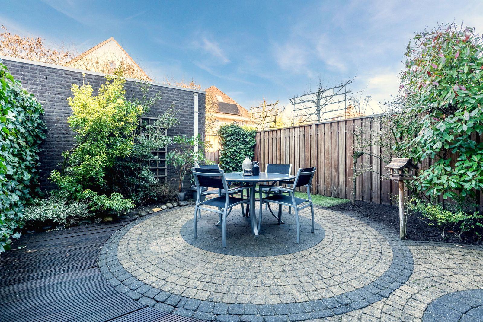 In de tuin is hardhout toegepast voor de schutting en vlonderplanken.
