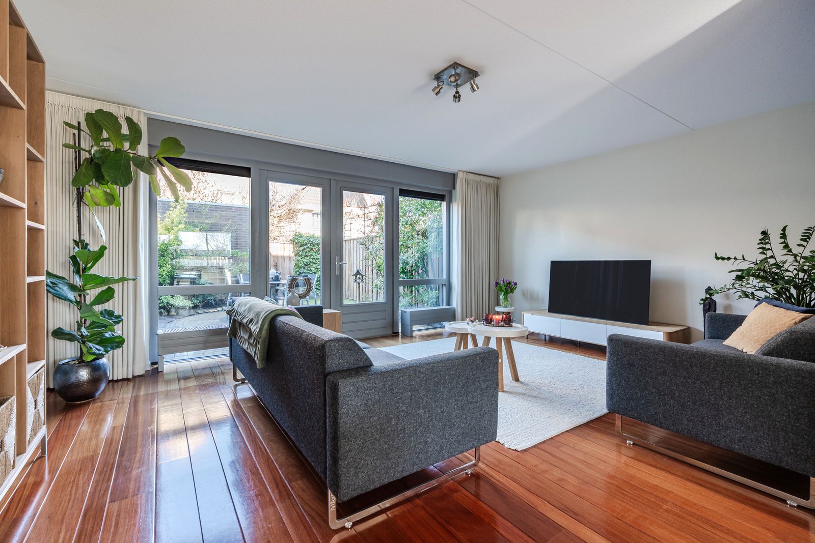 De onderhoudsvriendelijke achtertuin met achterom is voorzien van sierbestrating, borders en kunstgras. Dankzij de dubbele openslaande deuren betrekt u de tuin moeiteloos bij de woonkamer. Deze fijne buitenruimte biedt rust, privacy en alle ruimte om alleen of samen met familie en vrienden te genieten.