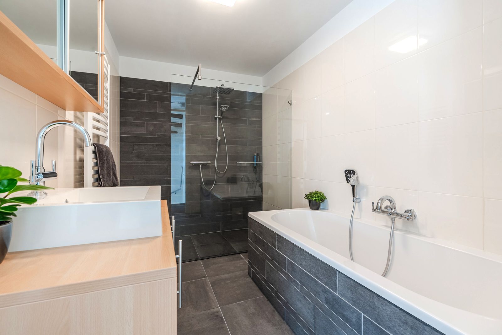 On the upper floor, you will find three well-proportioned bedrooms, a separate second toilet and a stylish bathroom featuring a walk-in shower, bathtub and floor heating.