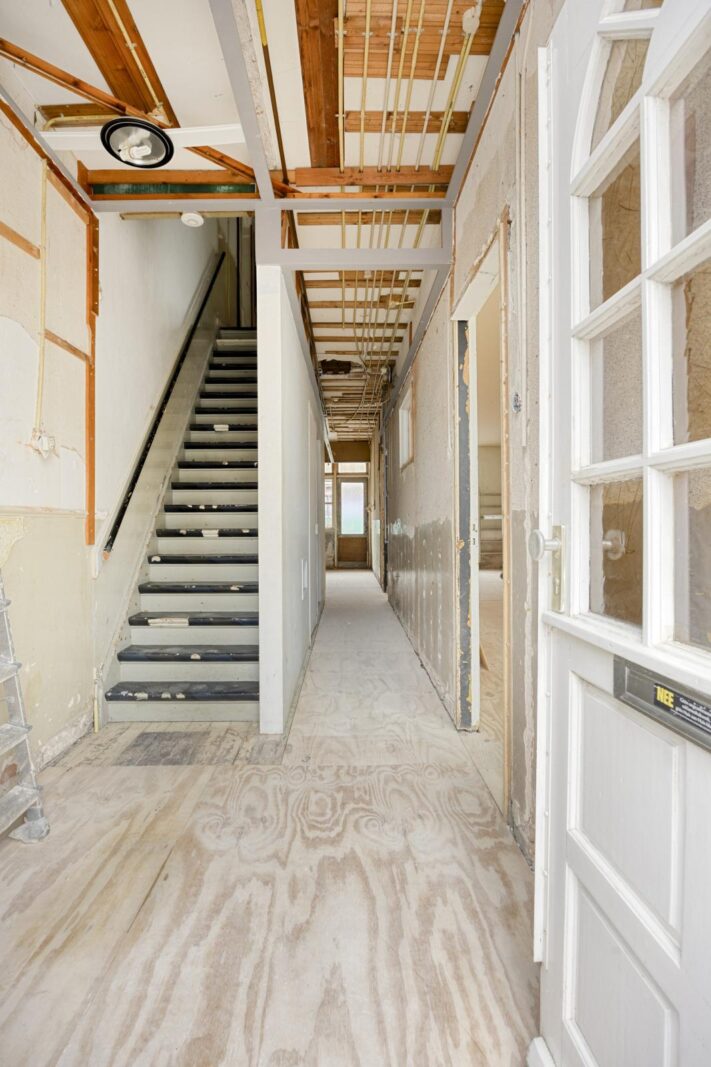 Het afgelopen half jaar zijn enkele essentiële onderdelen van de woning aangepakt. Zo is de kruipruimte opgehoogd met zand en een laag Drowa isolatiechips, de kruipruimteventilatie is verbeterd en er zijn 12 vloerbalken vervangen voor zware eikenhouten balken. De groepenkast is vervangen voor een moderne ABB groepenkast met 10 groepen, 3 aardlekschakelaars en een fornuisgroep. Het dak is geïsoleerd aan de buitenzijde (warm dakconstructie met PIR platen van 90mm) en voorzien van een nieuwe bitumen dakbedekking. Hier is bewust gekozen voor de witte bitumen variant, zodat de woning op warme zomerse dagen minder snel opwarmt. Verder is de woning vrijwel volledig gestript waarbij onder andere de schoorsteen is verwijderd.