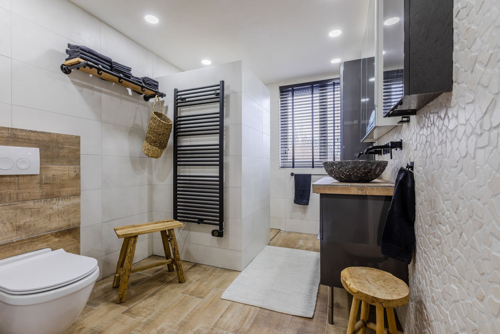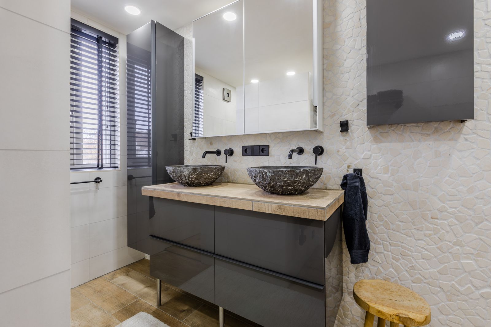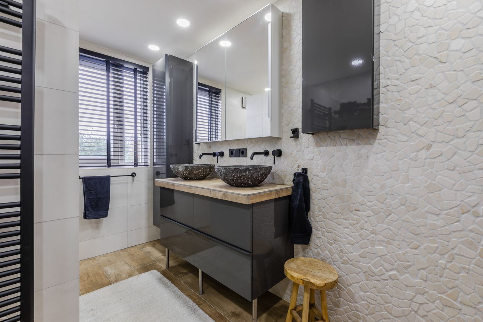 Ruime inloopdouche, 2e toilet, bad-meubel met 2 natuursteen waskommen en diverse kasten. Vloerverwarming, handdoekradiator en afzuigunit.