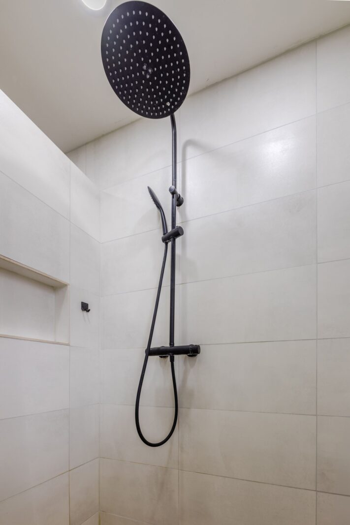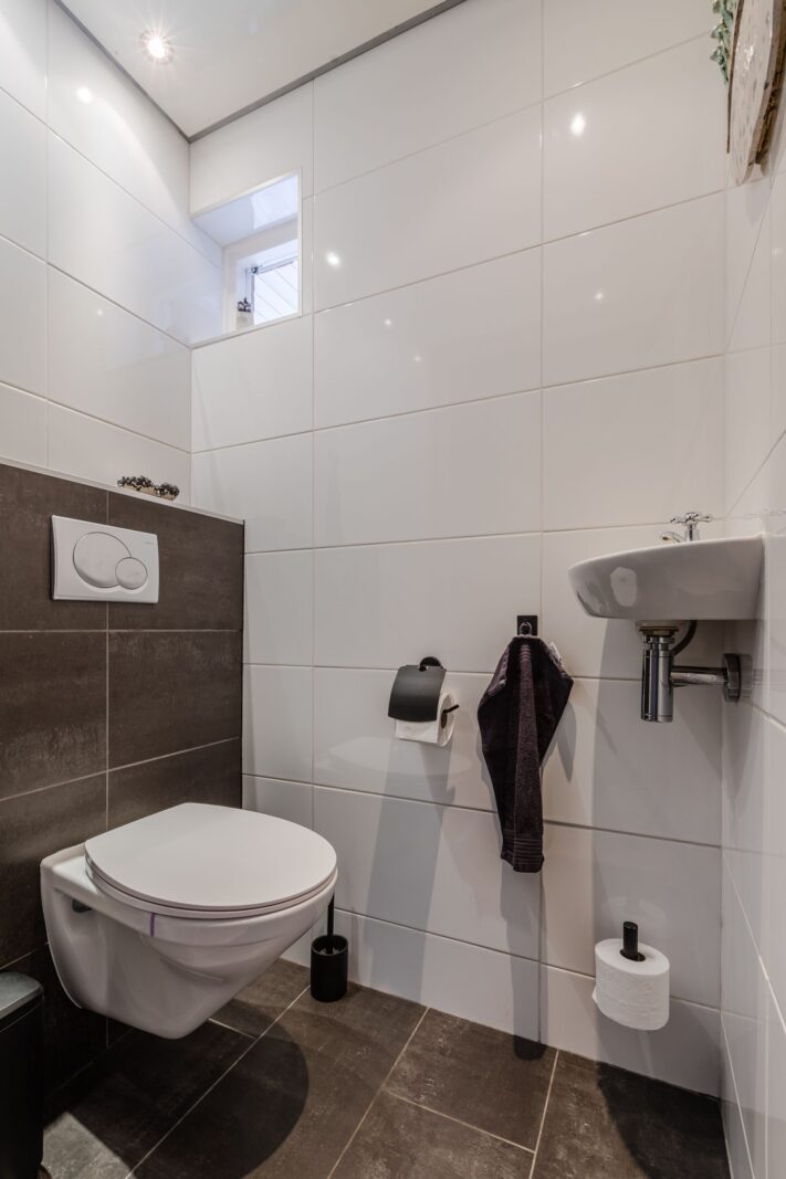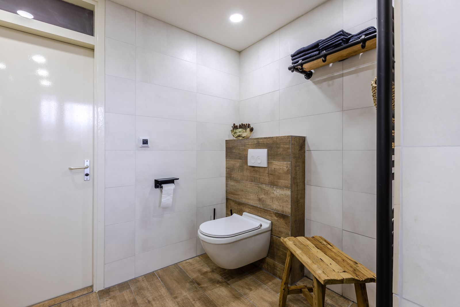 Ruime inloopdouche, 2e toilet, bad-meubel met 2 natuursteen waskommen en diverse kasten. Vloerverwarming, handdoekradiator en afzuigunit.