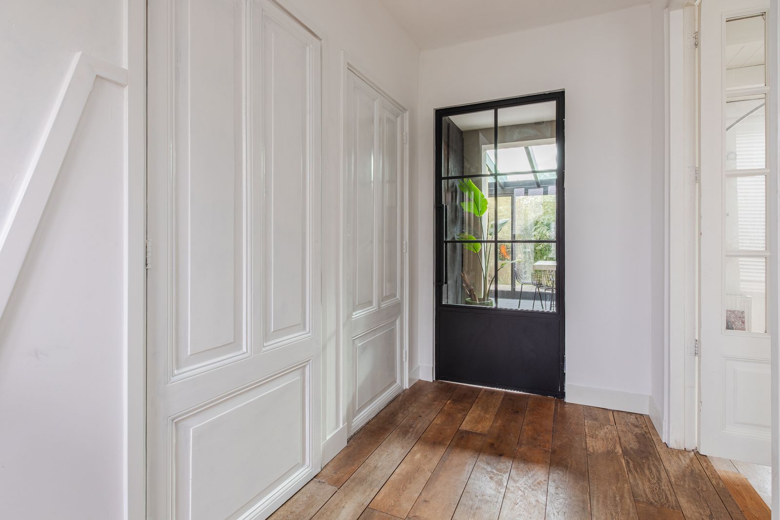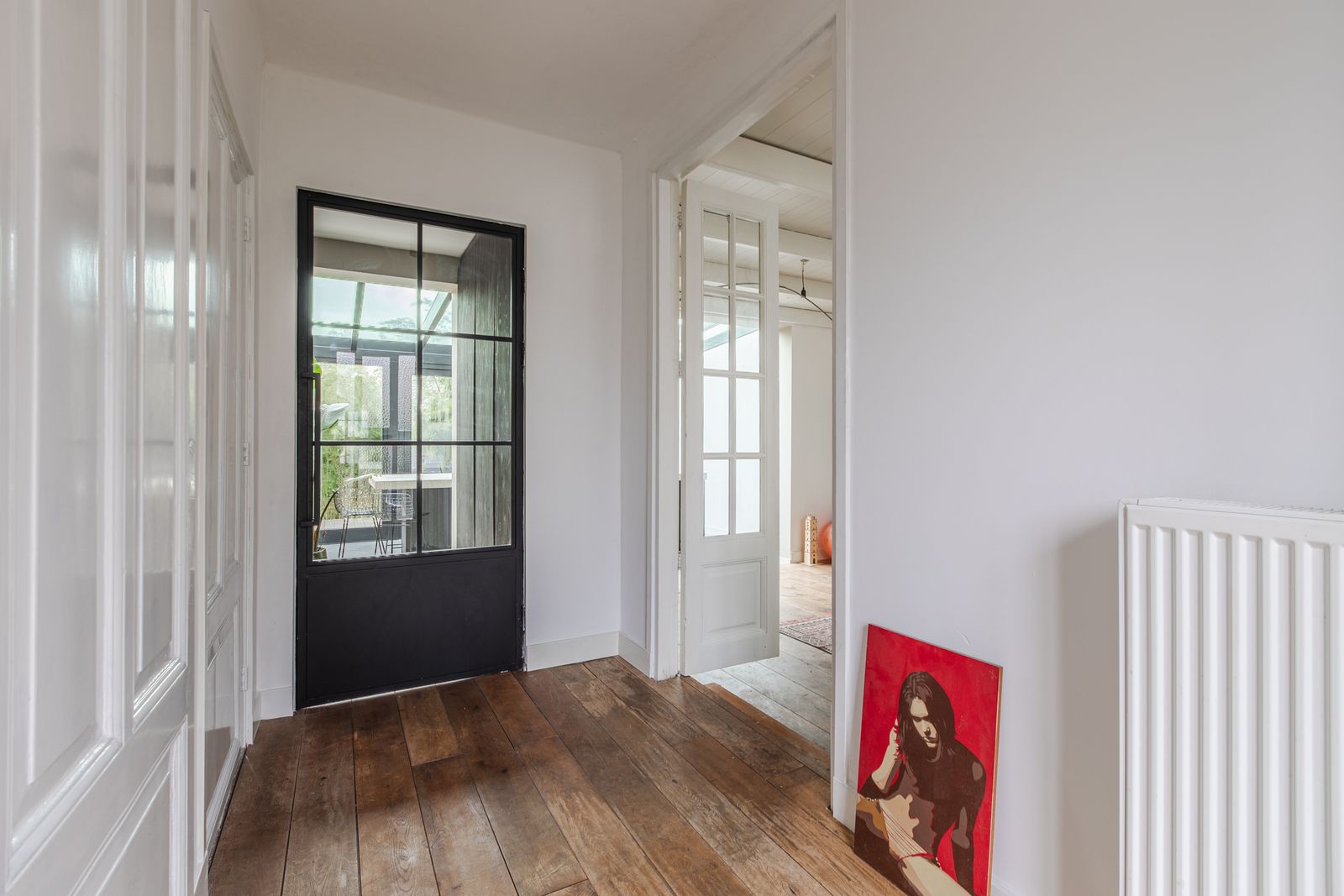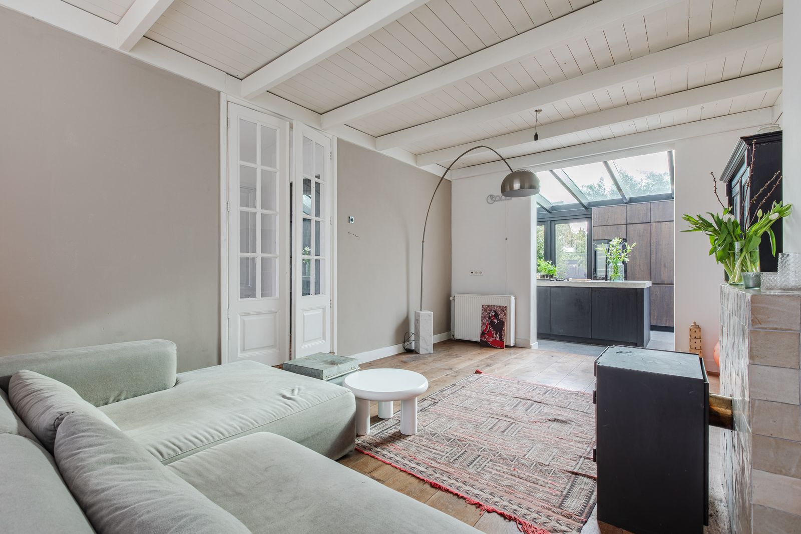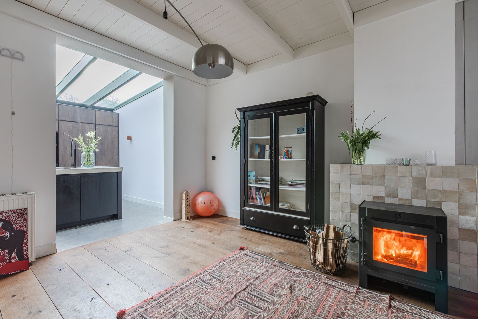Beneden tref je een grote woonkamer voorzien van brede massief eikenhouten vloerdelen, een houtkachel en leuke karaktervolle elementen zoals paneeldeuren met glas.