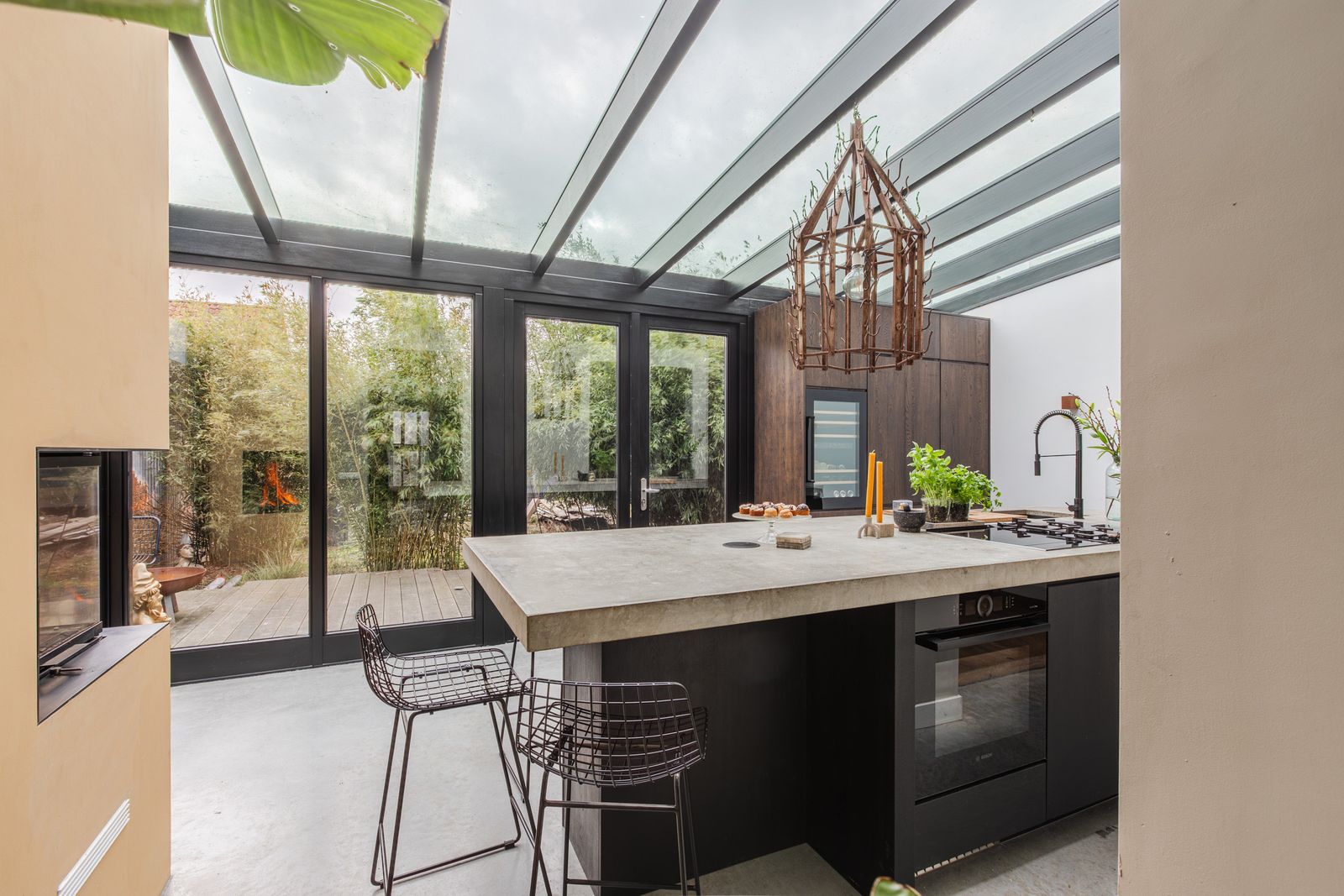 Vanuit de woonkamer kun je zo doorlopen naar de recent geplaatste uitbouw van maar liefst 24 m2 met daarin een woonkeuken voorzien van alle moderne gemakken en luxe accessoires zoals vaatwasser, stoom-oven, teppan yaki bakplaat, wijnklimaatkast (Borretti) en Energiezuinig grote houtkachel. Vanuit zowel de hal als de woonkeuken loop je door naar de bijkeuken volledig voorzien van inbouwkasten met veel opbergruimte en aansluitingen voor wasmachine en droger. Tevens vind je in de hal de toegang voor de kelder met extra bergruimte en de opstelling voor de Cv-ketel.