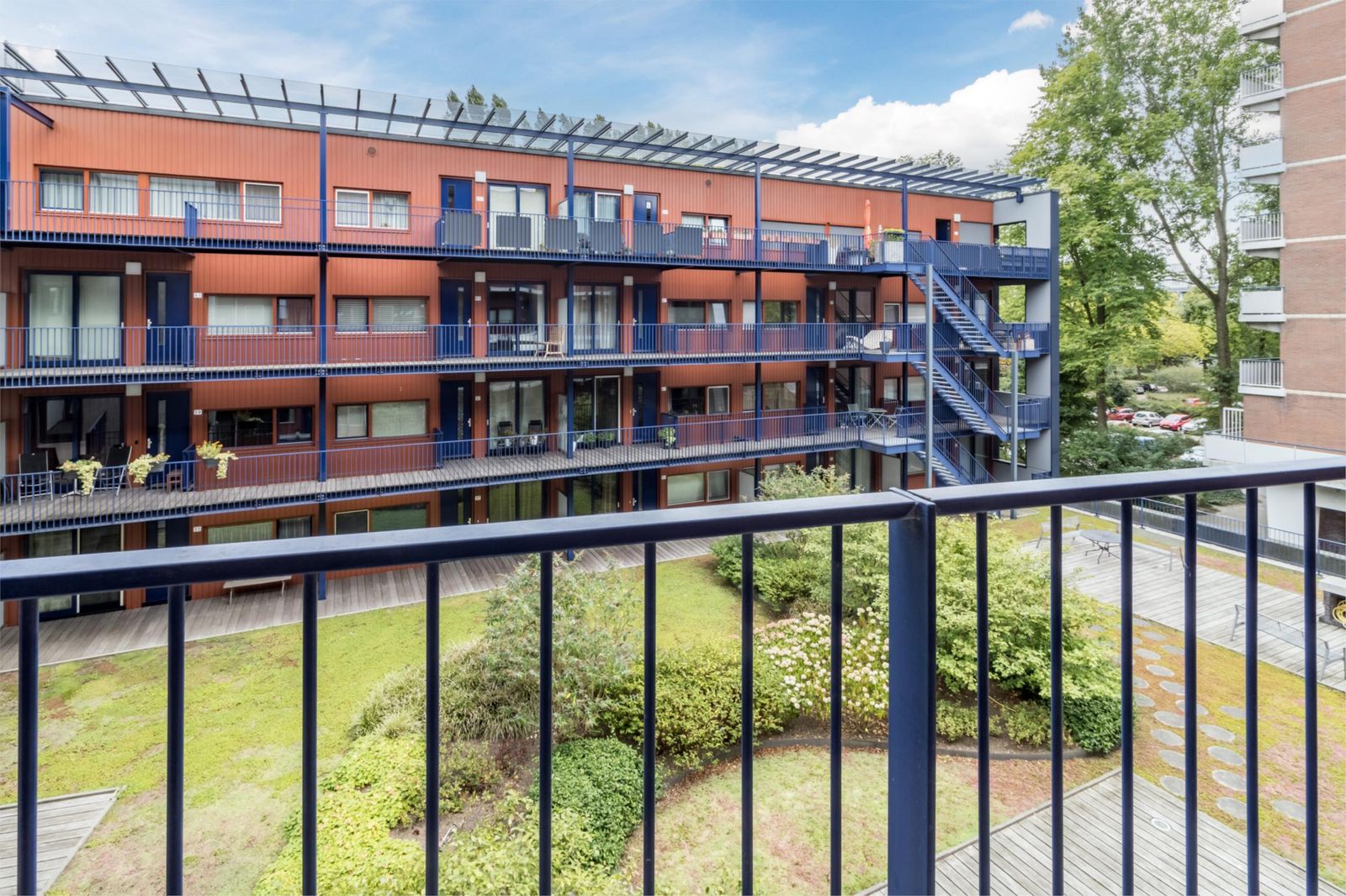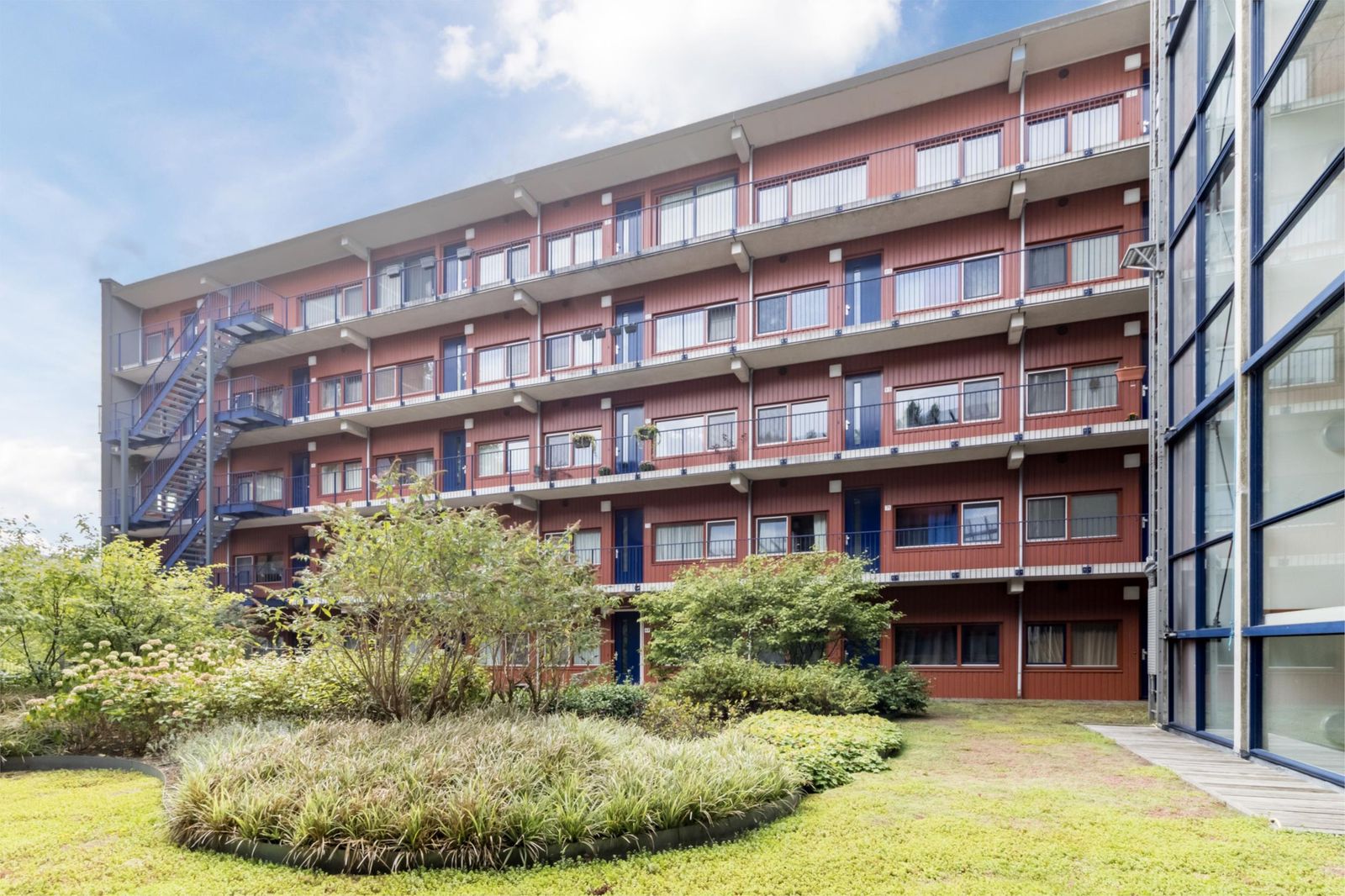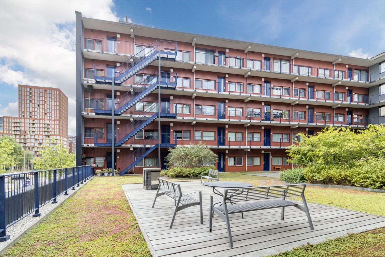 Tussen de gebouwen ligt een mooie groene binnentuin met zitplekken en een vaste gezamenlijke barbecue, ideaal voor ontspanning en gezelligheid.
