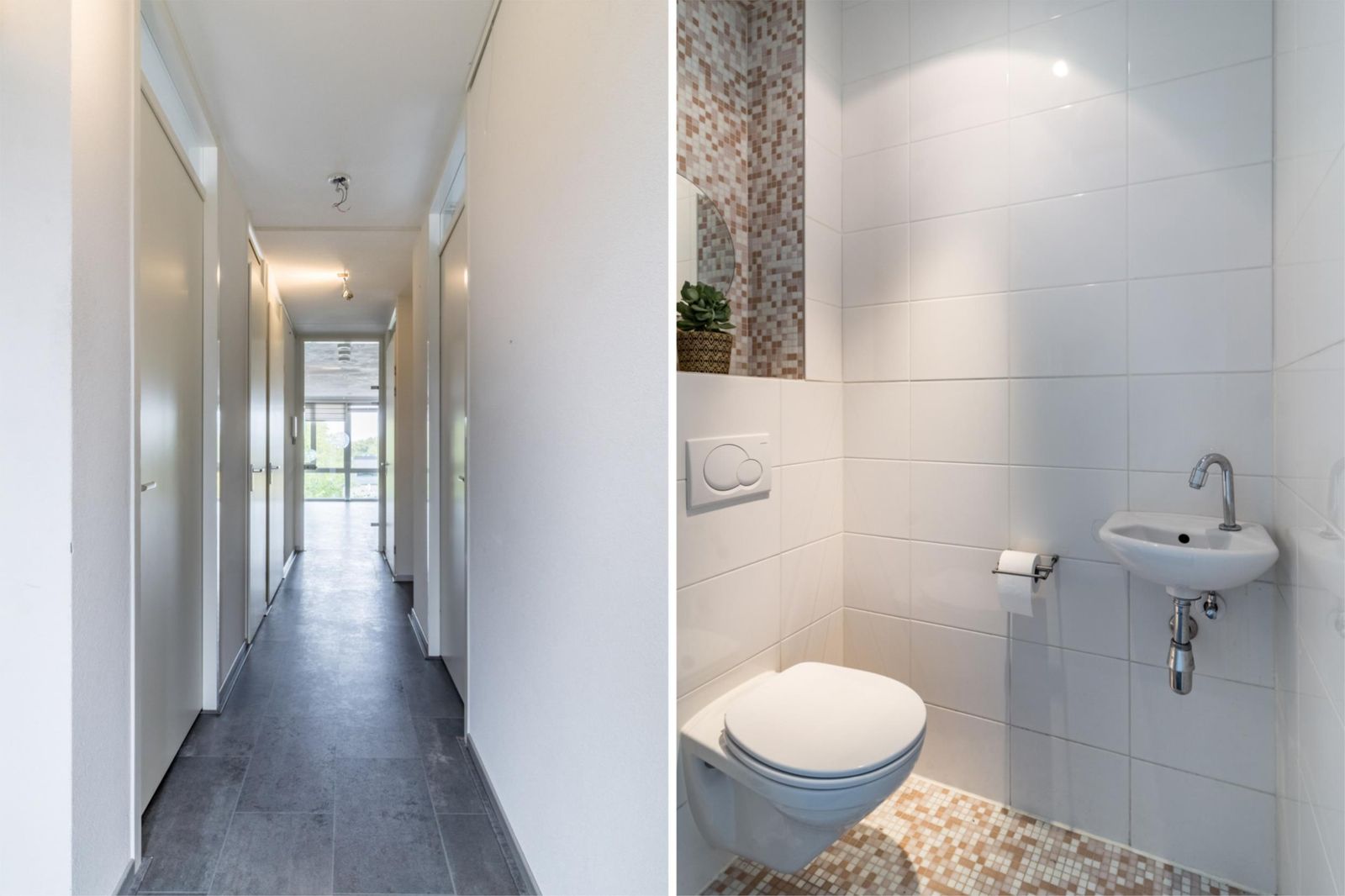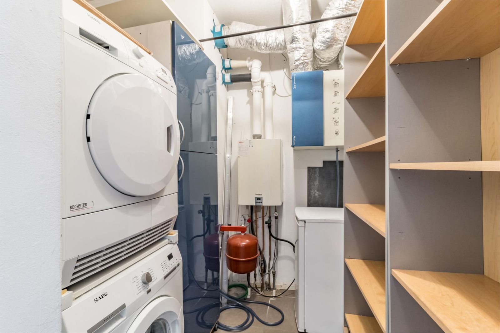 Via de galerij betreed je de woning en kom je in een diepe hal met meterkast en een modern toilet met zwevend closet en fonteintje. De praktische inpandige berging biedt ruimte voor de wasmachine en hier bevindt zich ook de CV-combiketel en WTW-installatie.
