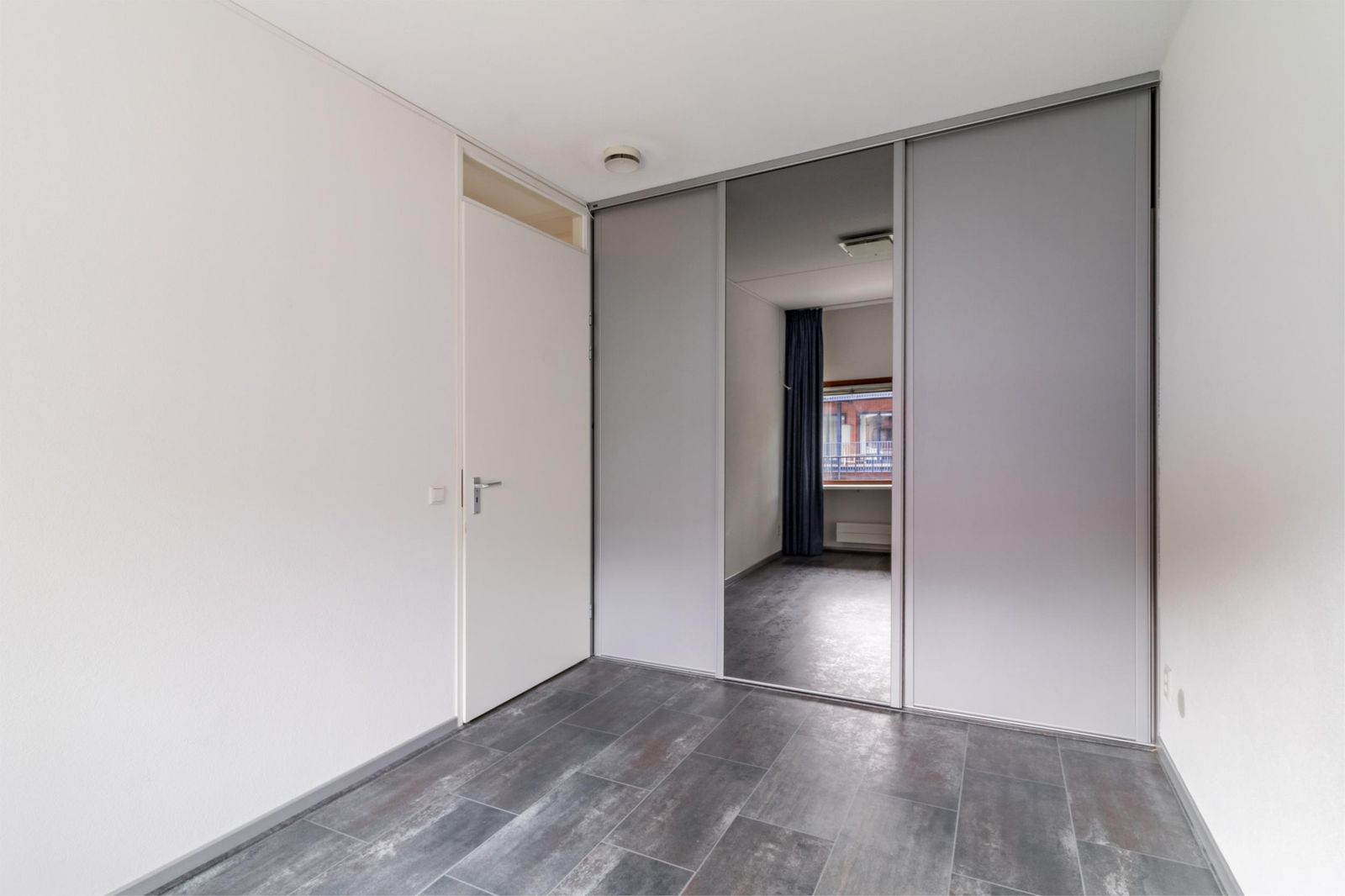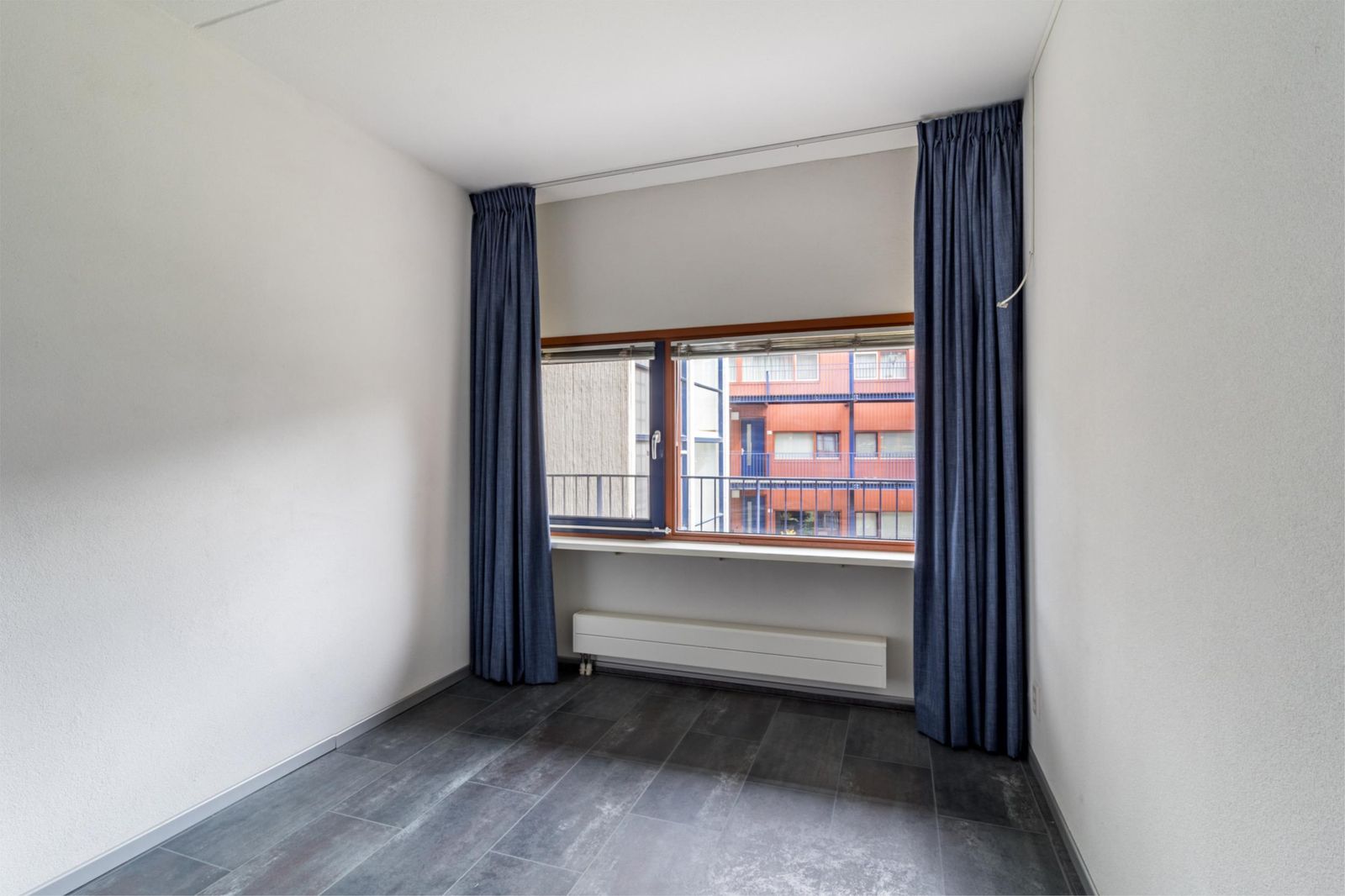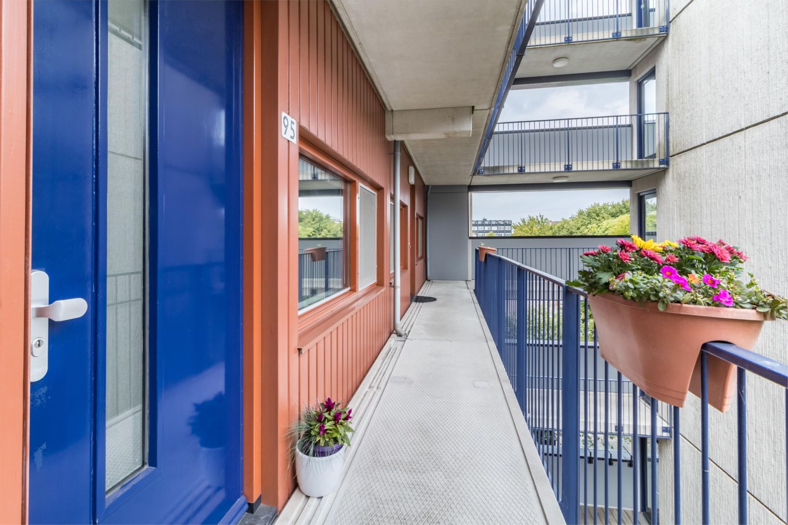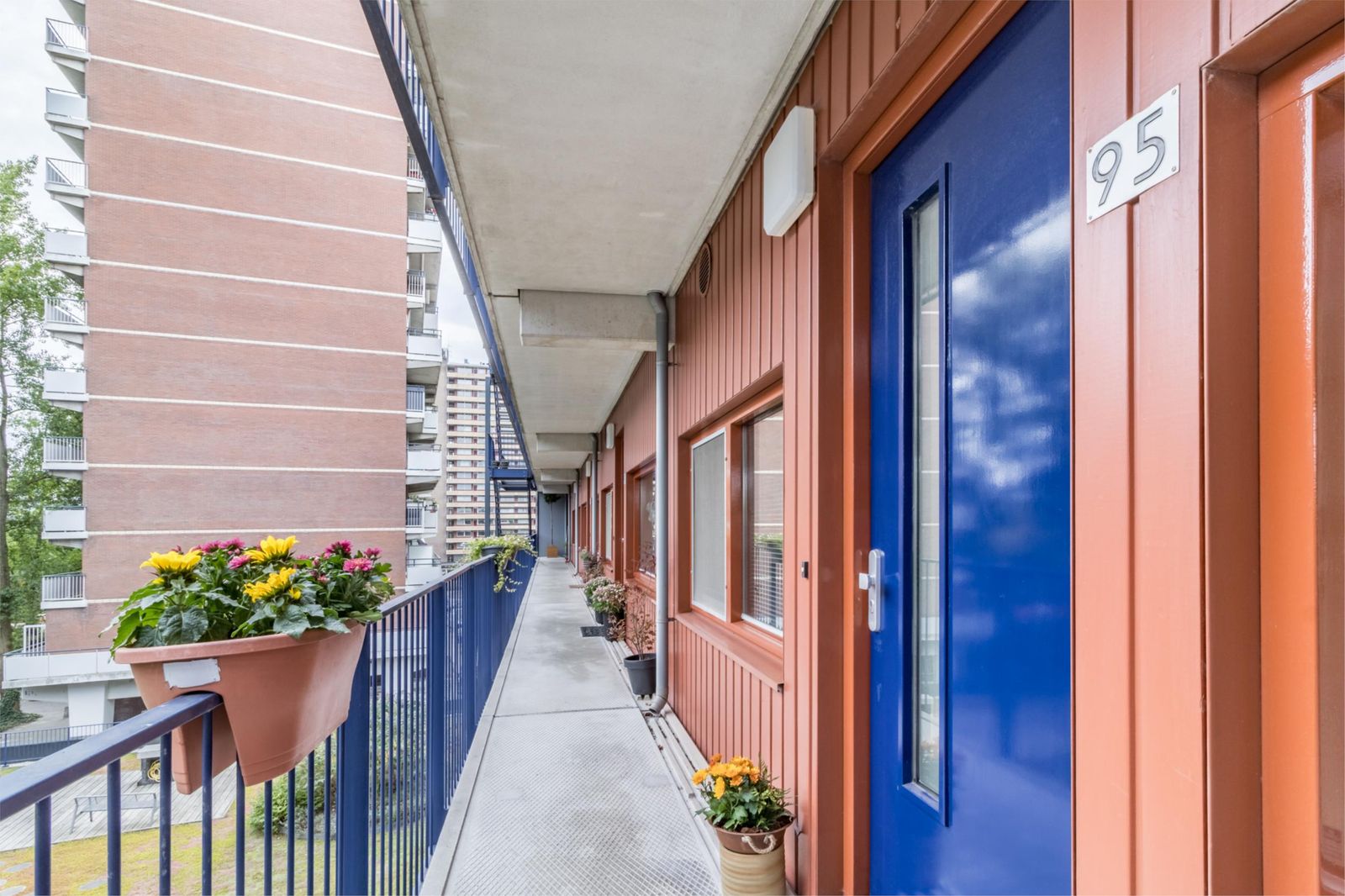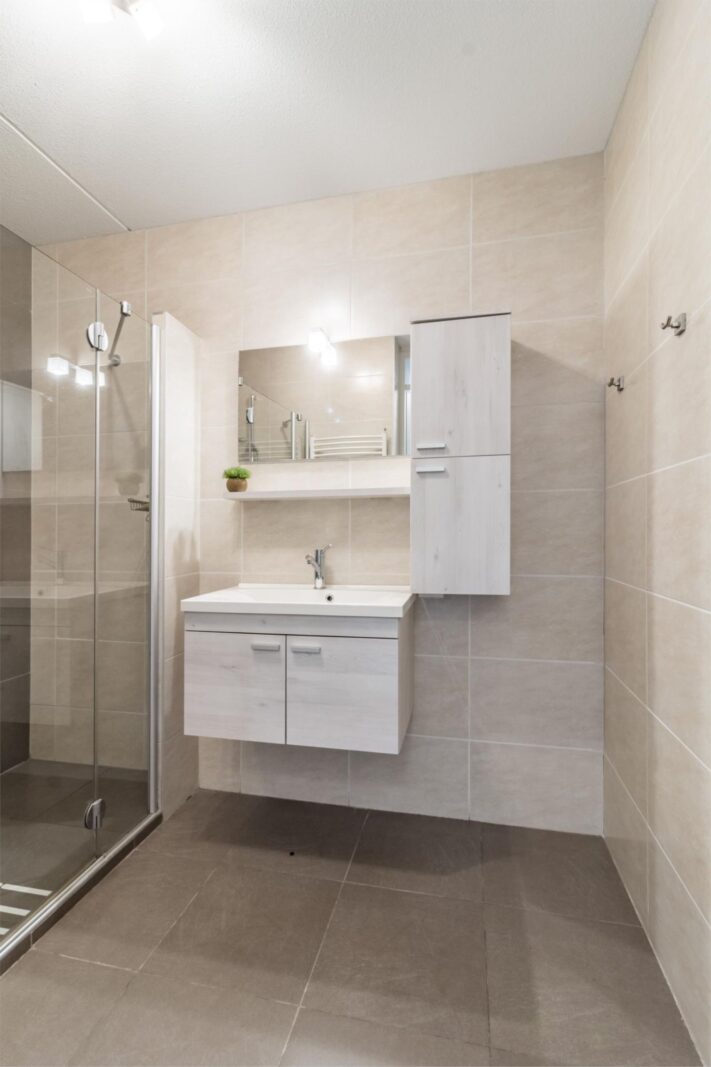 Aan de galerijkant bevinden zich twee slaapkamers, één van ca.8m² en één van 12m² welke is voorzien van een handige inbouwkast. De badkamer is licht, ruim, tijdloos betegeld en voorzien van een royale douche, handdoekenradiator en een wastafel met stijlvol bijpassend meubel voor praktische opbergruimte.