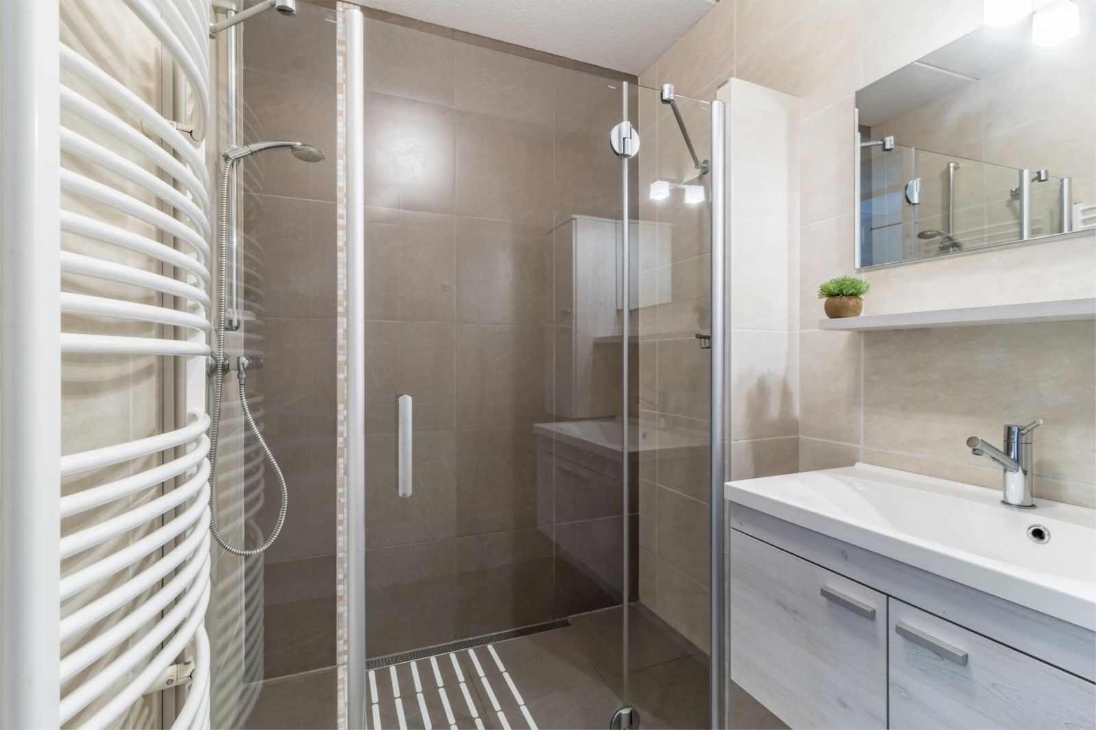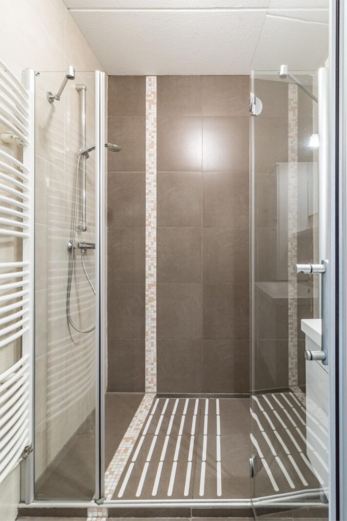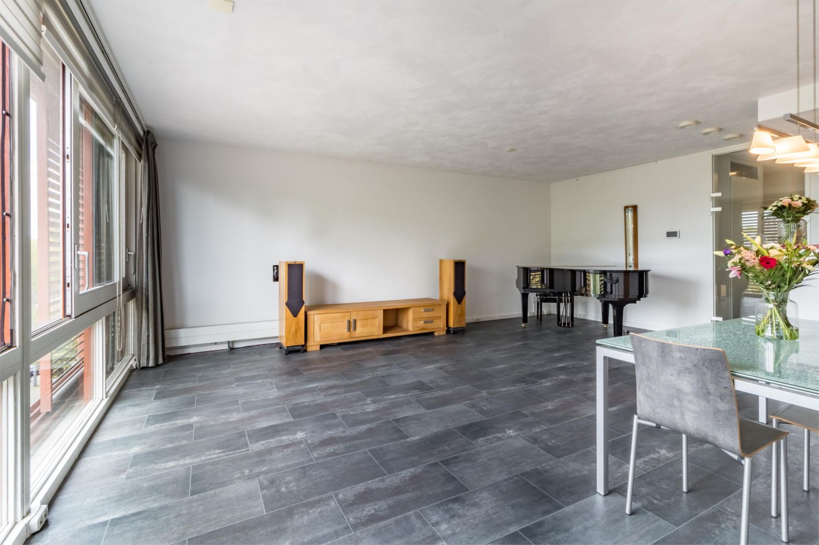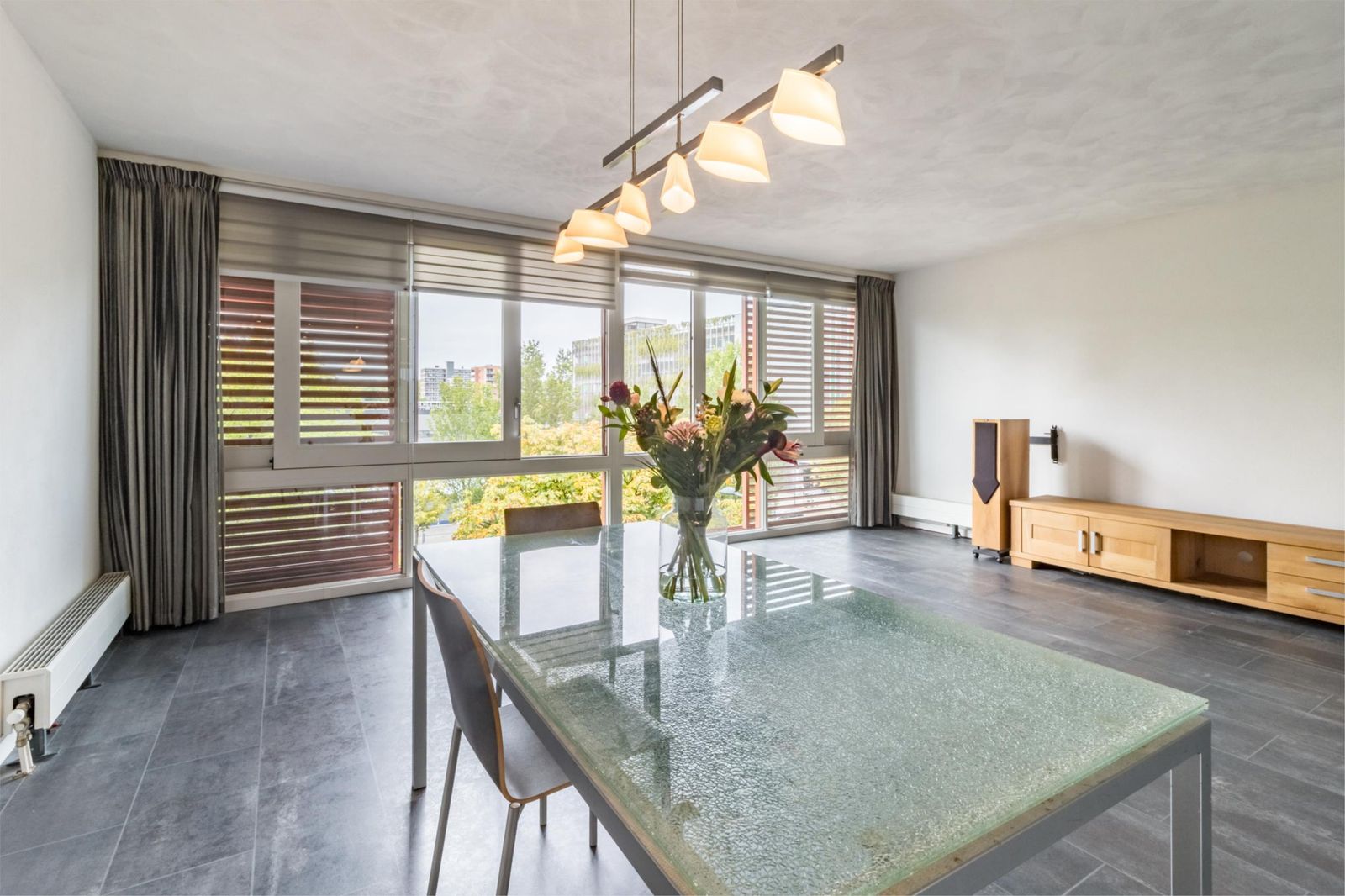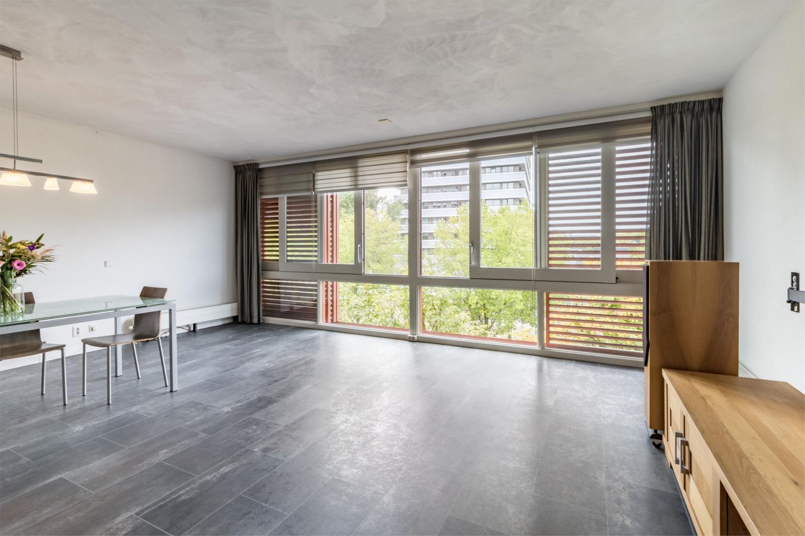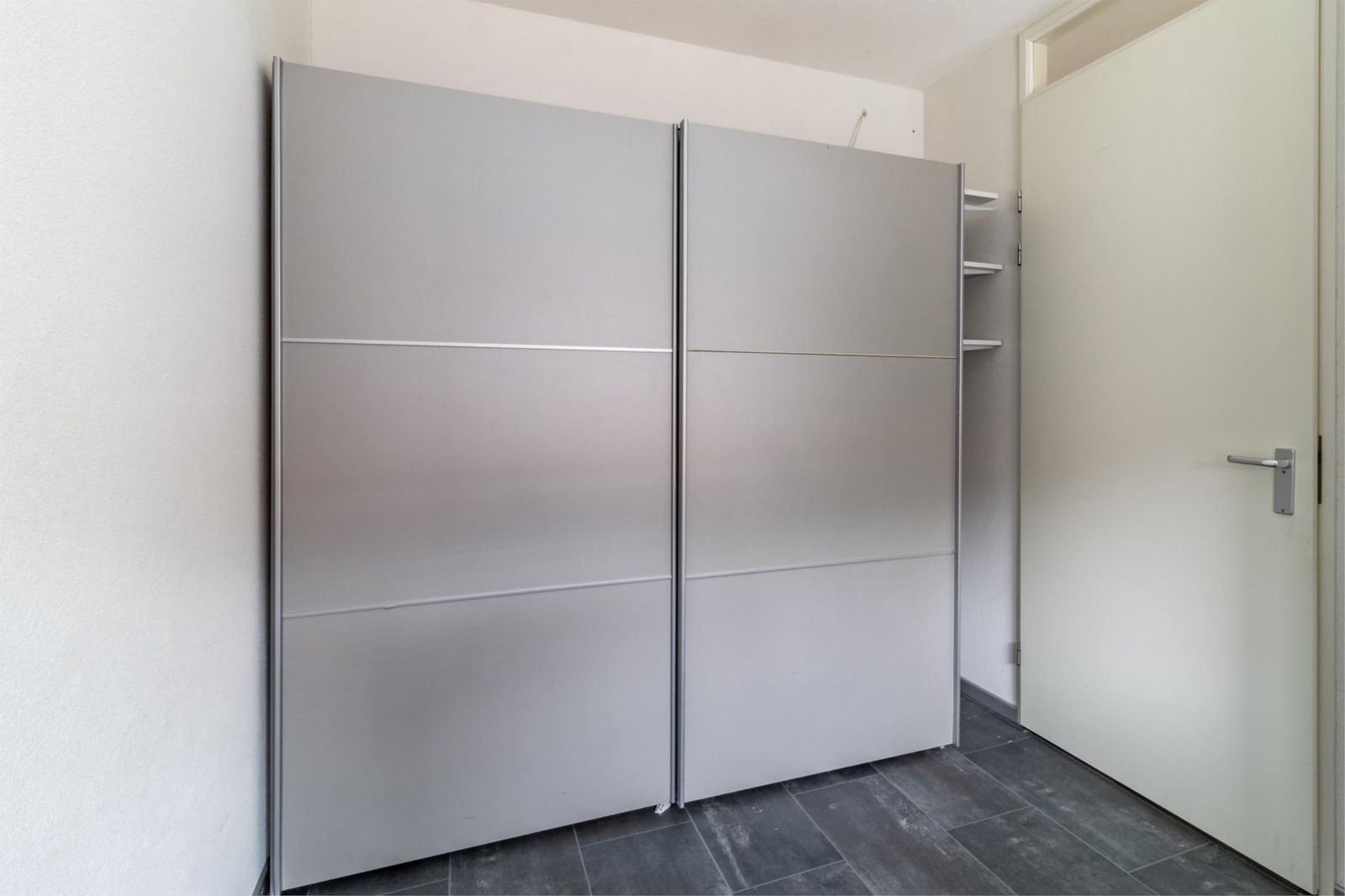 Aan de galerijkant bevinden zich twee slaapkamers, één van ca.8m² en één van 12m² welke is voorzien van een handige inbouwkast. De badkamer is licht, ruim, tijdloos betegeld en voorzien van een royale douche, handdoekenradiator en een wastafel met stijlvol bijpassend meubel voor praktische opbergruimte.