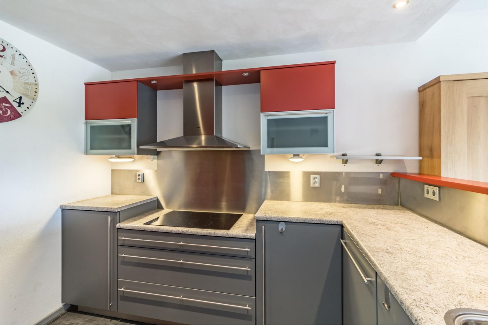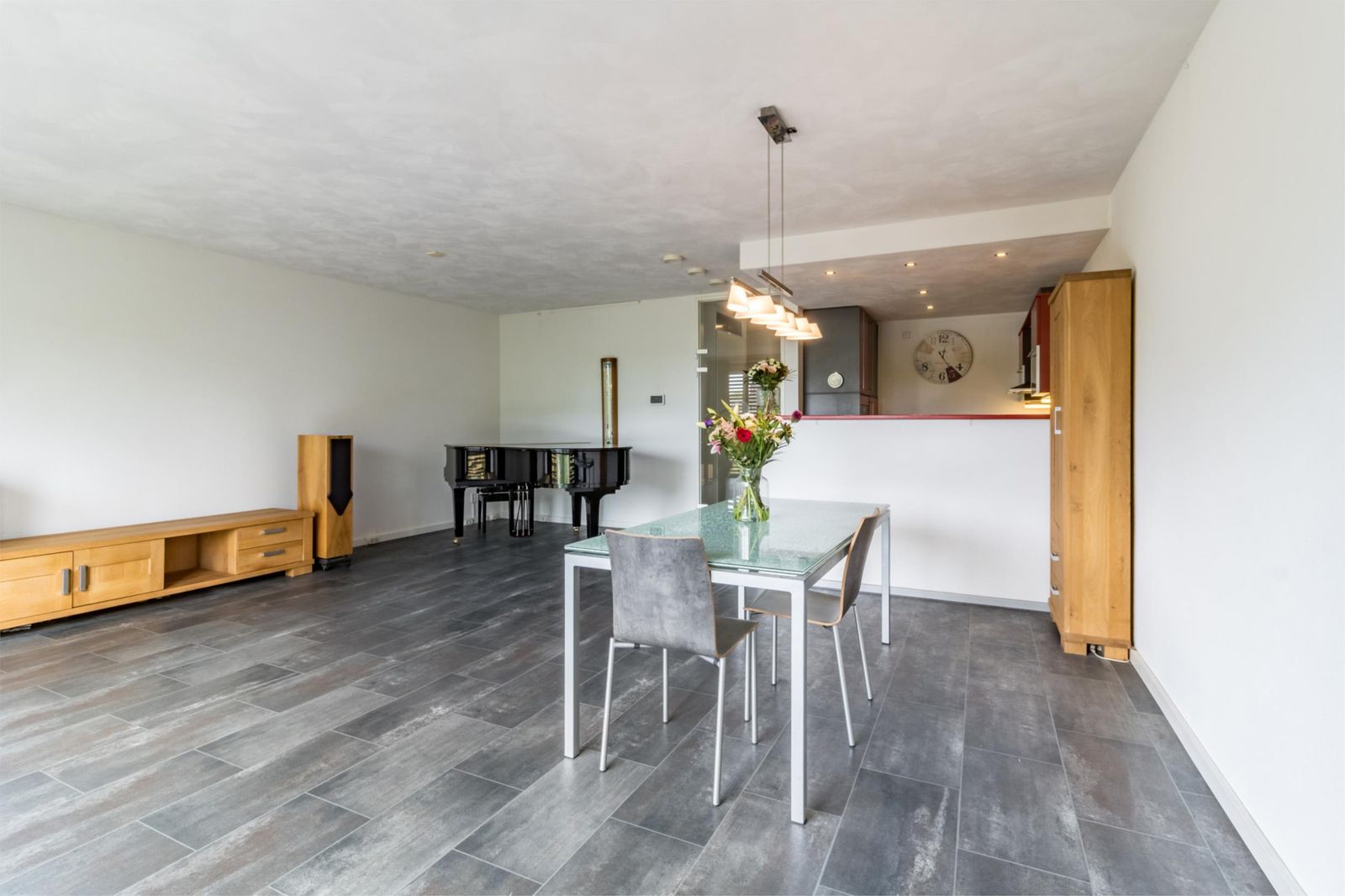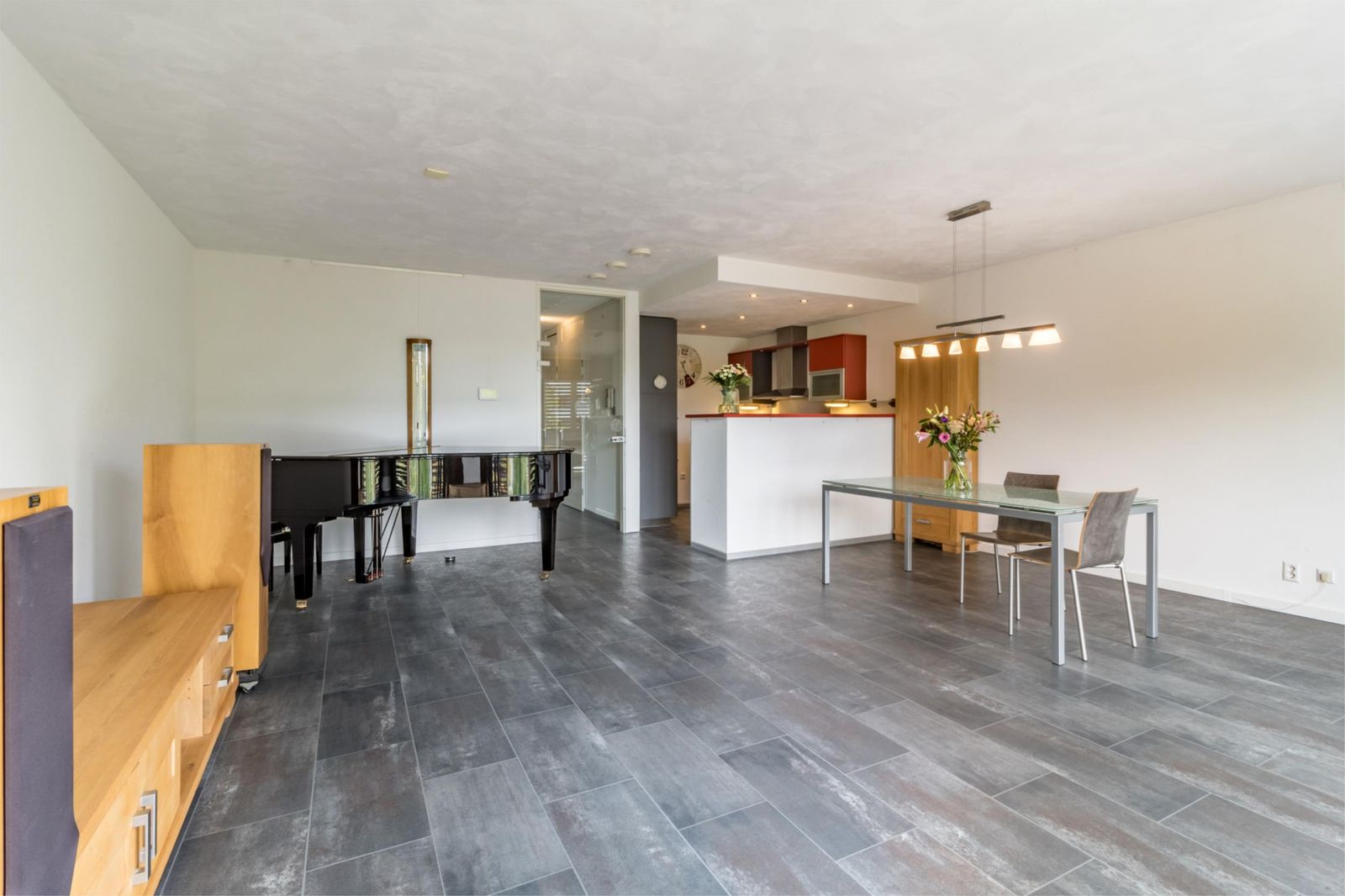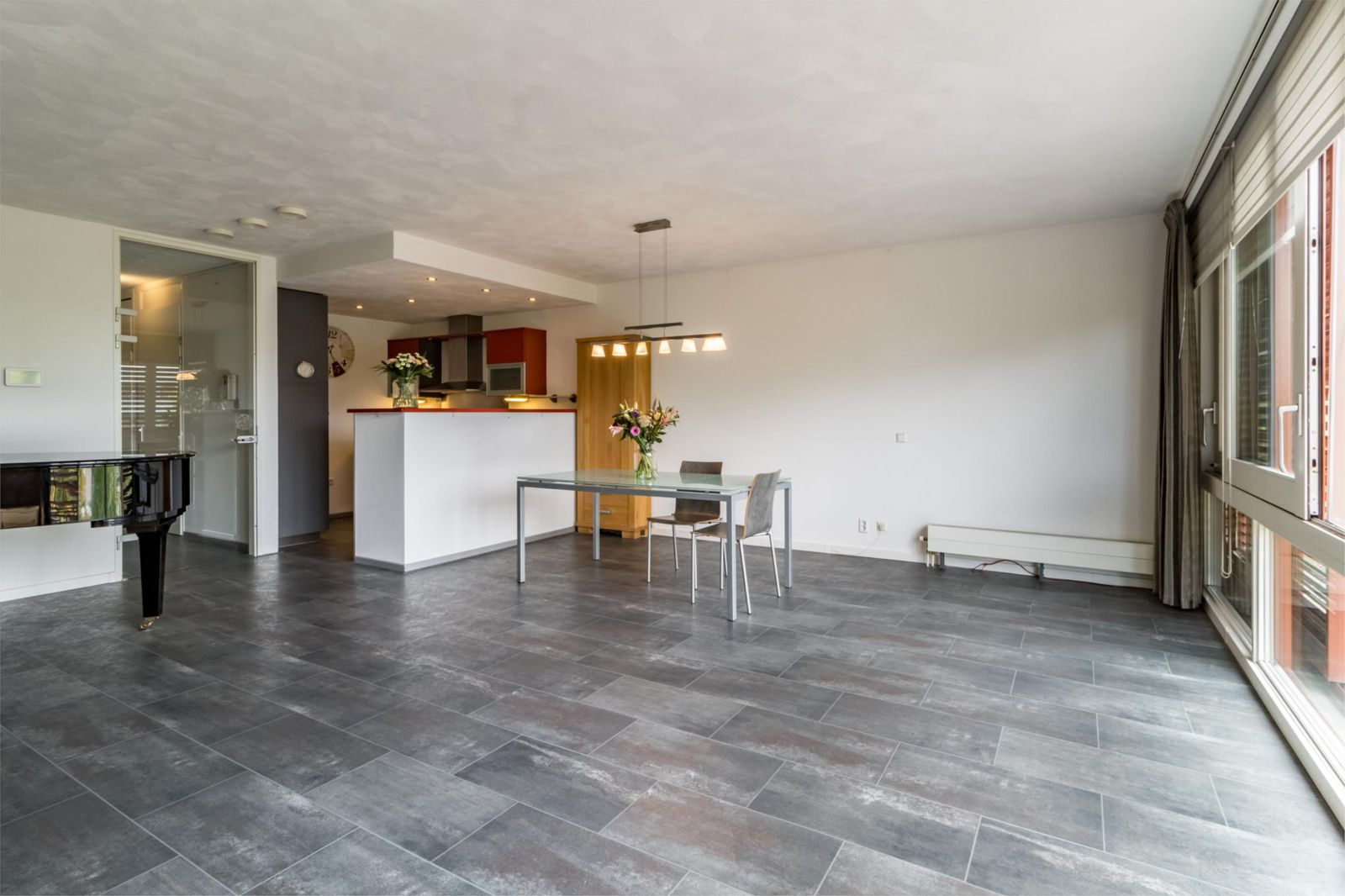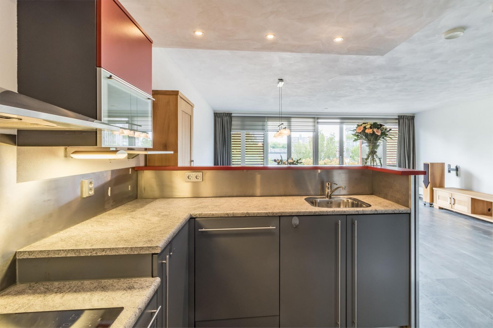 De aan de voorzijde gelegen ruime woonkamer met open keuken is het hart van de woning. De nette keuken is van alle gemakken voorzien, waaronder een 4-pits inductie kookplaat, vaatwasser, koelkast en combi-oven. Grote raampartijen laten veel daglicht binnen en met twee schuiframen haal je eenvoudig het buitenleven de woonkamer binnen.. en geniet je van frisse lucht en een mooi uitzicht!