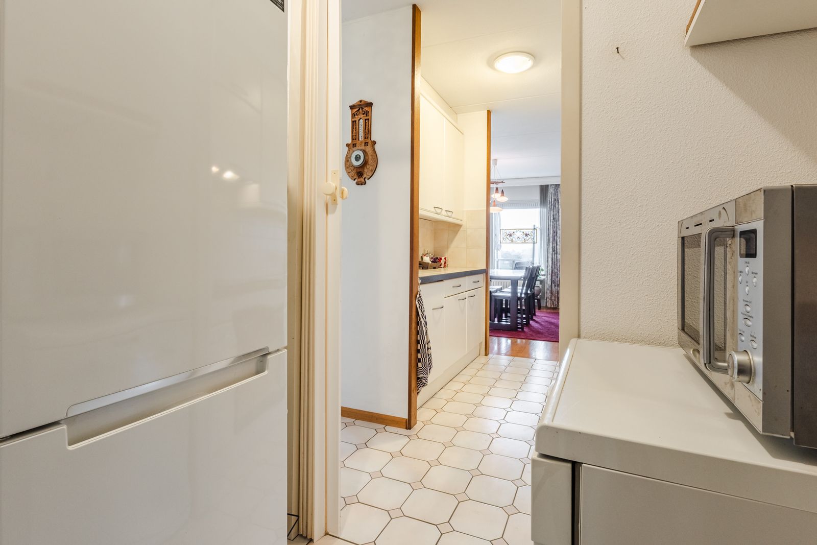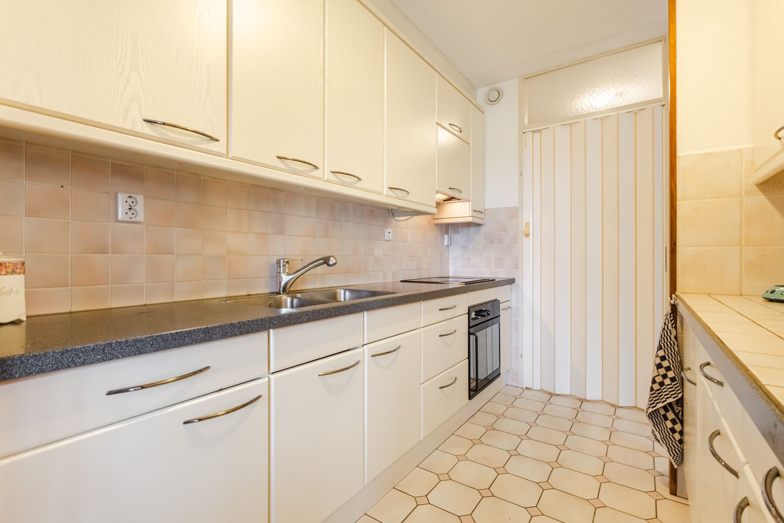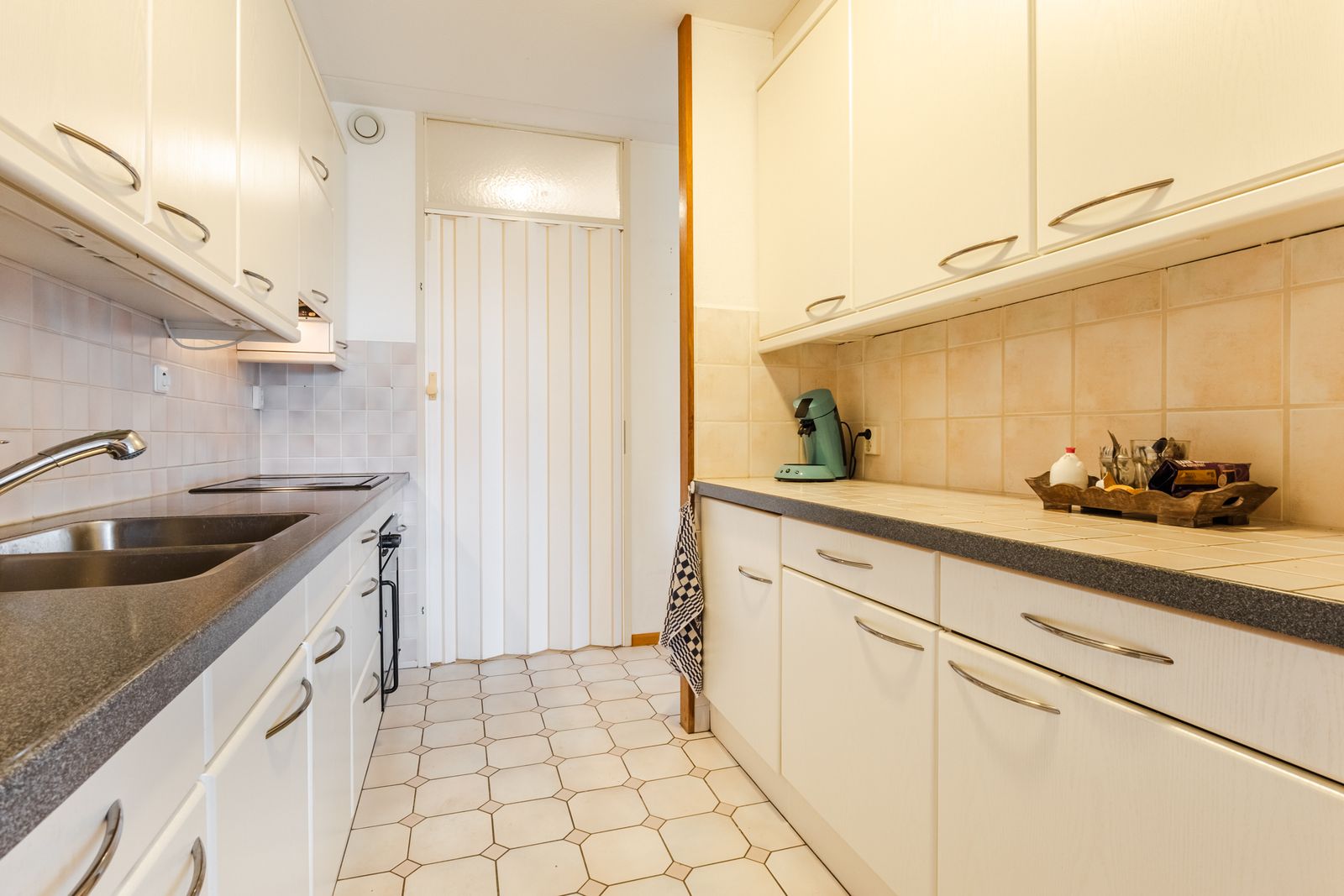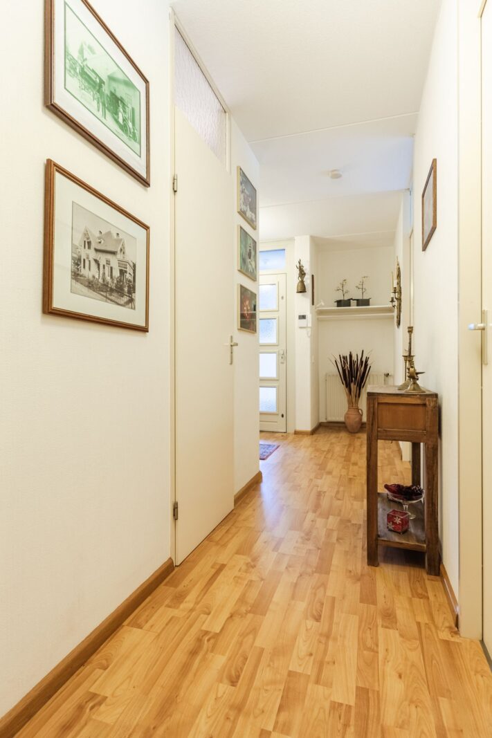De open keuken is voorzien van de nodige inbouwapparatuur en biedt voldoende werk- en opbergruimte. Direct aangrenzend bevindt zich de bijkeuken met een cv-ketel en wasmachine aansluiting, wat extra gemak biedt.