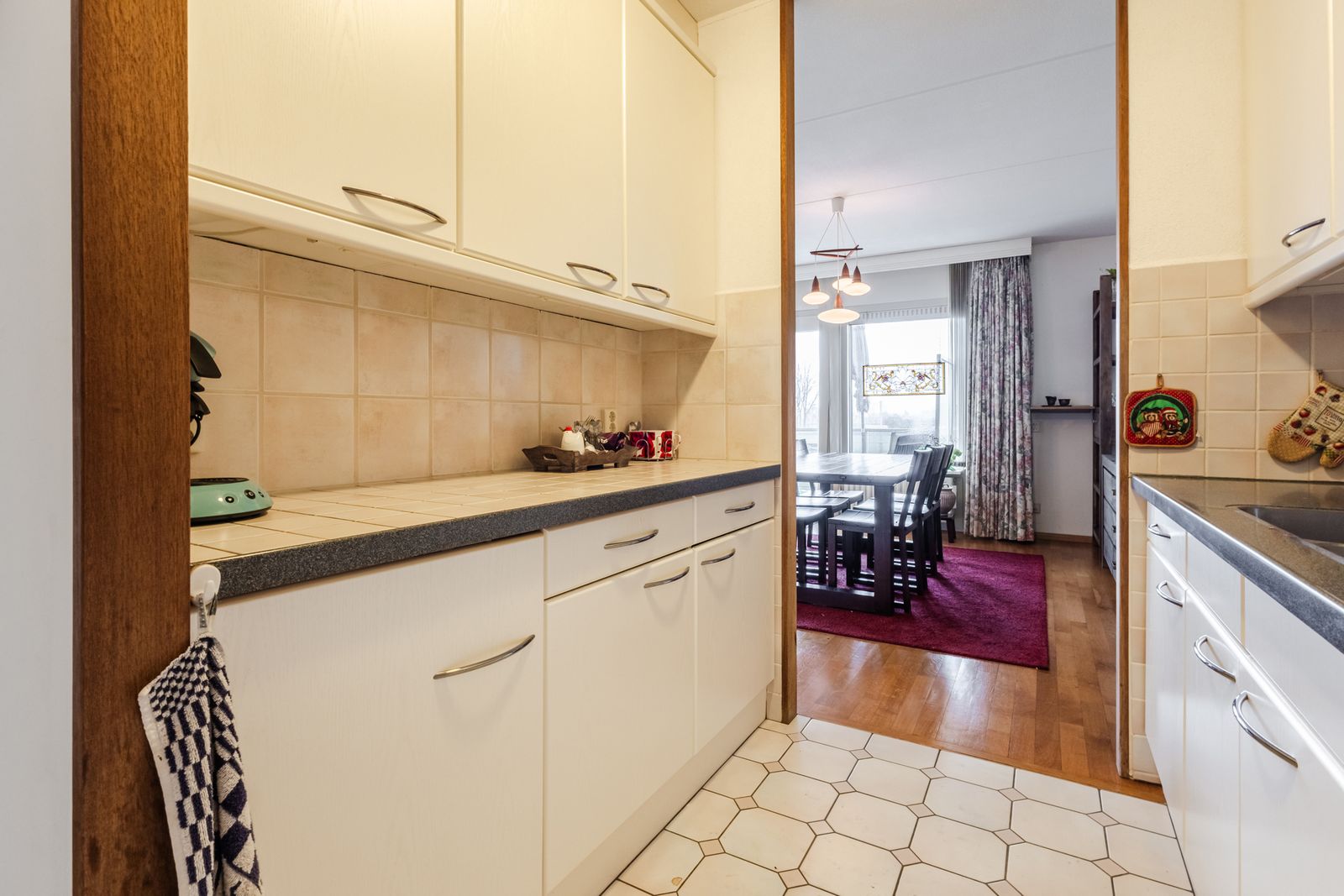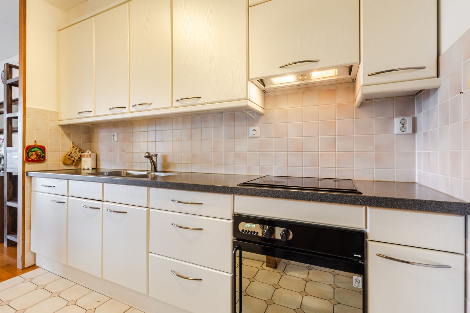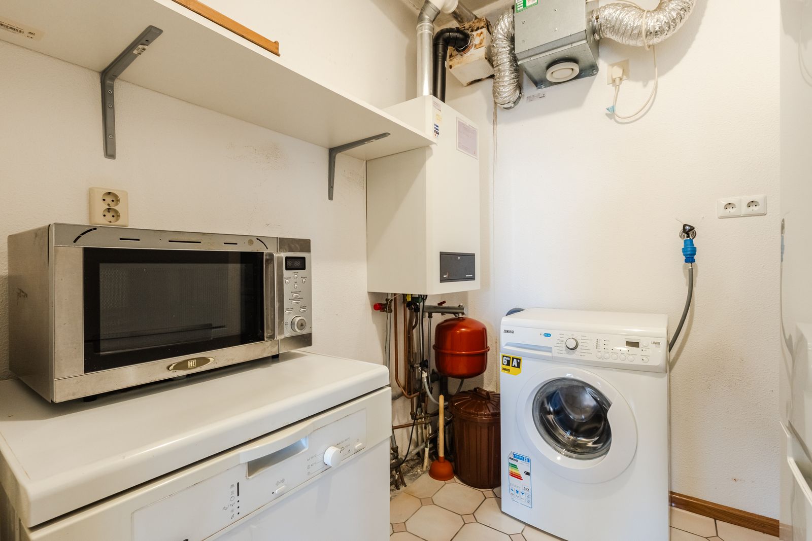 De open keuken is voorzien van de nodige inbouwapparatuur en biedt voldoende werk- en opbergruimte. Direct aangrenzend bevindt zich de bijkeuken met een cv-ketel en wasmachine aansluiting, wat extra gemak biedt.