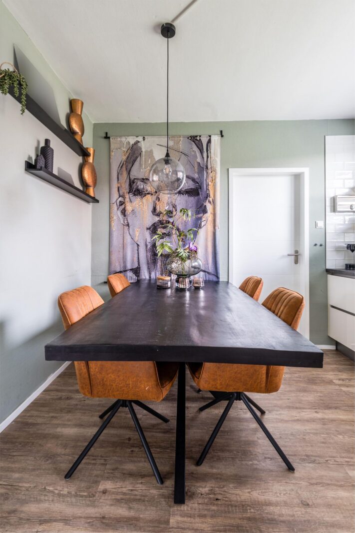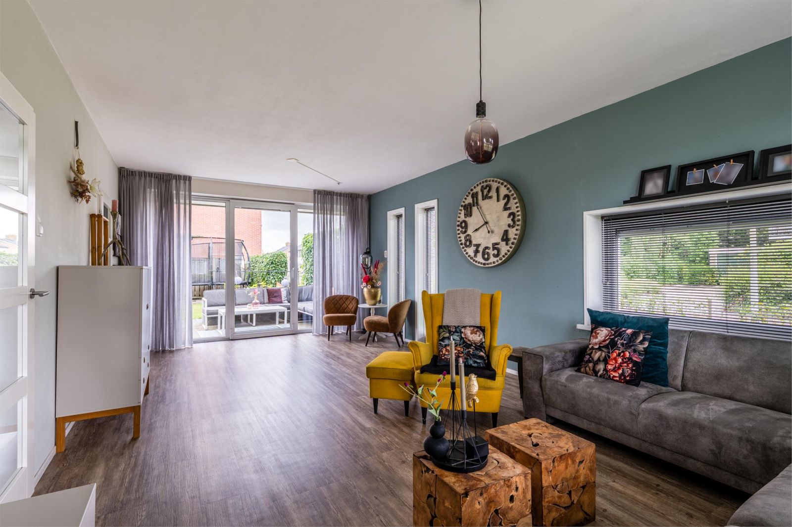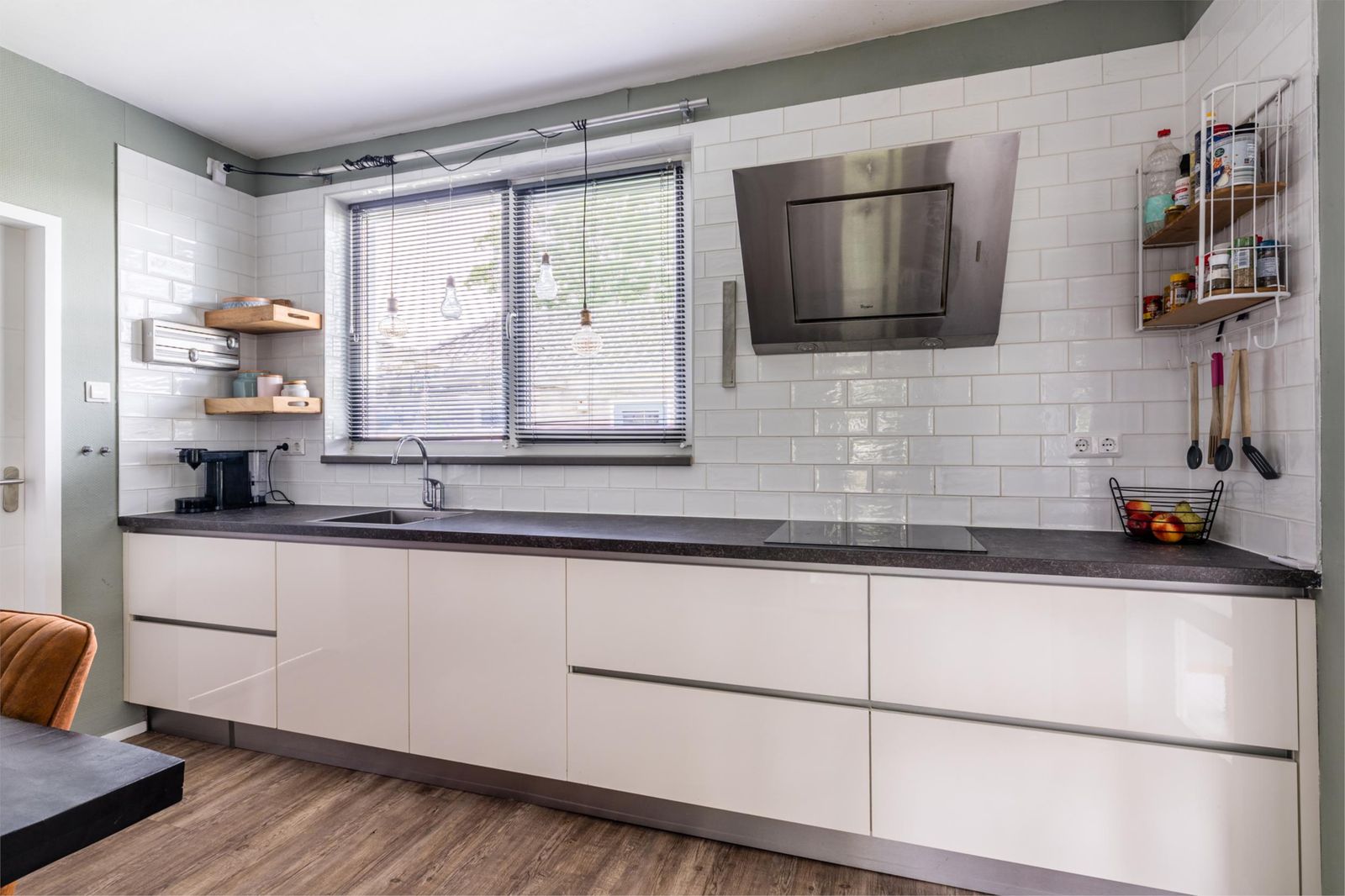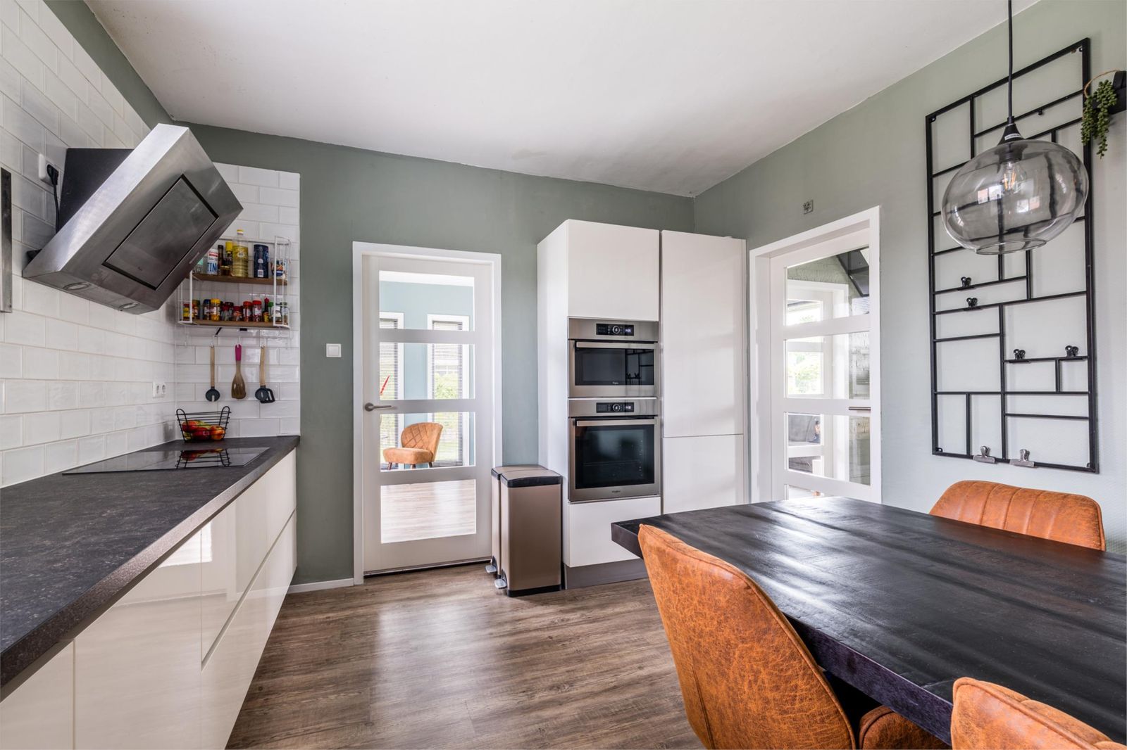 Bij binnenkomst valt direct de ruime en lichte hal op, die recent nog is geschilderd en toegang biedt tot de woonkamer, modern toilet en de trap naar de bovenverdieping. De doorzonwoonkamer is licht en sfeervol, voorzien van een schuifpui naar de achtertuin, en uitgerust met een elektrisch zonnescherm waarvan de doeken recent zijn vervangen. De keuken is afgesloten en biedt alle denkbare inbouwapparatuur, waaronder een inductiekookplaat, afzuigkap, oven, combimagnetron, vaatwasser, koelkast en vriezer.