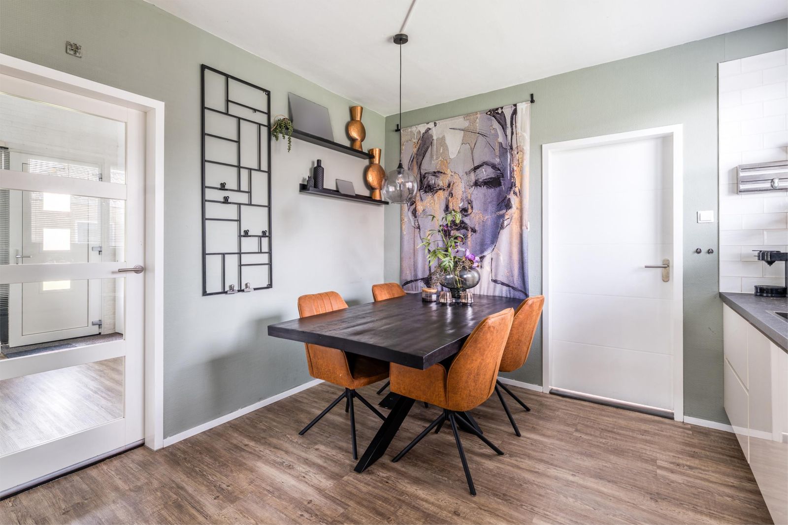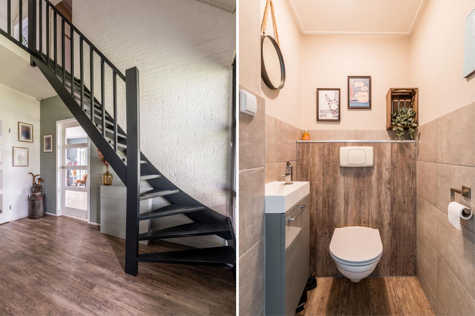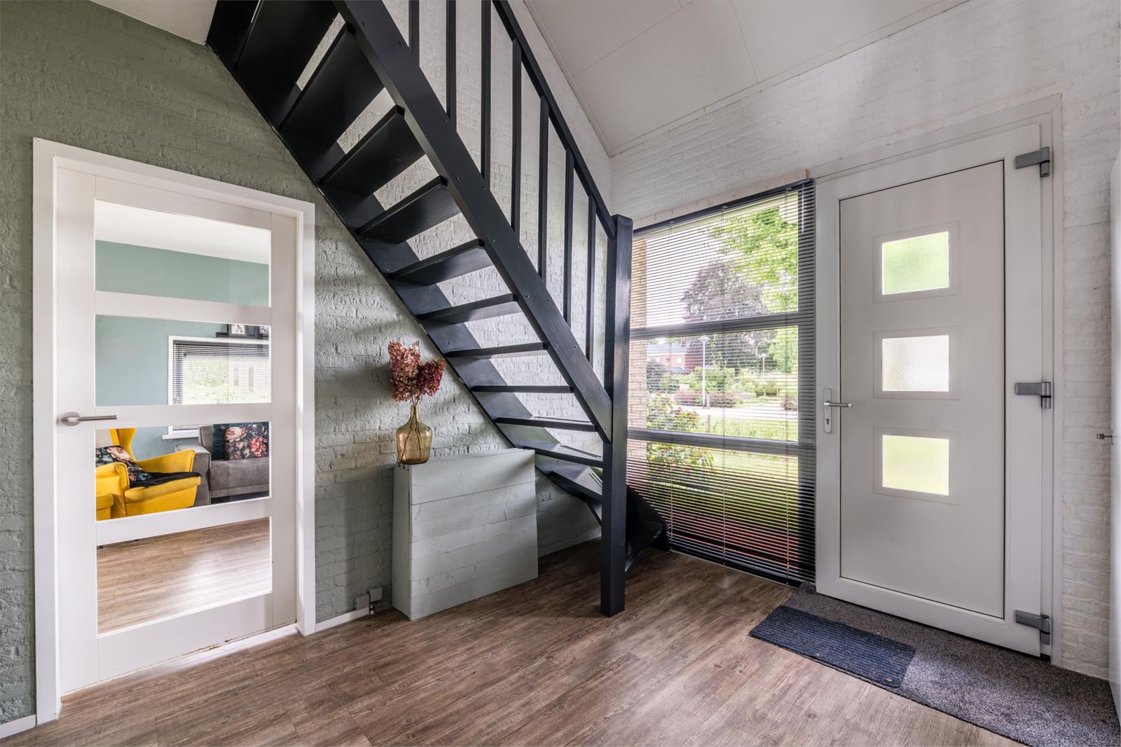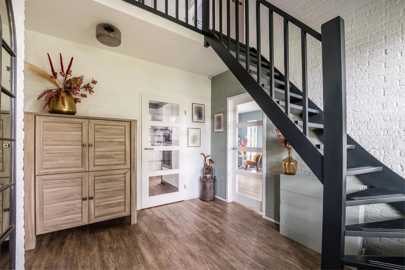 Bij binnenkomst valt direct de ruime en lichte hal op, die recent nog is geschilderd en toegang biedt tot de woonkamer, modern toilet en de trap naar de bovenverdieping. De doorzonwoonkamer is licht en sfeervol, voorzien van een schuifpui naar de achtertuin, en uitgerust met een elektrisch zonnescherm waarvan de doeken recent zijn vervangen. De keuken is afgesloten en biedt alle denkbare inbouwapparatuur, waaronder een inductiekookplaat, afzuigkap, oven, combimagnetron, vaatwasser, koelkast en vriezer.