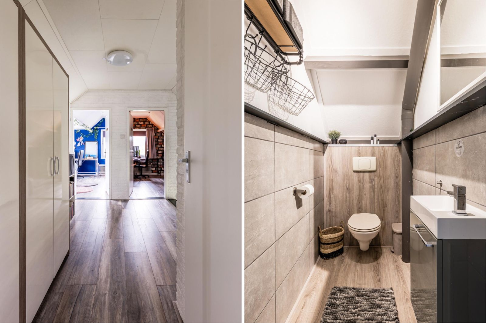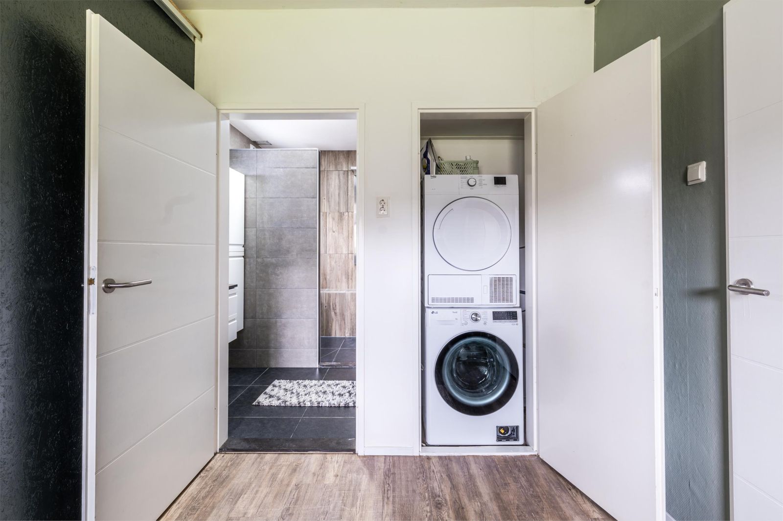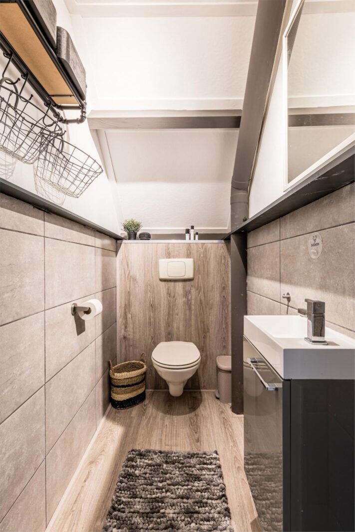Aan de achterzijde van de woning bevindt zich een royale slaap- of werkkamer met een moderne badkamer ensuite. Deze badkamer is voorzien van een ruime inloopdouche met dubbele douchepaneel, een wastafelmeubel met bijpassende handdoekenkast en extra opbergruimte. Ook is er op de begane grond een aparte wasruimte aanwezig met plek voor zowel wasmachine als droger. Via de achterom komt u in een tweede hal met praktische inbouwkast, ideaal voor extra bergruimte.