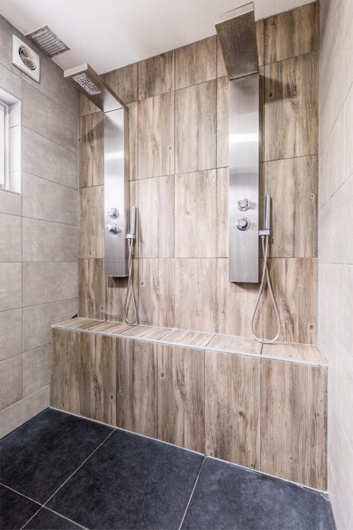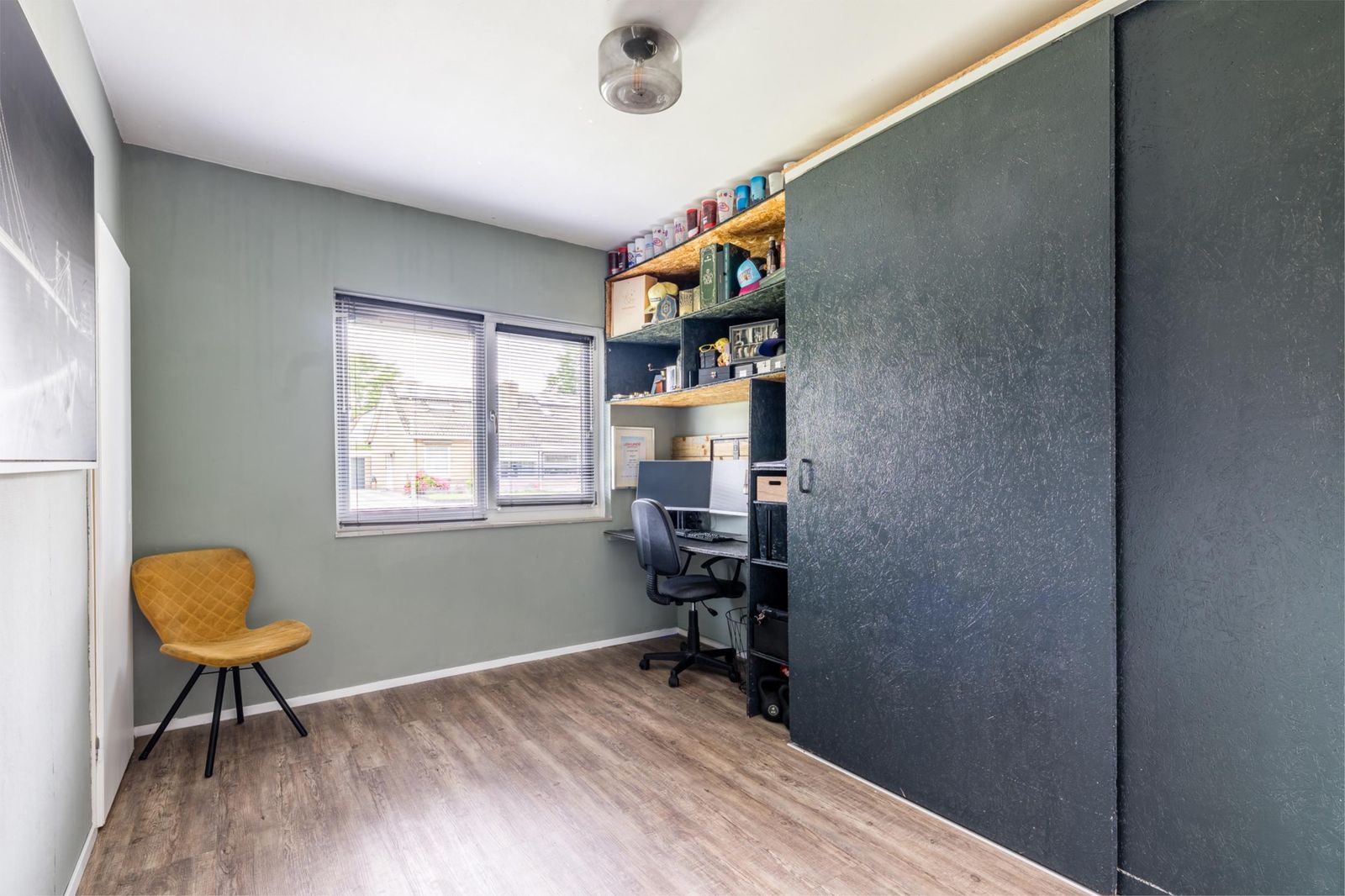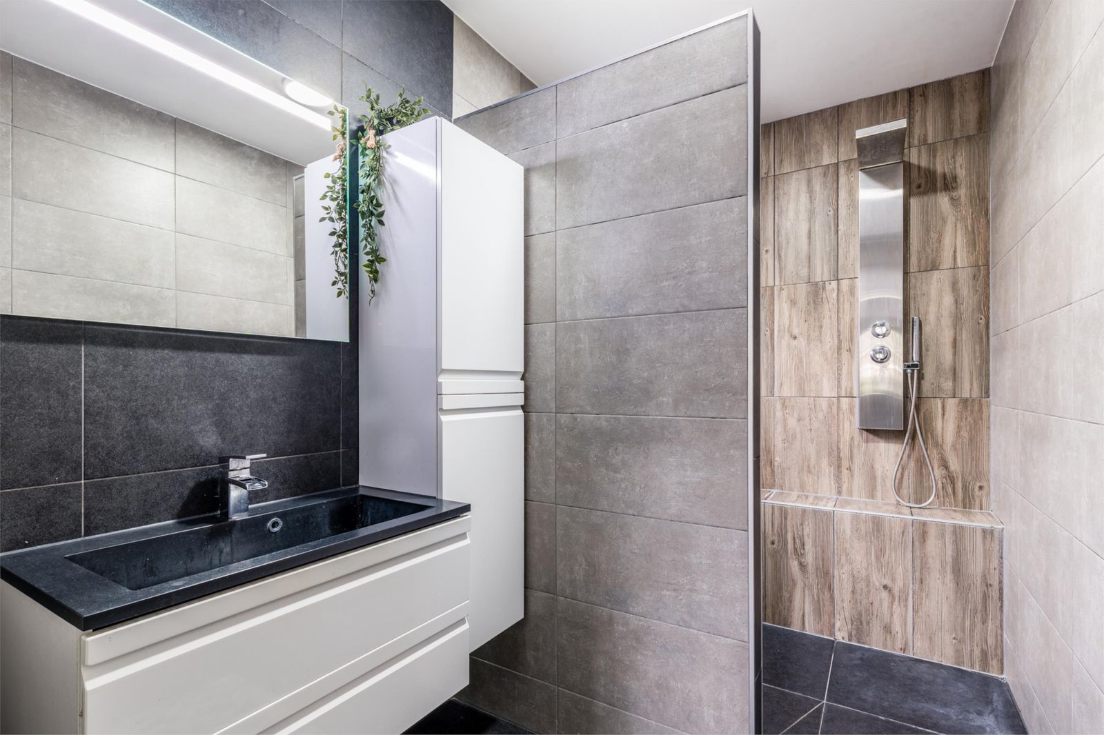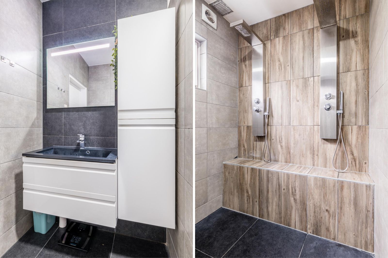 Aan de achterzijde van de woning bevindt zich een royale slaap- of werkkamer met een moderne badkamer ensuite. Deze badkamer is voorzien van een ruime inloopdouche met dubbele douchepaneel, een wastafelmeubel met bijpassende handdoekenkast en extra opbergruimte. Ook is er op de begane grond een aparte wasruimte aanwezig met plek voor zowel wasmachine als droger. Via de achterom komt u in een tweede hal met praktische inbouwkast, ideaal voor extra bergruimte.