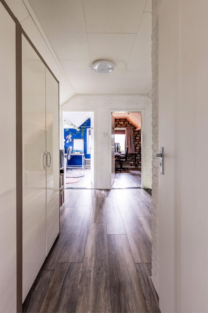 Op de eerste verdieping vindt u een ruime overloop, een tweede toilet met fontein en drie ruime slaapkamers. De slaapkamers en de overloop zijn recentelijk voorzien van een nieuwe laminaatvloer. Twee slaapkamers zijn voorzien van een dakkapel en extra bergruimte onder het schuine dak, wat zorgt voor zowel lichtinval als praktische opbergmogelijkheden. De andere slaapkamer is royaal en heeft ook extra opbergmogelijkheden. Tevens is er een zolder voor extra opbergruimte.