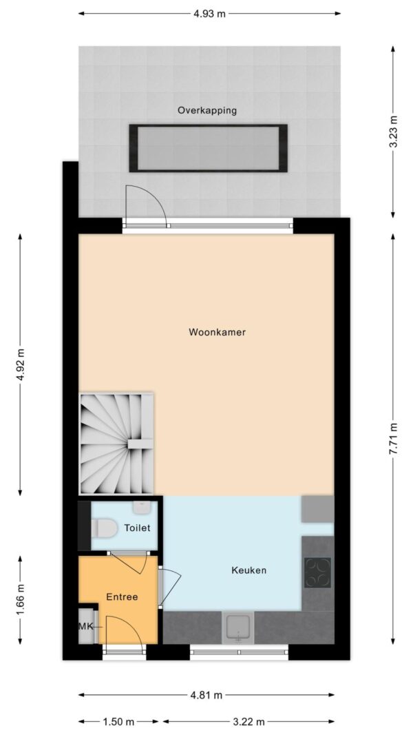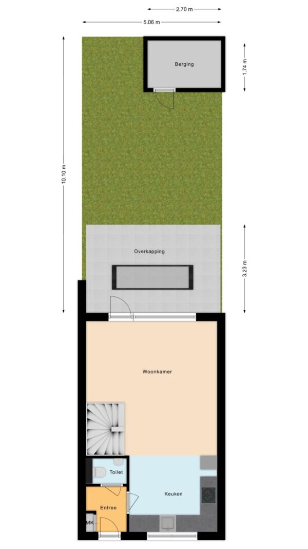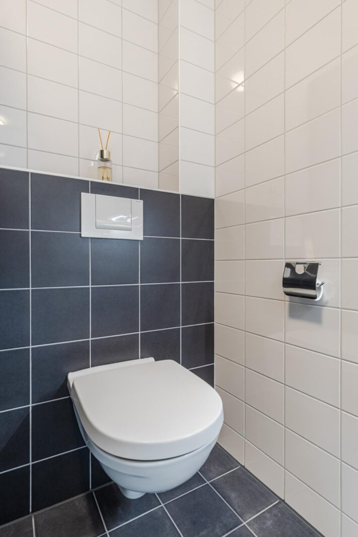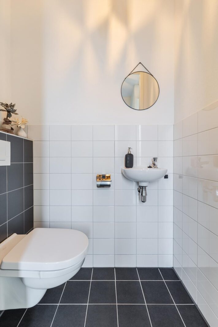 Upon entering through the front door, you'll first find yourself in a neat entrance hall. Here you'll find the meter cupboard and the access door to a separate toilet room, which is equipped with a wall-hung toilet and a small sink.