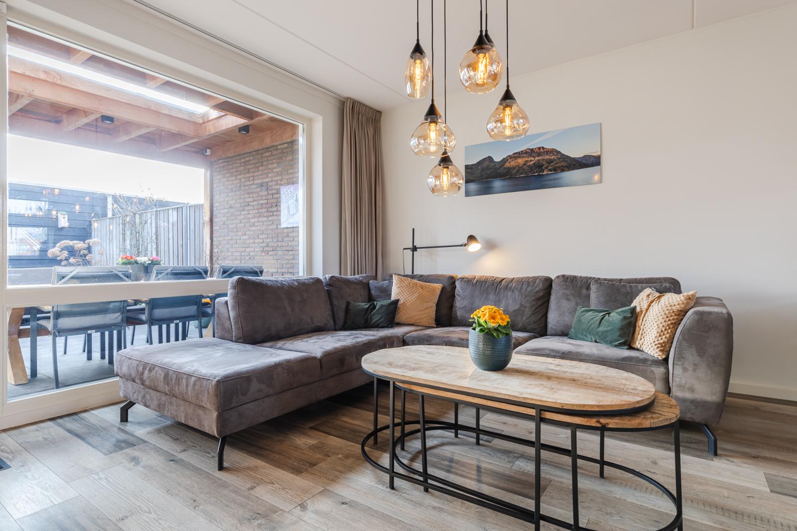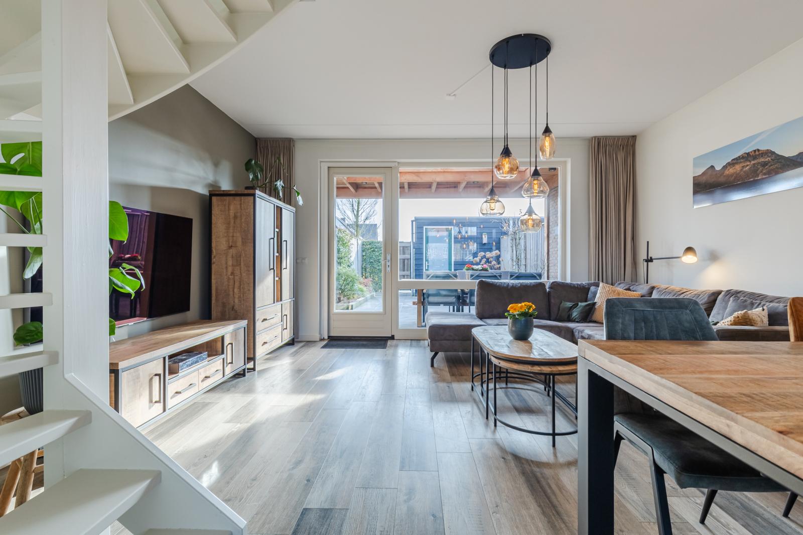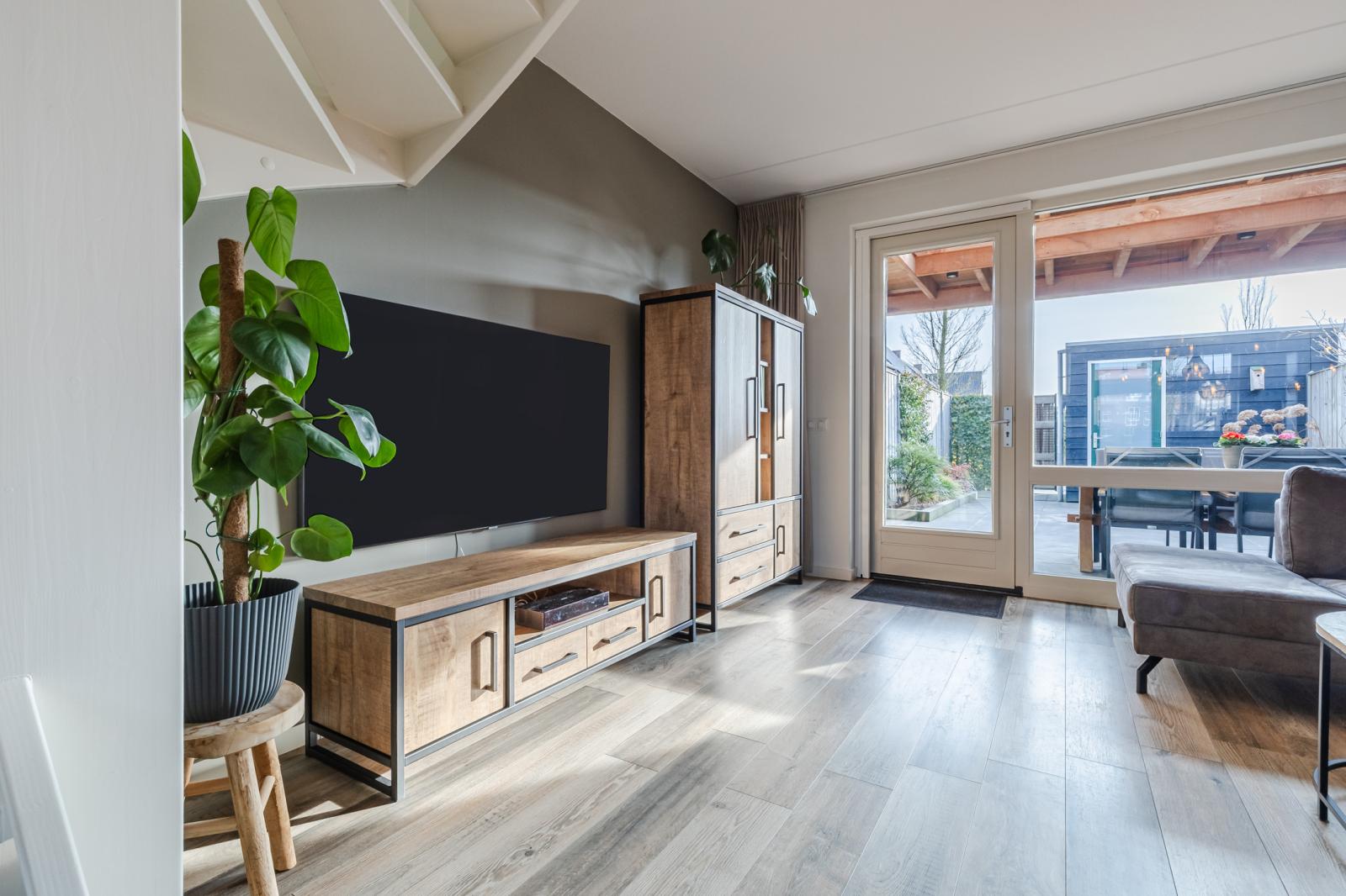 Richting de achterkant van de begane grond vind je de sfeervolle woonkamer die dit huis rijk is. Deze ruime living biedt met zijn grote ramen uitzicht over de eigen achtertuin. De ramen zijn op het zuiden, dus je profiteert binnen van volop inval van zonlicht.