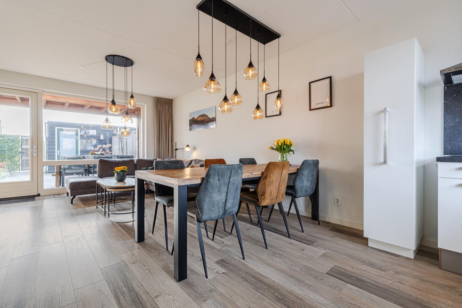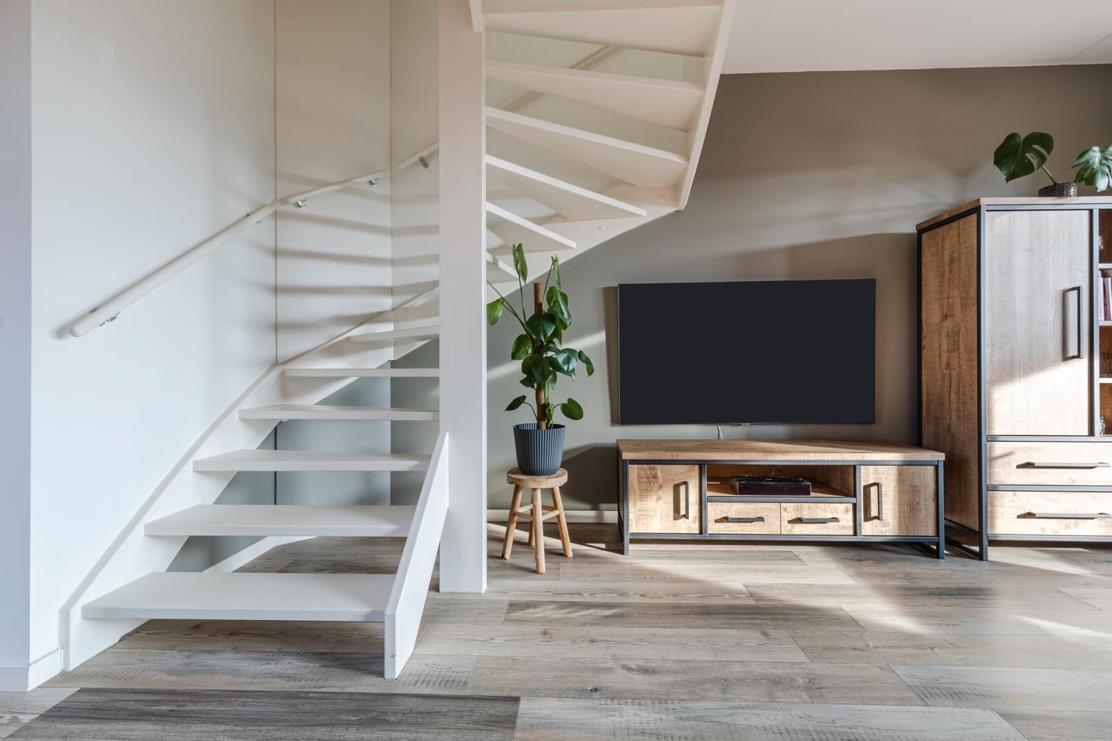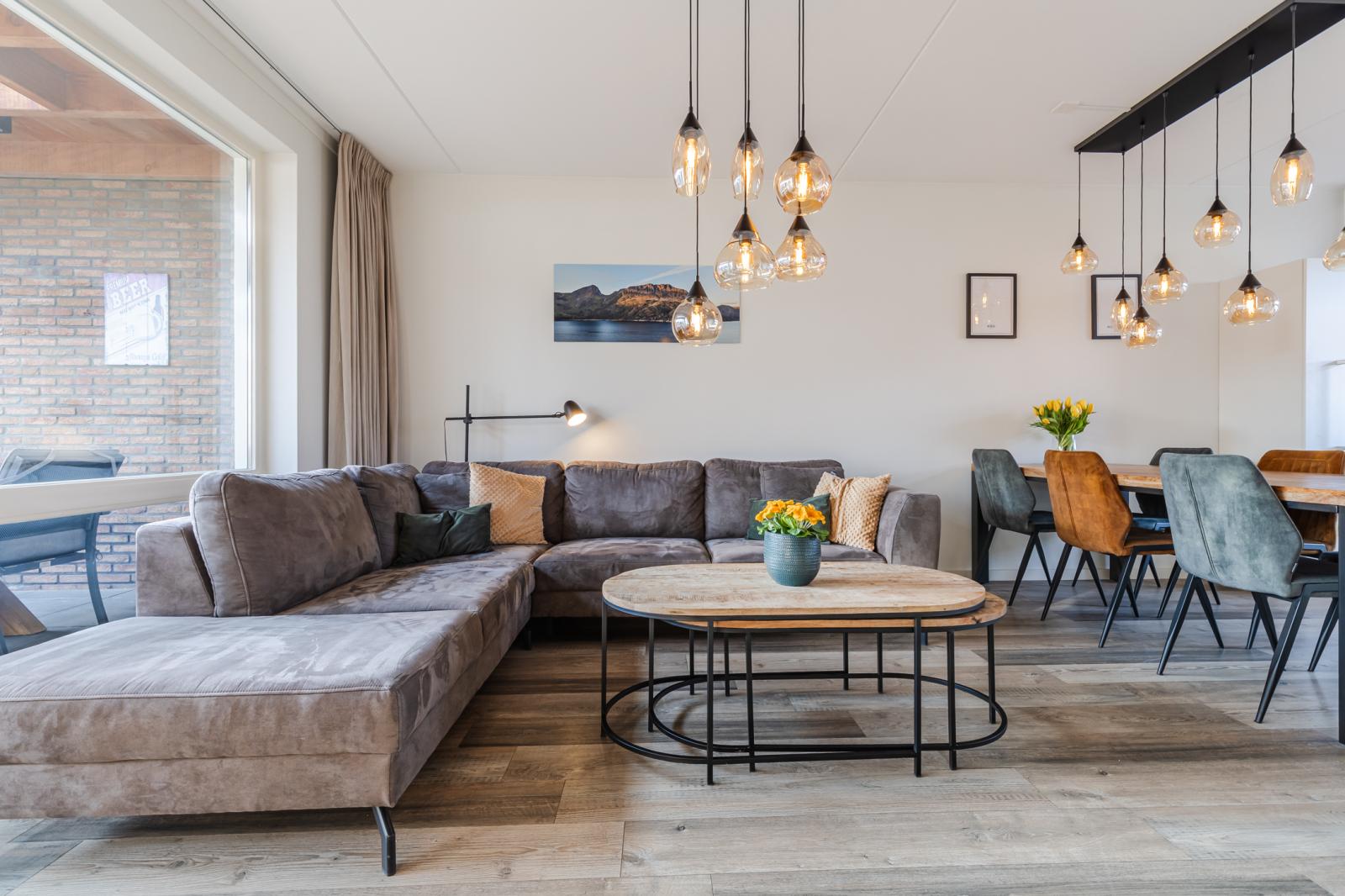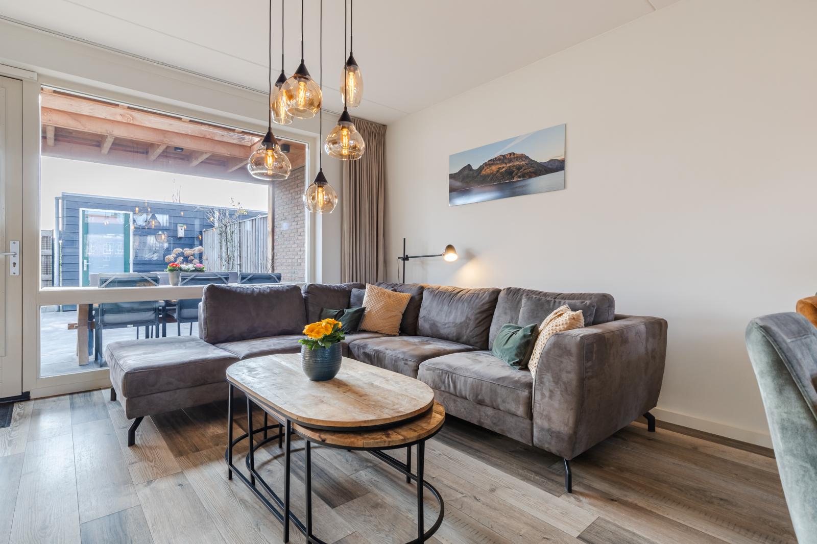 Richting de achterkant van de begane grond vind je de sfeervolle woonkamer die dit huis rijk is. Deze ruime living biedt met zijn grote ramen uitzicht over de eigen achtertuin. De ramen zijn op het zuiden, dus je profiteert binnen van volop inval van zonlicht.