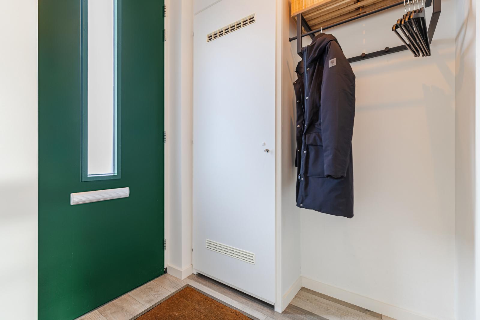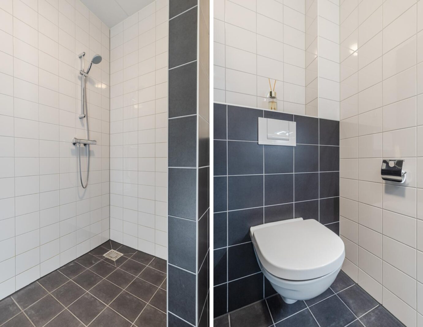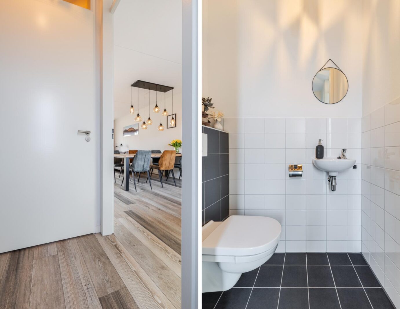 Na binnenkomst via de voordeur kom je eerst terecht in een keurige entree. Hier vind je onder andere de meterkast en de toegangsdeur tot een aparte toiletruimte, die is uitgerust met een vrij hangend closet en een fonteintje.
