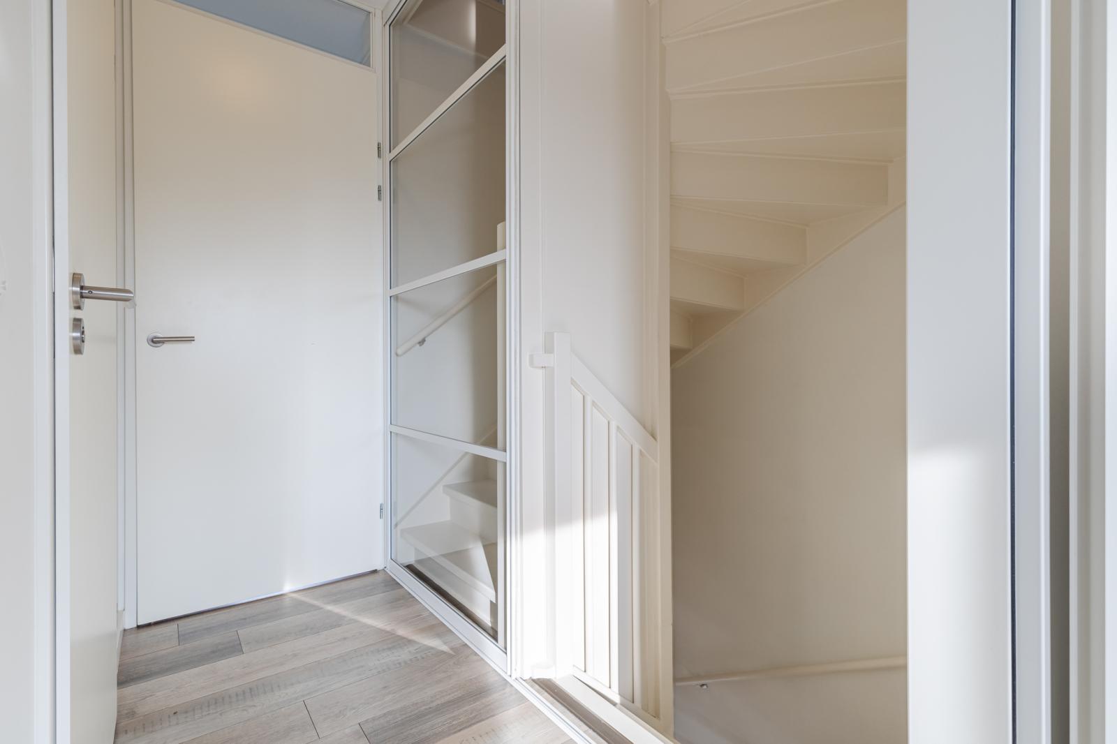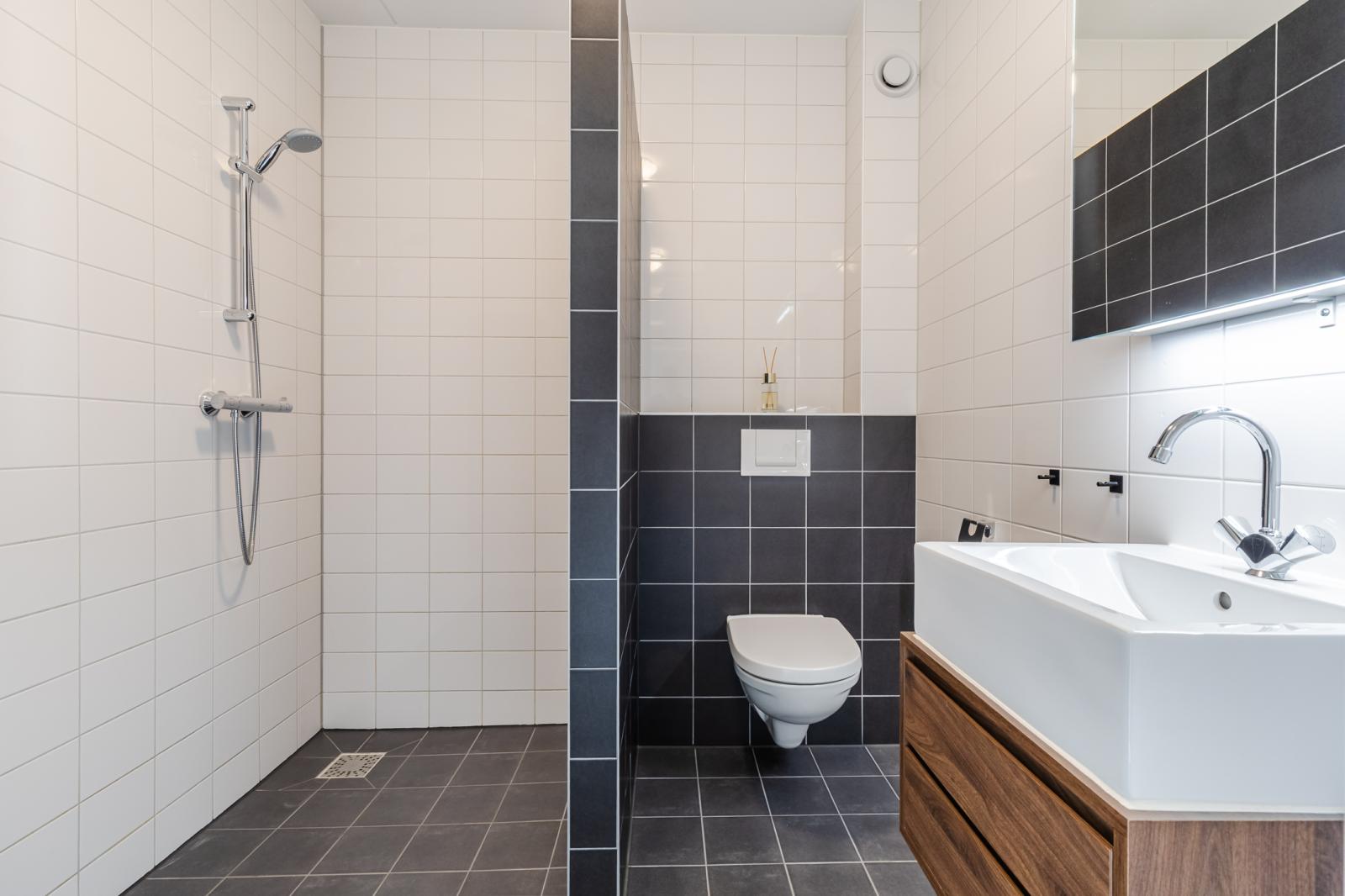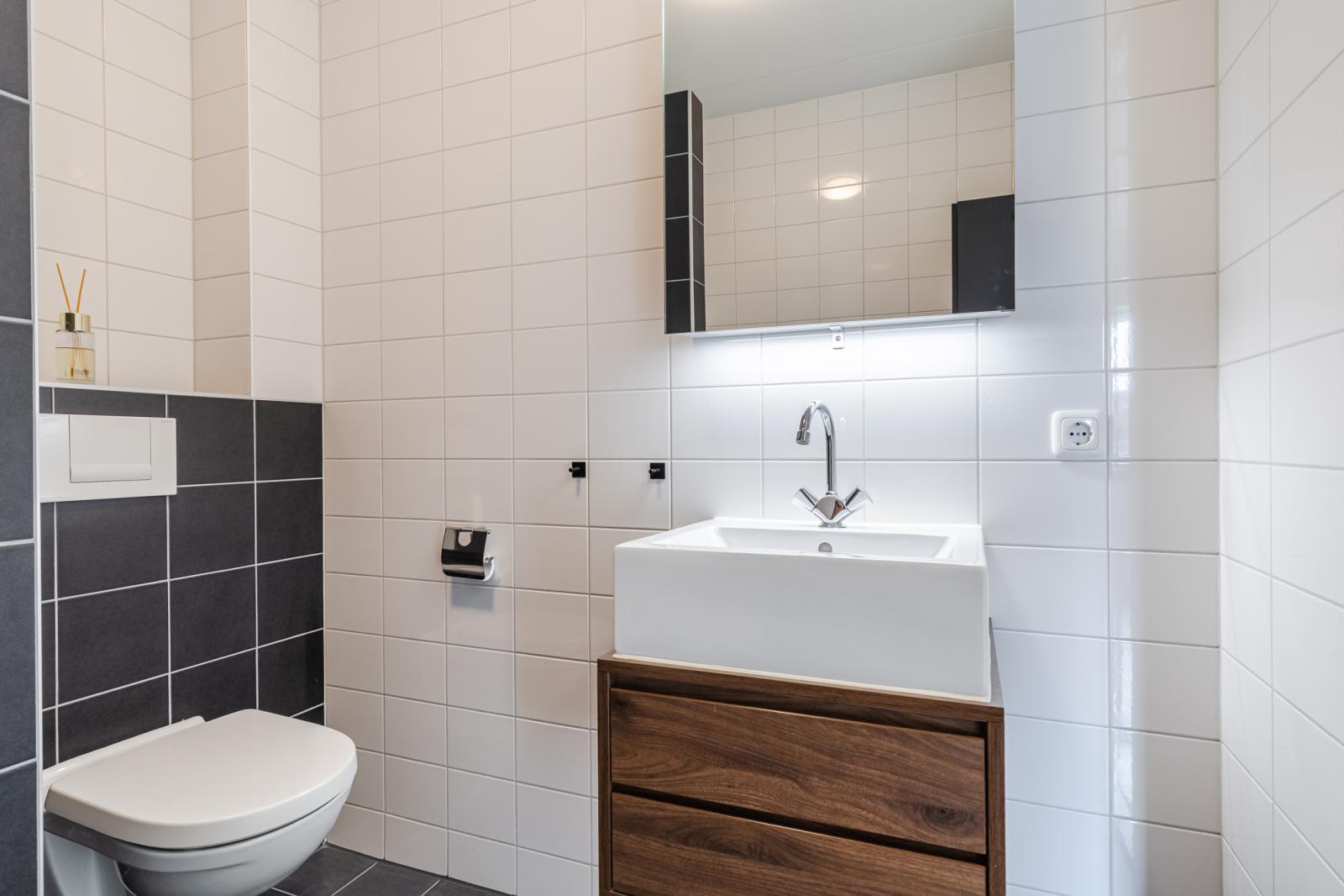Na binnenkomst via de voordeur kom je eerst terecht in een keurige entree. Hier vind je onder andere de meterkast en de toegangsdeur tot een aparte toiletruimte, die is uitgerust met een vrij hangend closet en een fonteintje.