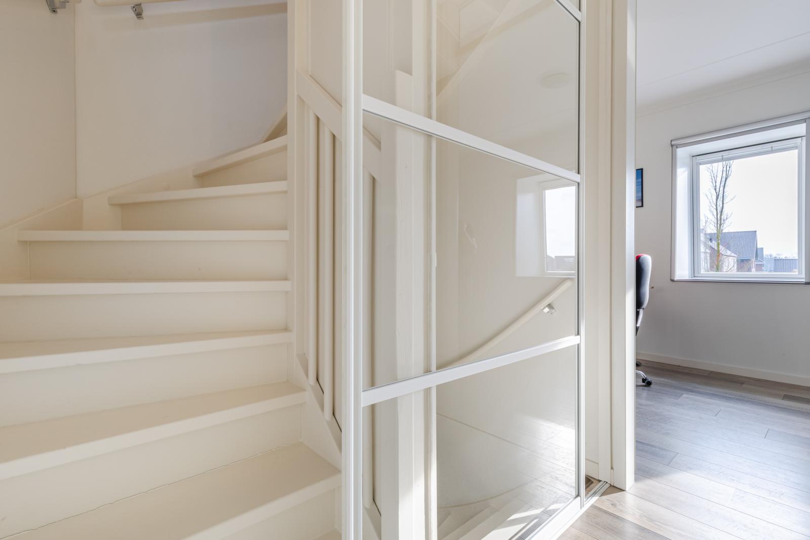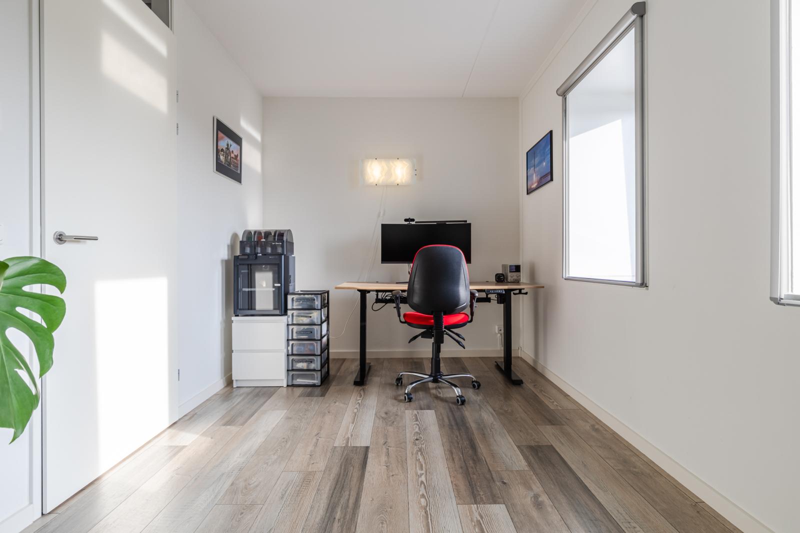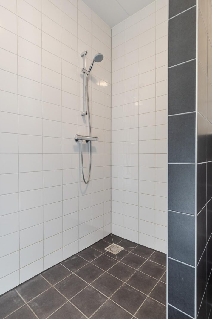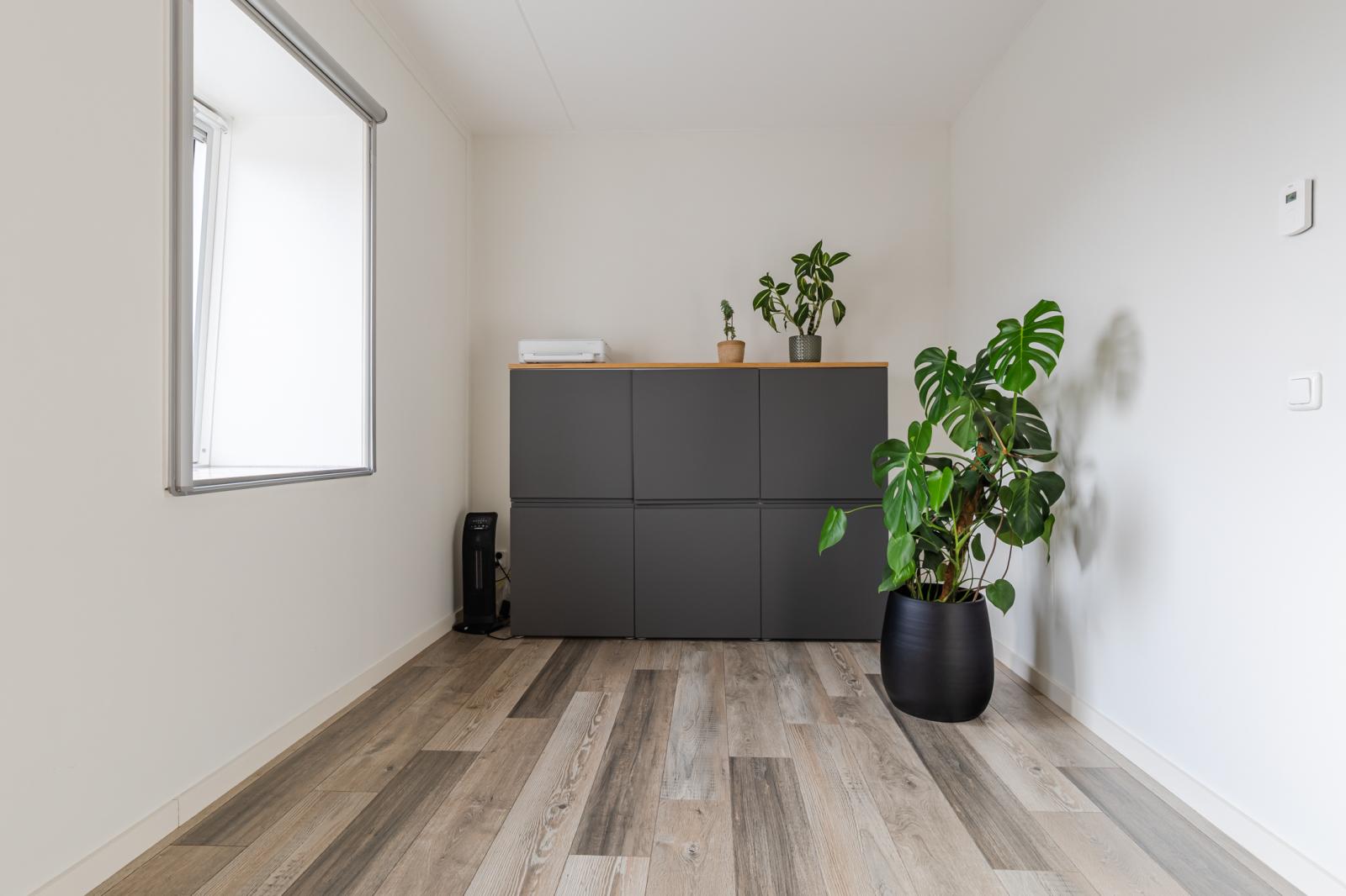 In de hoek van de woonkamer zit de vaste trap naar boven. Deze leidt tot aan een centrale overloop, waarvandaan alle vertrekken van de eerste verdieping bereikbaar zijn. Daaronder vallen twee ruime slaapkamers. Deze bestrijken allebei de hele breedte van het huis en zijn, net als de overloop, voorzien van een mooie laminaatvloer. In de kamer aan de voorkant kan bovendien opnieuw een vaste, op maat gemaakte kastenwand gerealiseerd worden. Verder vind je op de tussenverdieping een moderne badkamer, die volledig is betegeld. Hier maak je gebruik van een zwevend toilet, een fraai wastafelmeubel en een heerlijke, drempelvrije inloopdouche.