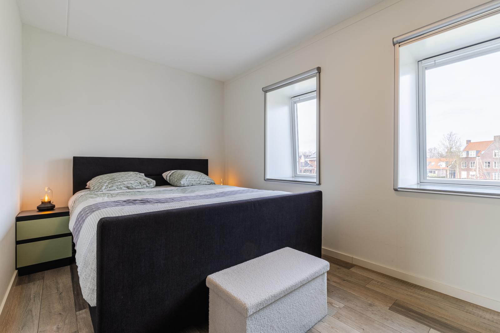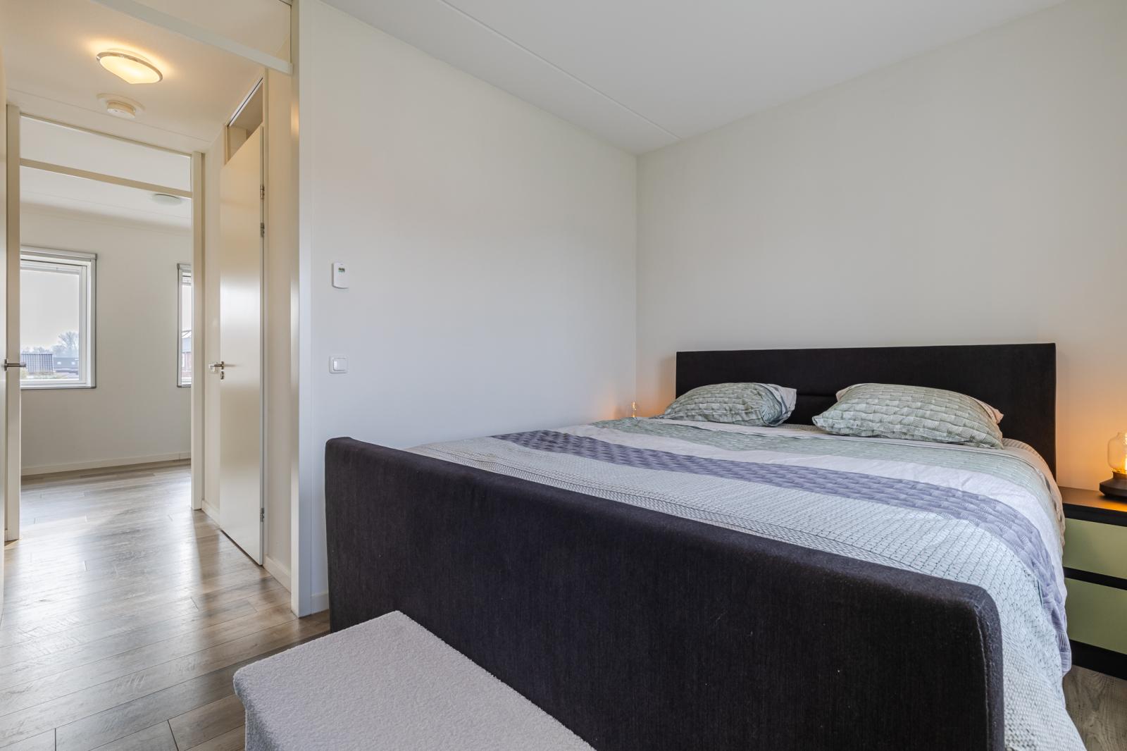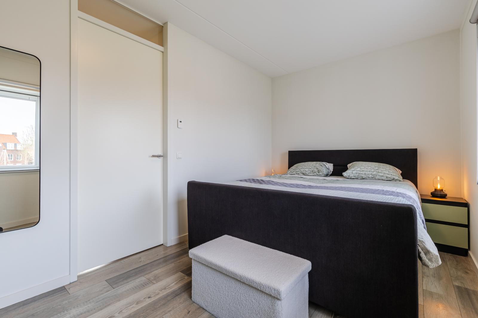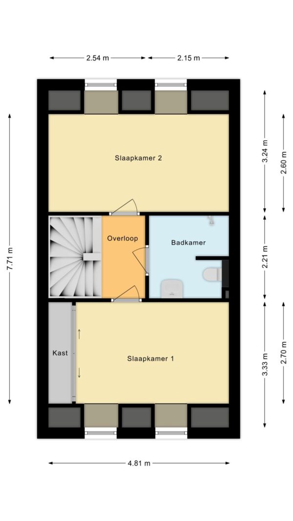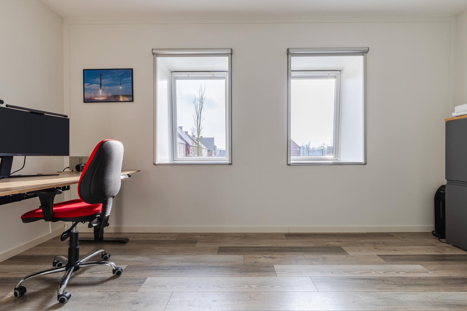 In de hoek van de woonkamer zit de vaste trap naar boven. Deze leidt tot aan een centrale overloop, waarvandaan alle vertrekken van de eerste verdieping bereikbaar zijn. Daaronder vallen twee ruime slaapkamers. Deze bestrijken allebei de hele breedte van het huis en zijn, net als de overloop, voorzien van een mooie laminaatvloer. In de kamer aan de voorkant kan bovendien opnieuw een vaste, op maat gemaakte kastenwand gerealiseerd worden. Verder vind je op de tussenverdieping een moderne badkamer, die volledig is betegeld. Hier maak je gebruik van een zwevend toilet, een fraai wastafelmeubel en een heerlijke, drempelvrije inloopdouche.