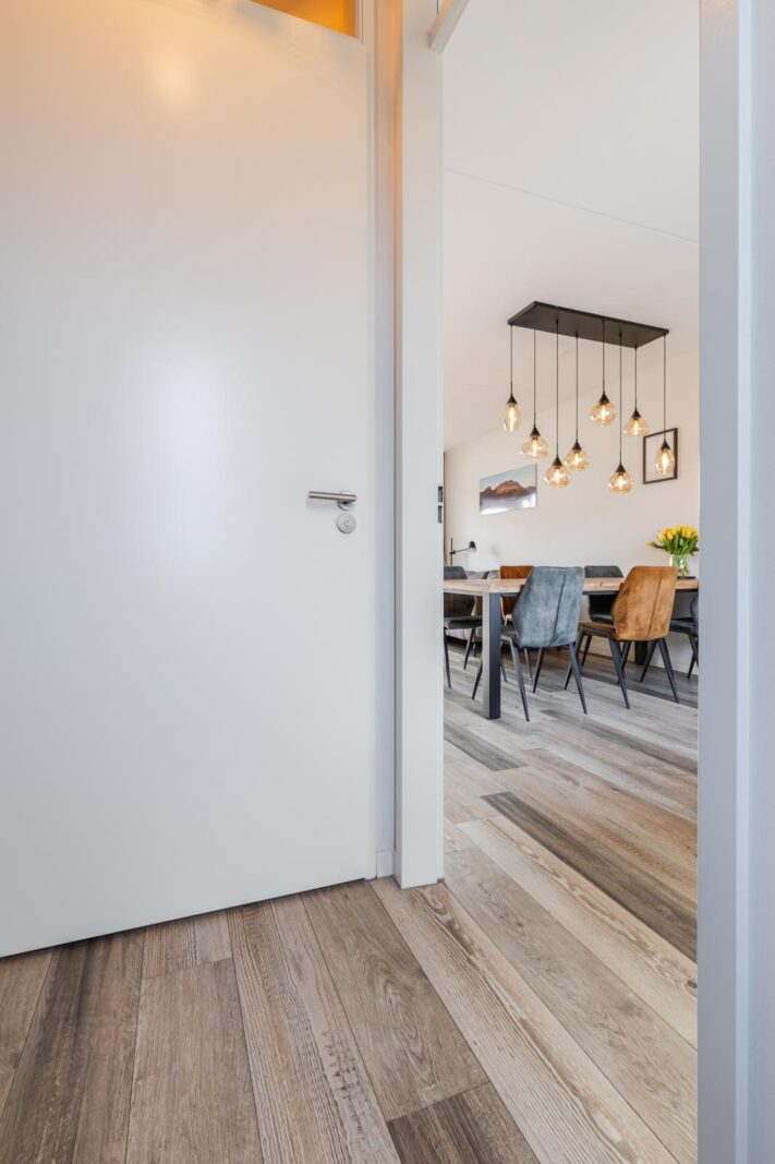 Did you also notice the beautiful laminate flooring in the entrance? It extends seamlessly into the living area. And even better: you can enjoy the comfort of underfloor heating throughout the entire ground floor. When you enter the living area, you first find yourself in the kitchen, located at the front of the house. This neat kitchen, with its white cabinet fronts, has an efficient corner layout. The built-in appliances are from high-quality brands like Etna and Siemens, including a dishwasher, combination microwave, induction cooktop, and refrigerator with freezer compartment.