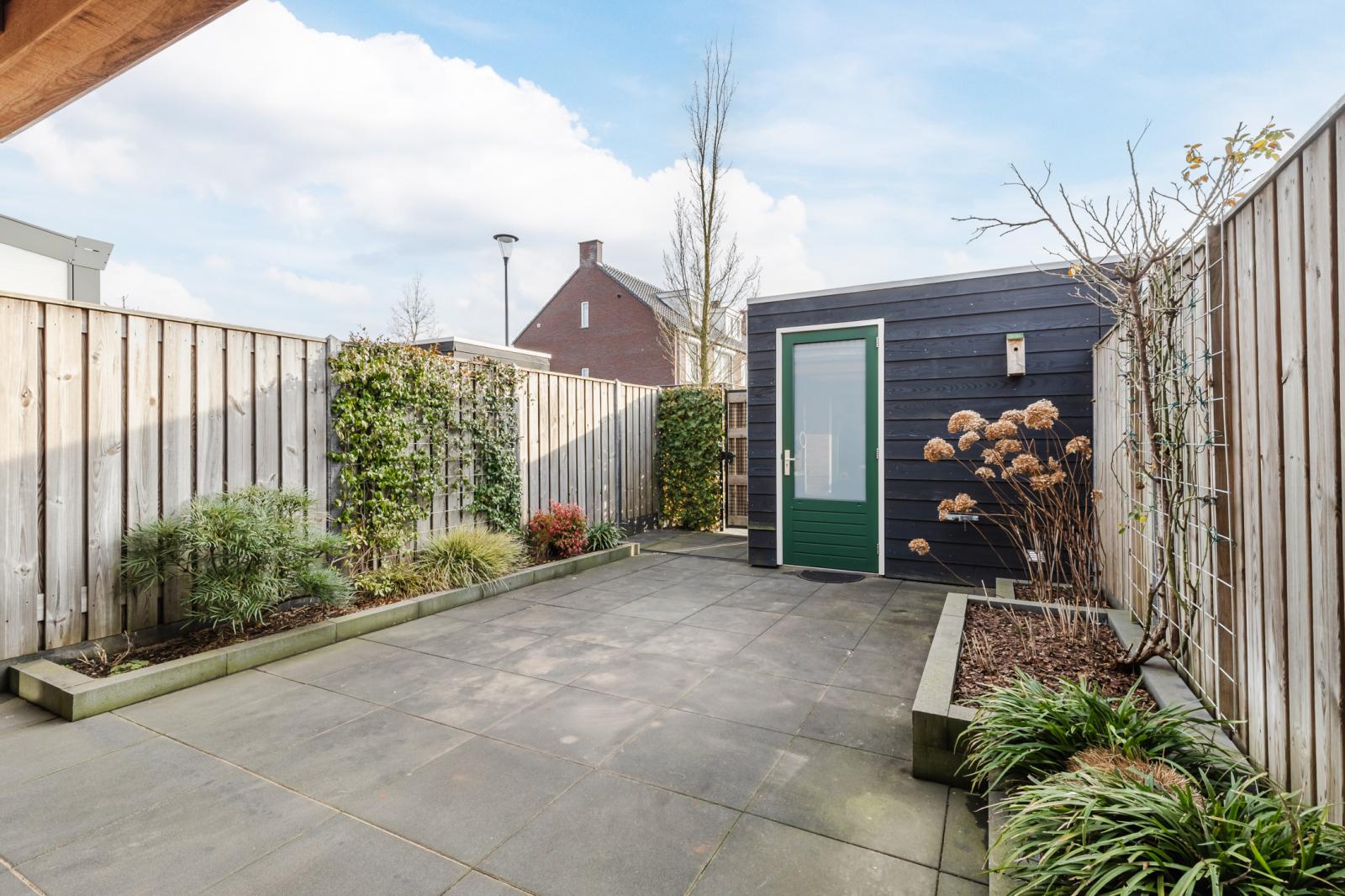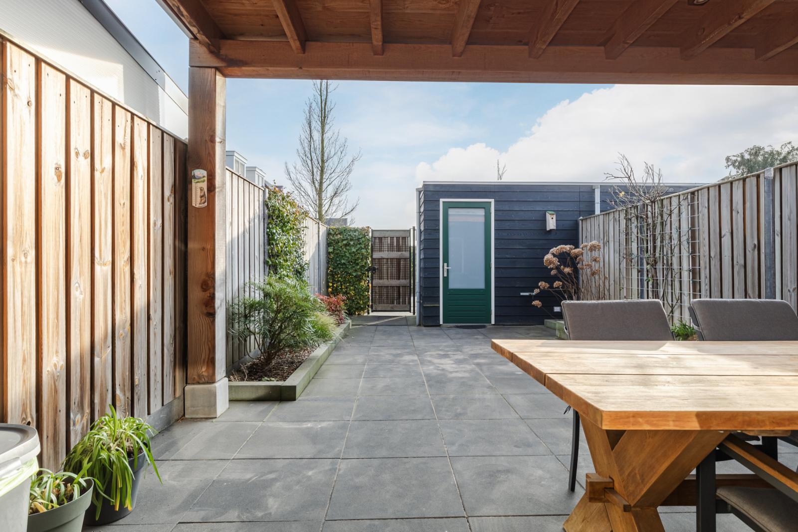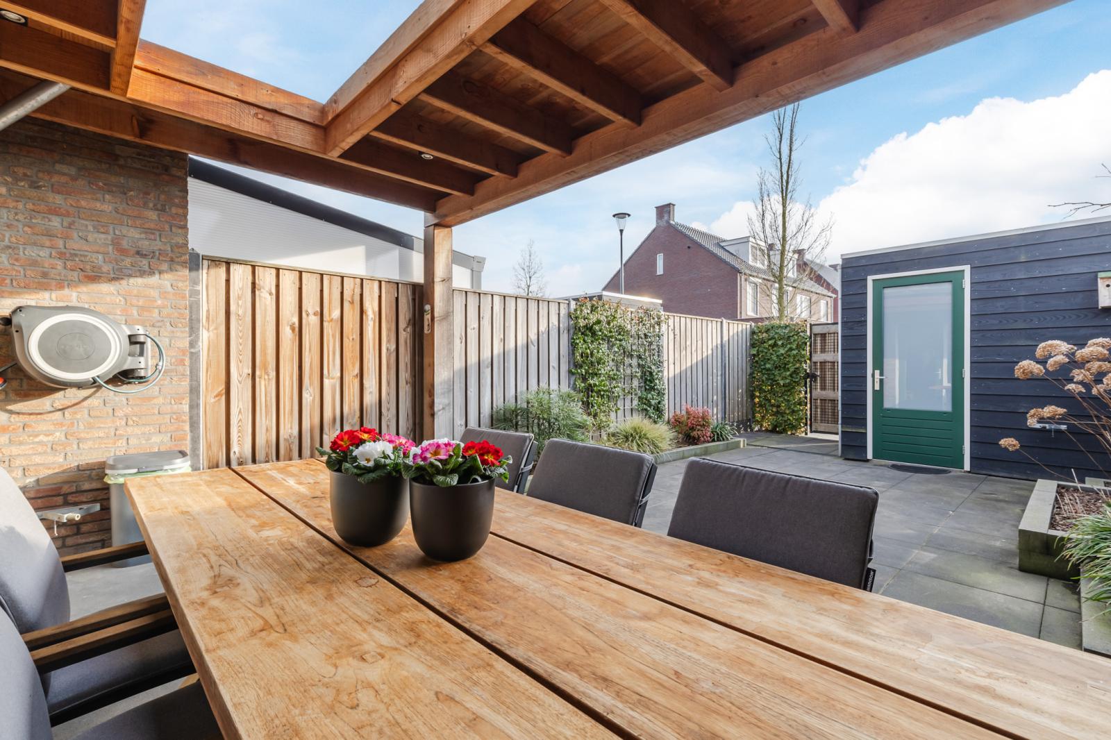 -Fraai aangelegde achtertuin op het zuiden. Met prachtige overkapping, vrijstaande berging en achterom.