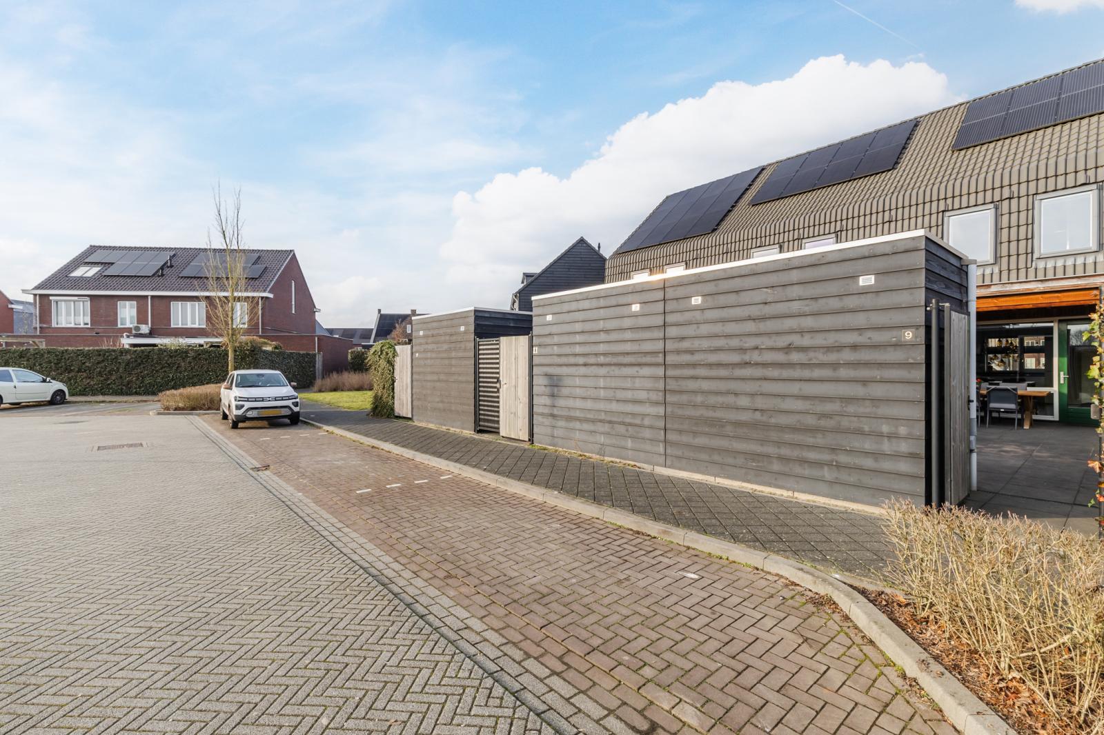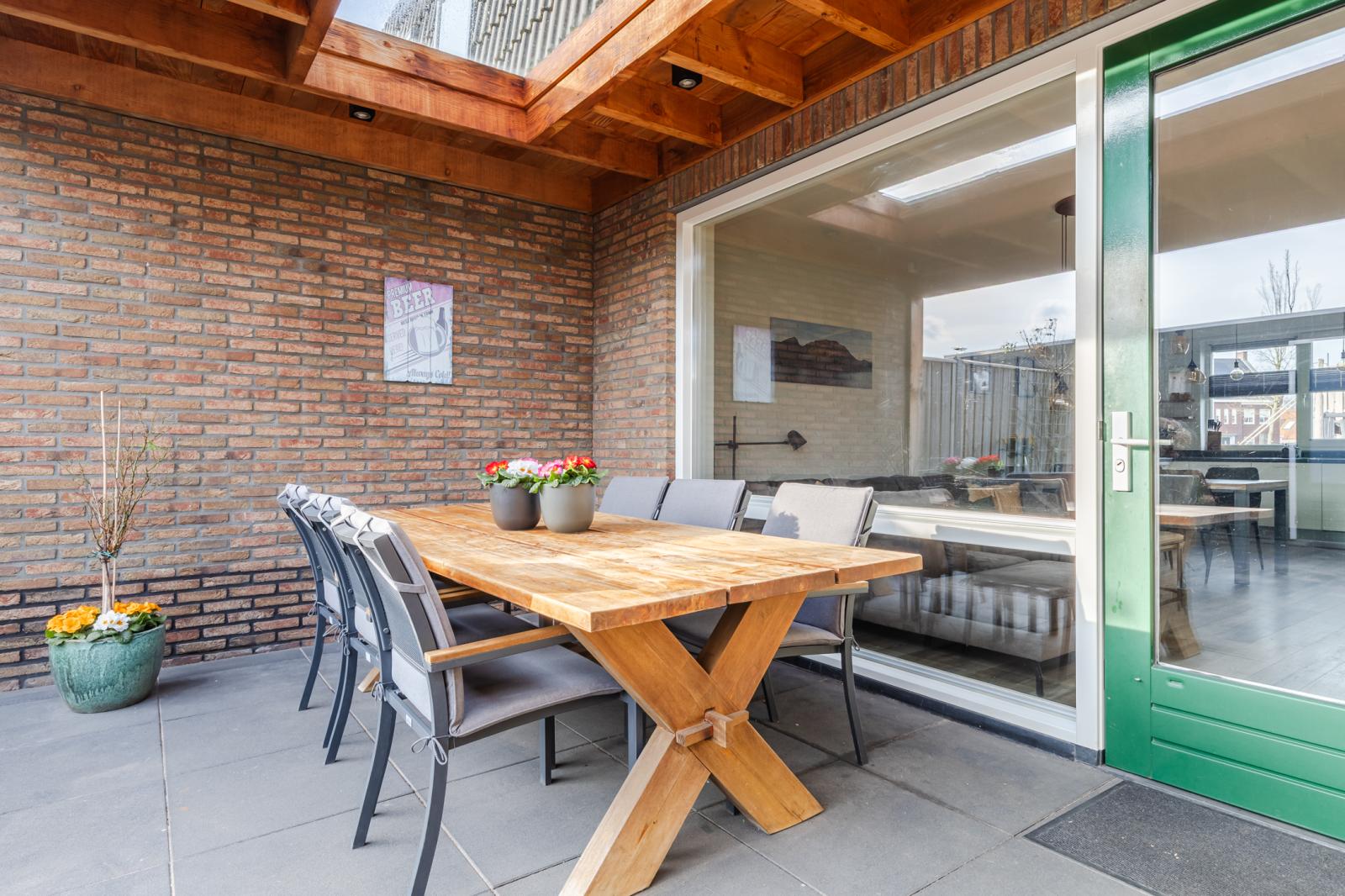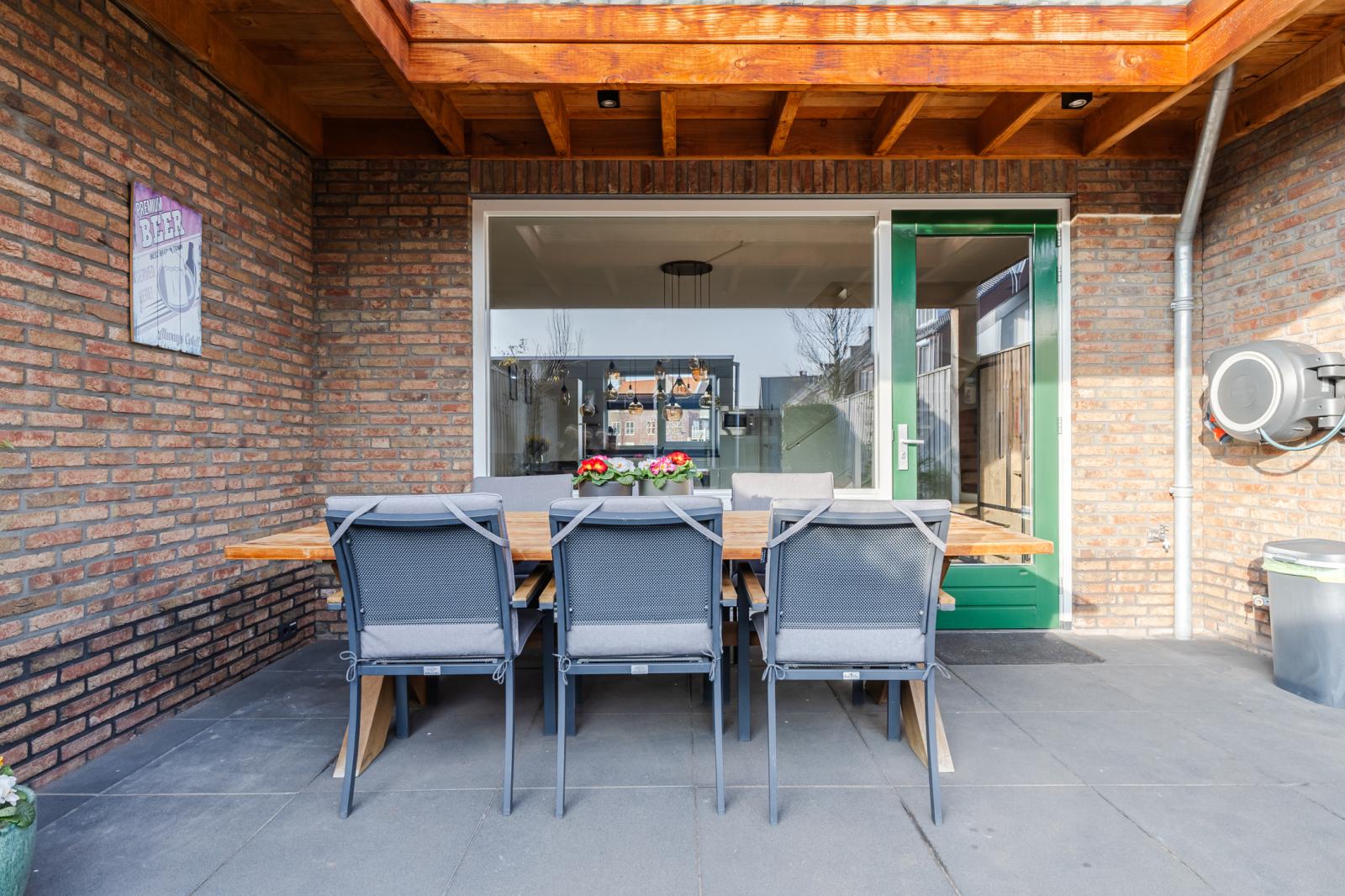 -Fraai aangelegde achtertuin op het zuiden. Met prachtige overkapping, vrijstaande berging en achterom.