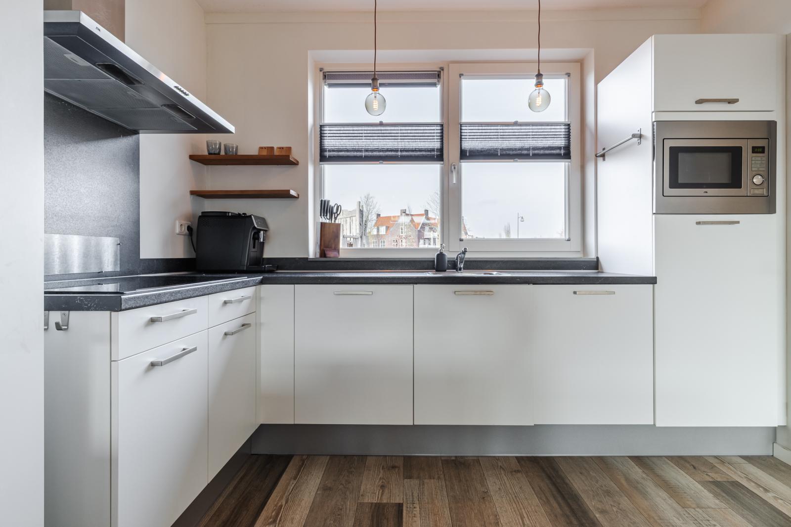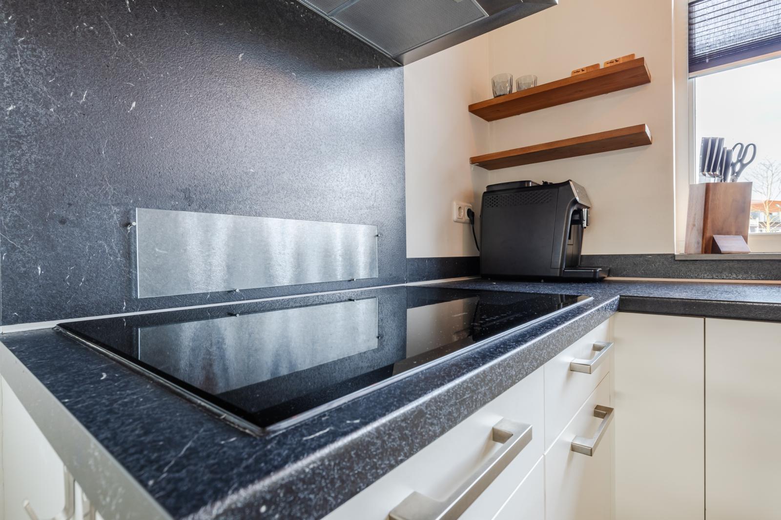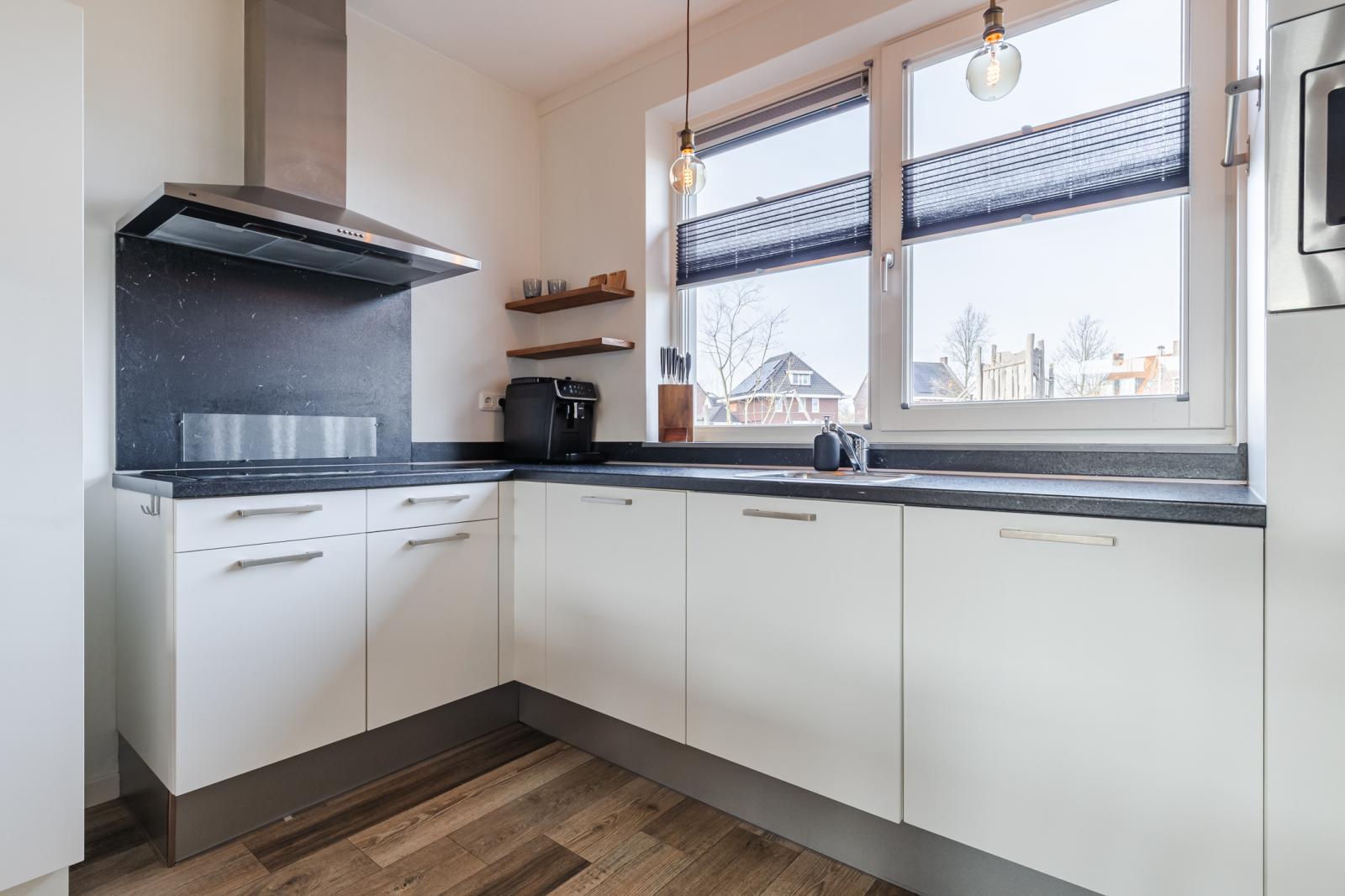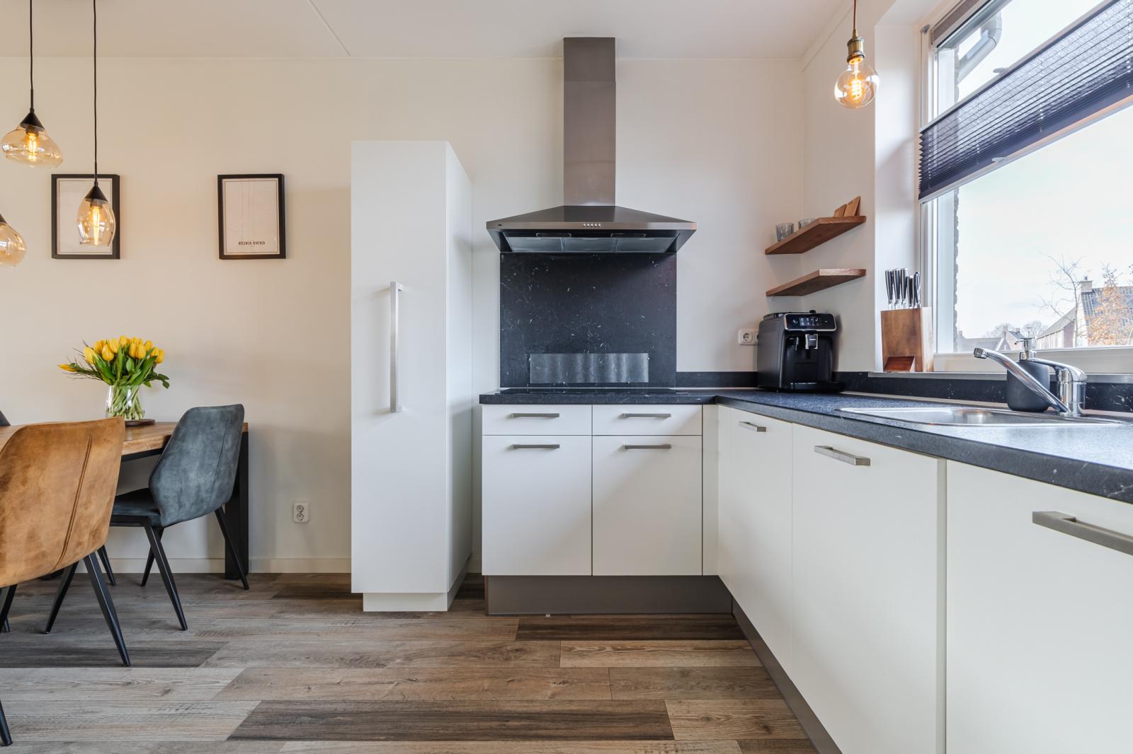 Was die fraaie laminaatvloer in de entree je ook opgevallen? Deze vloer loopt naadloos door tot in het woongedeelte. En nog beter: over de complete benedenverdieping geniet je van het comfort van vloerverwarming. Als je het woongedeelte betreedt, beland je eerst in de keuken, aan de voorkant van het huis. Deze nette keuken met zijn witte kastfronten is in een efficiënte hoekopstelling geplaatst. De inbouwapparatuur is van hoogwaardige merken als Etna en Siemens, en bestaat uit onder meer een vaatwasser, combimagnetron, inductiekookplaat en koelkast met vriesvakje).