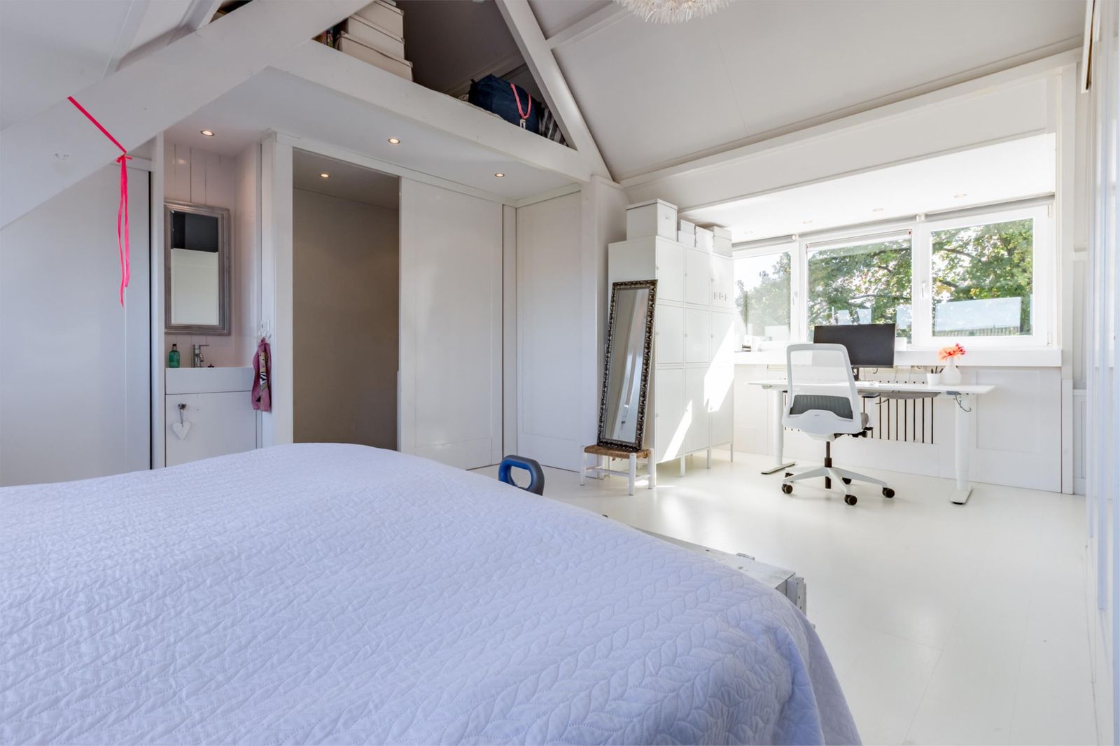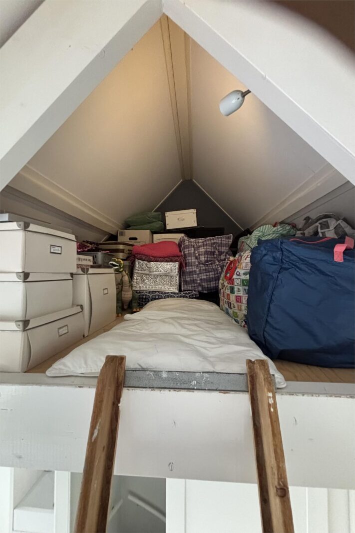 •Een verrassend grote bovenetage met slaap- en werkruimte en een wastafel.