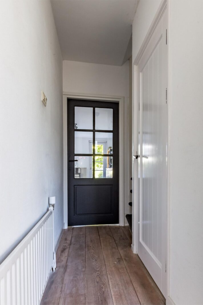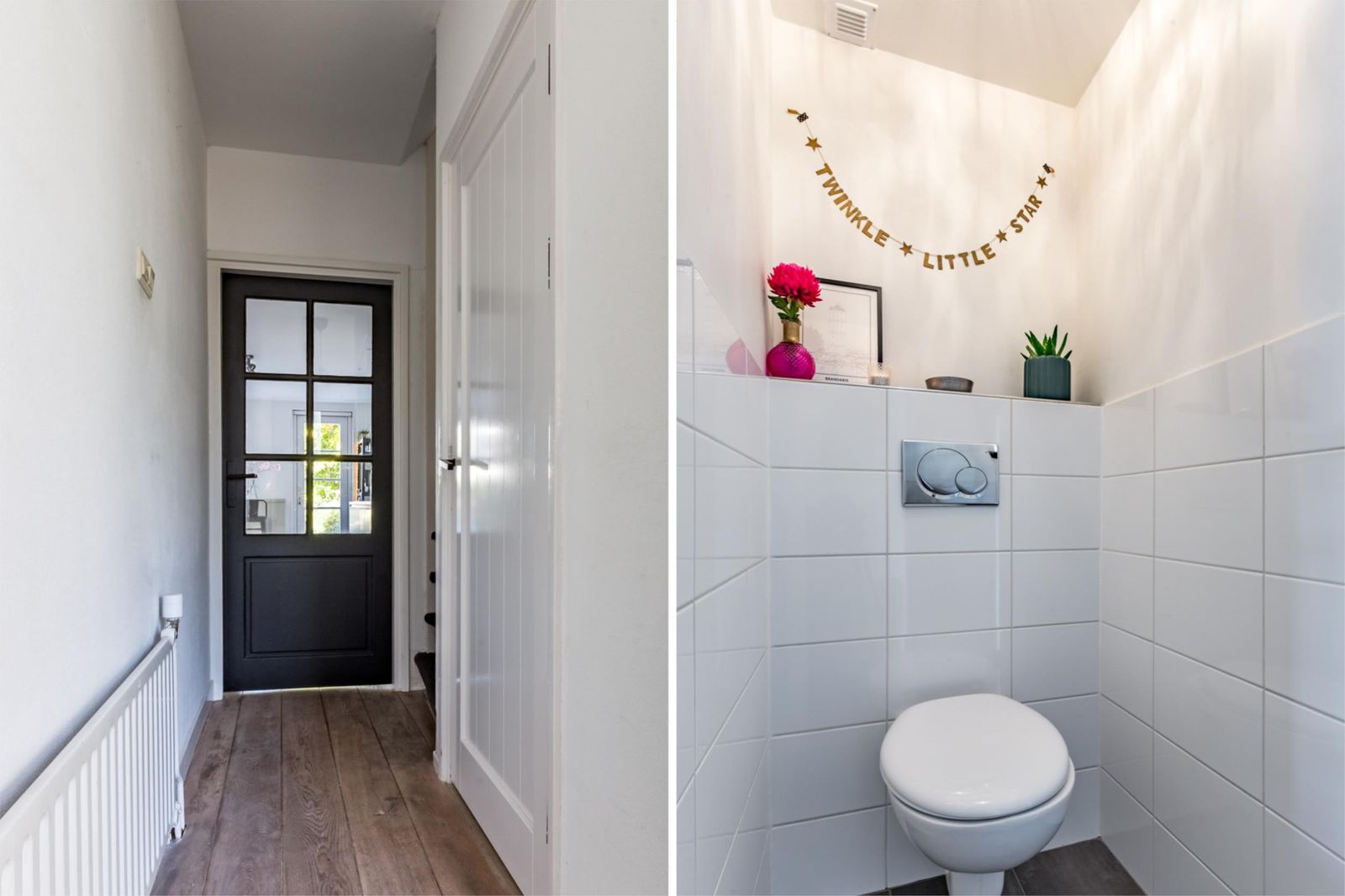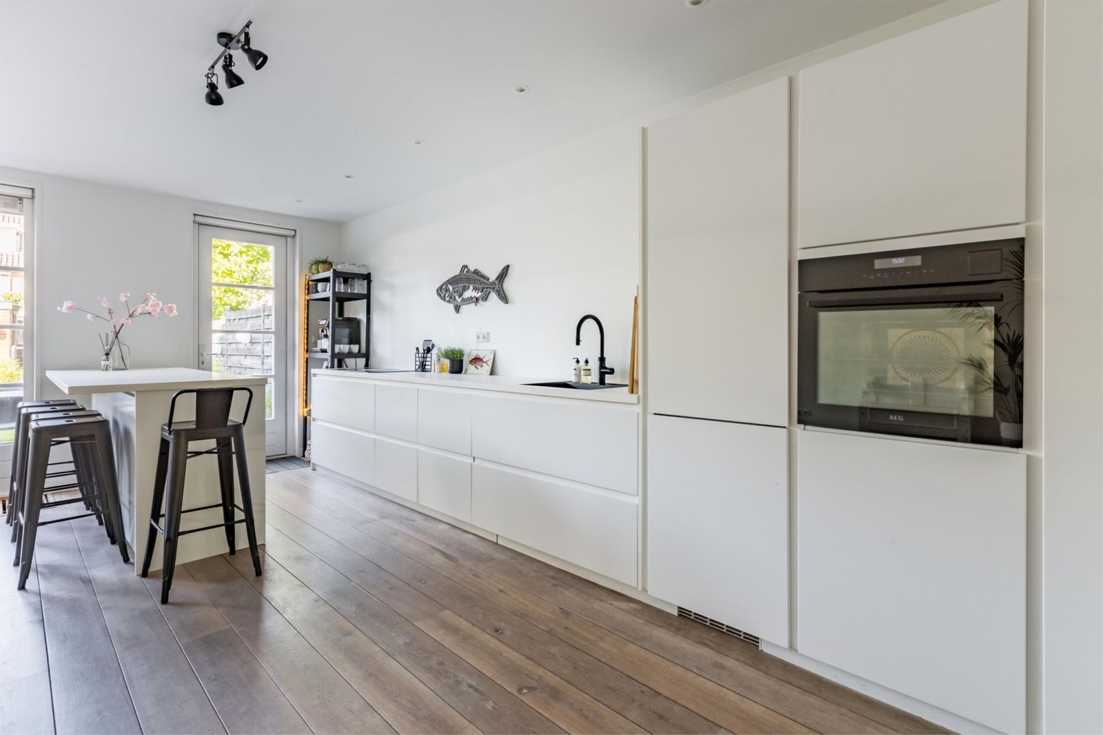 In de gang bevindt zich een apart toilet, handig is de diepe werkkast naast de keuken. De gehele benedenverdieping is voorzien van een robuuste eikenhouten vloer. In de frisse, moderne, open keuken met keukeneiland inclusief bar, vind je diverse AEG inbouwapparatuur, waaronder een inbouw koelvries combinatie, vaatwasmachine, inductiekookplaat (3 Fase) met afzuiging, combi-stoomoven, Quooker Flex en veel opbergruimte. De keuken vormt het kloppend hart van het huis; een plek om te koken, aan de bar te werken of gasten te ontvangen.