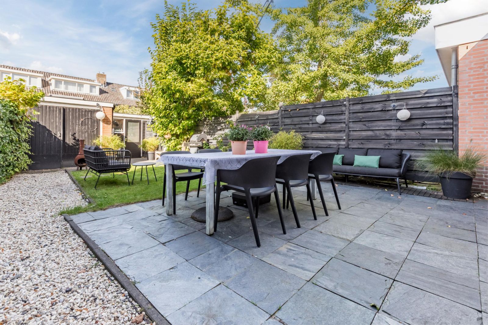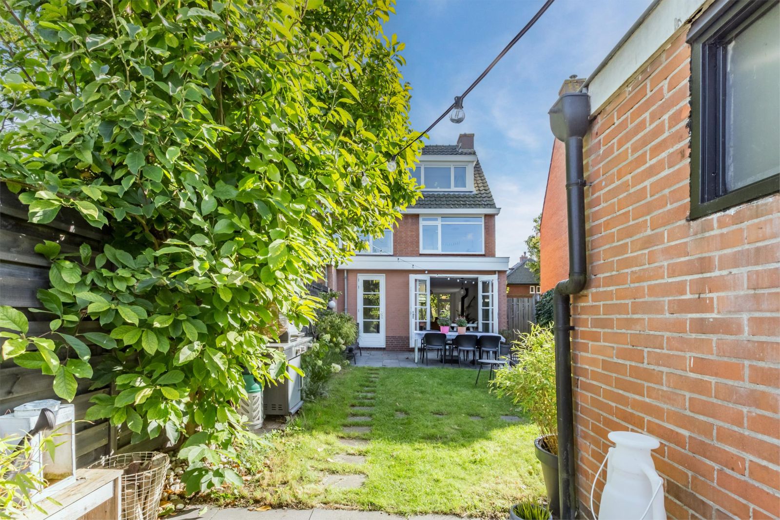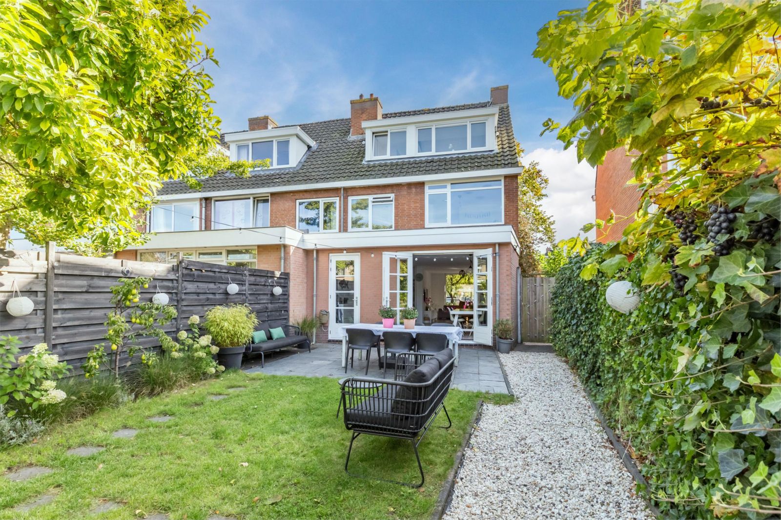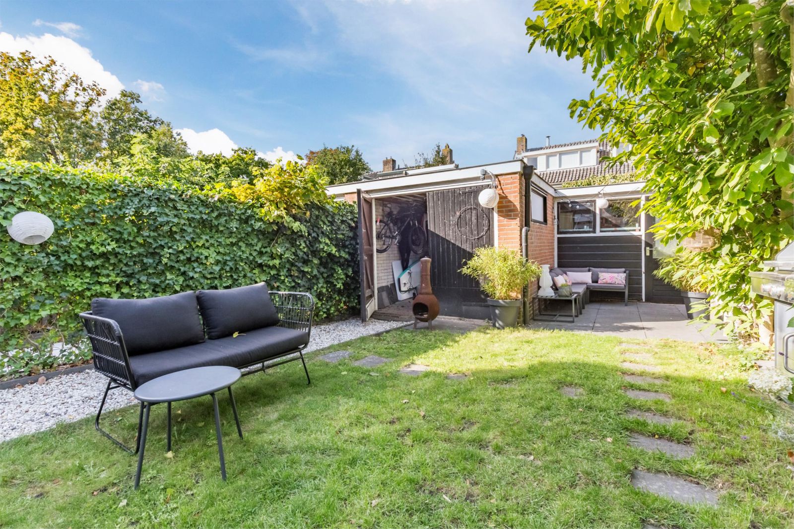 Aan de voorzijde van het huis ligt een voortuin met een roze bloesem, een wintergroene hulstboom en rondom witte bolhortensia’s. Naast het huis loop je door de poort, met fiets en al, de achtertuin in. In 2019 is een deel van het garage pad samen met de buren bij de achtertuinen getrokken en is er een poortdeur geplaatst. Hierdoor is de extra grote en zonnige buitenruimte ontstaan, die bovendien afsluitbaar is.