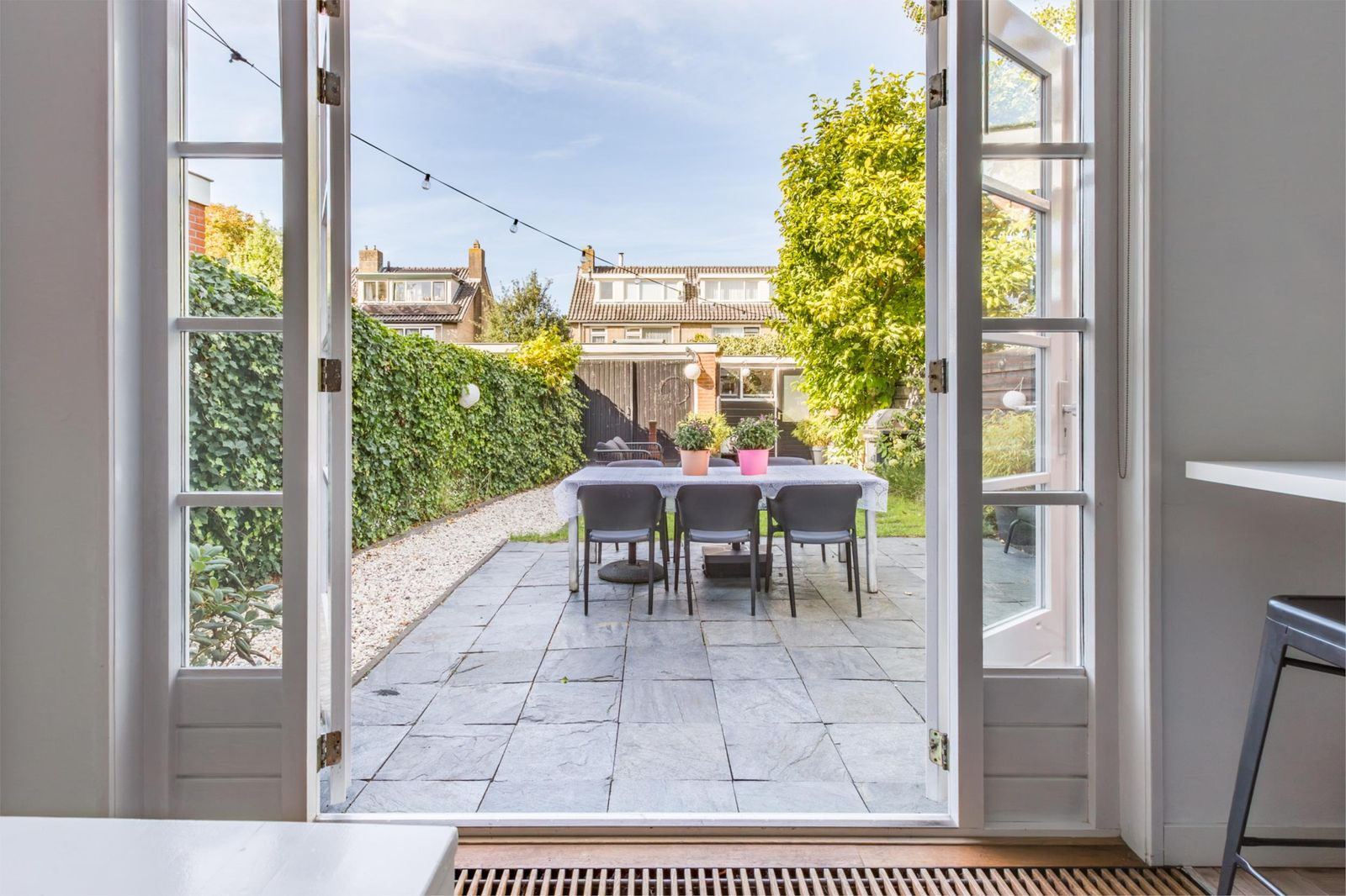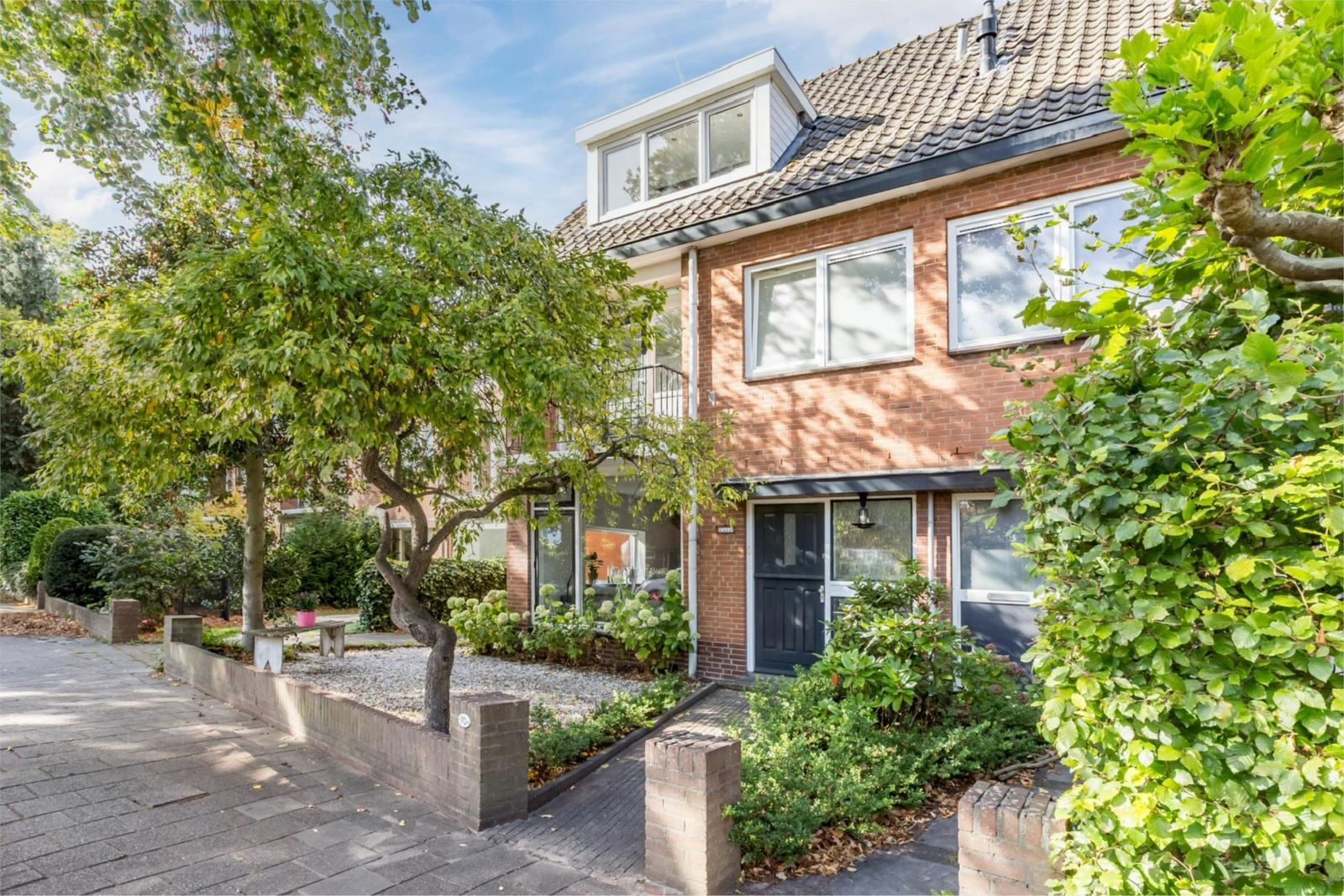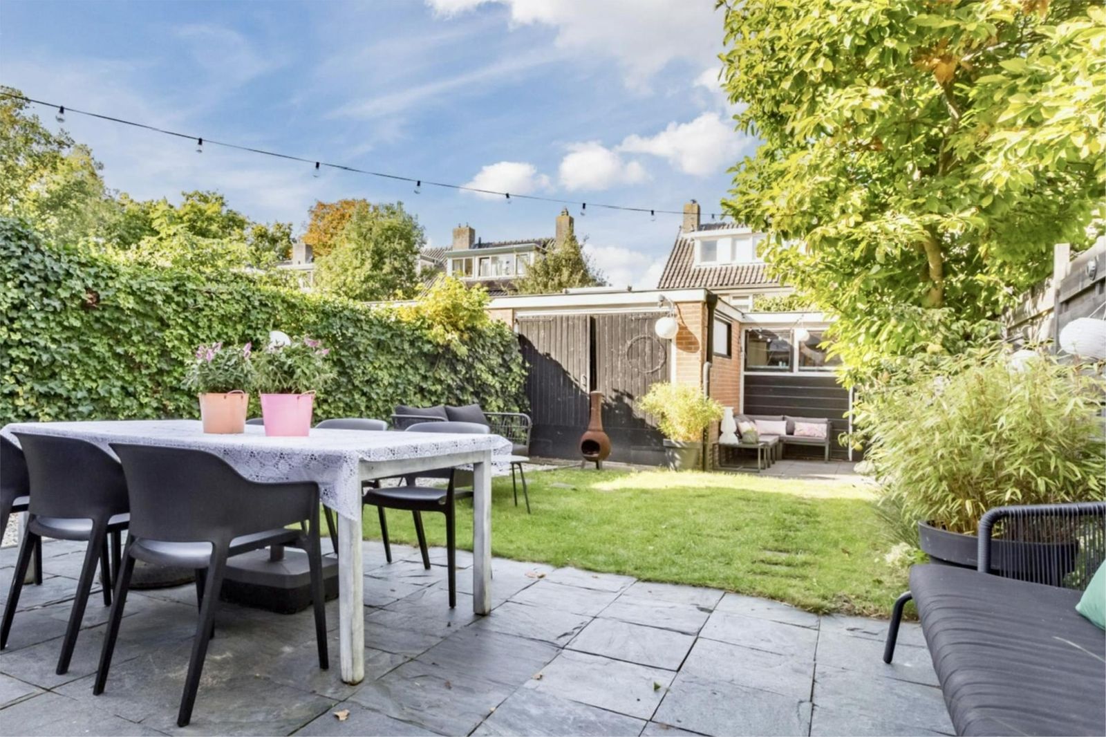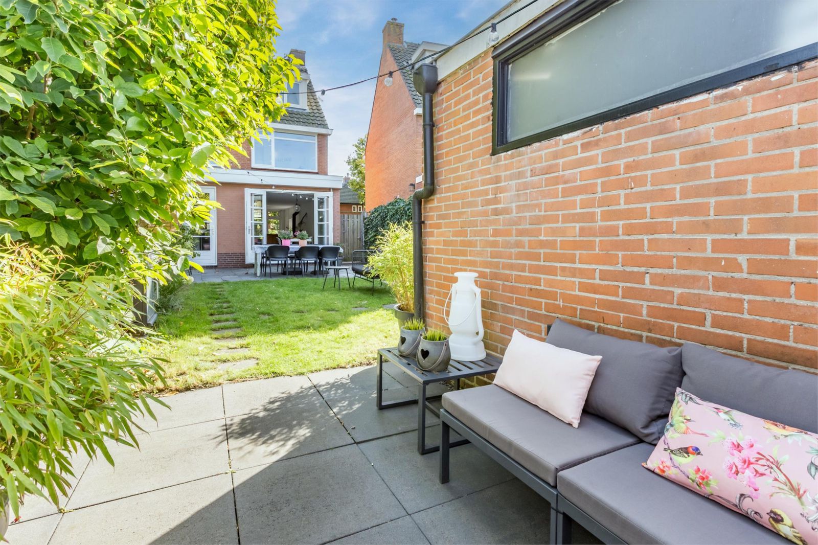 Aan de voorzijde van het huis ligt een voortuin met een roze bloesem, een wintergroene hulstboom en rondom witte bolhortensia’s. Naast het huis loop je door de poort, met fiets en al, de achtertuin in. In 2019 is een deel van het garage pad samen met de buren bij de achtertuinen getrokken en is er een poortdeur geplaatst. Hierdoor is de extra grote en zonnige buitenruimte ontstaan, die bovendien afsluitbaar is.