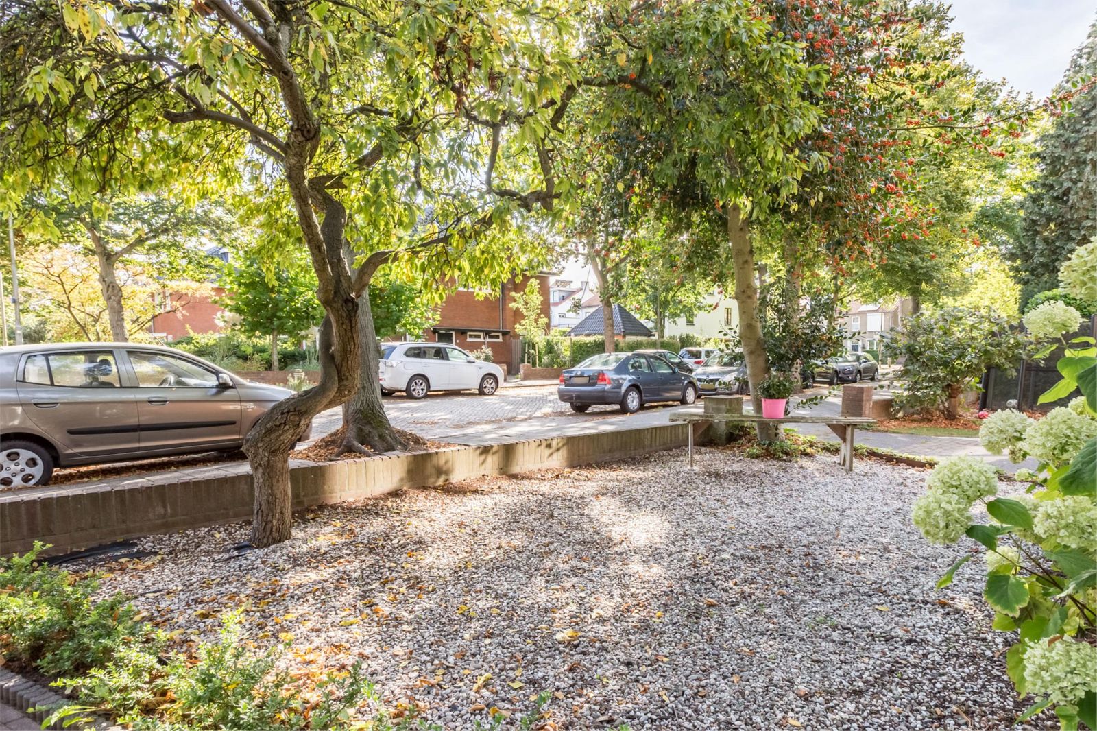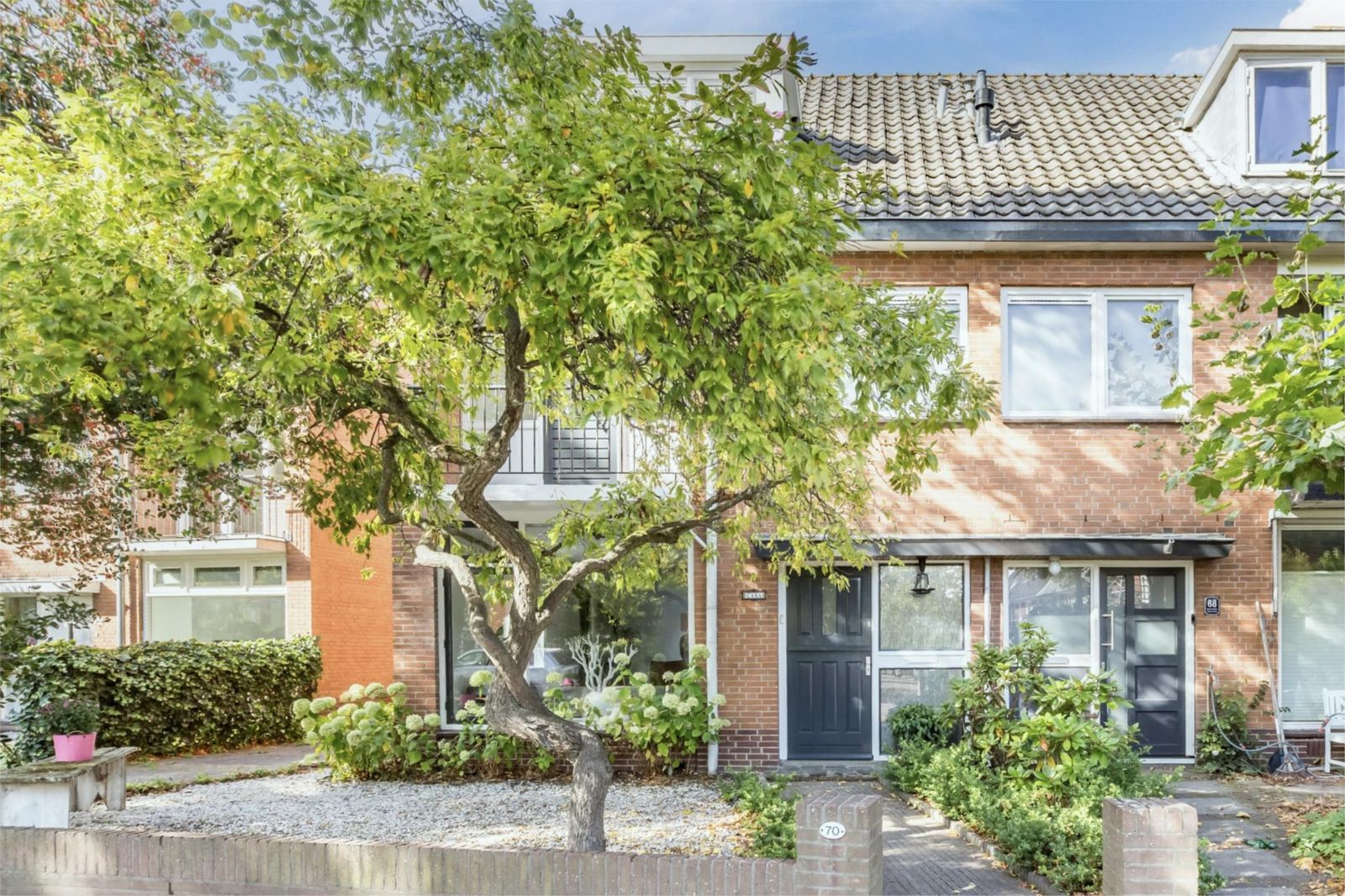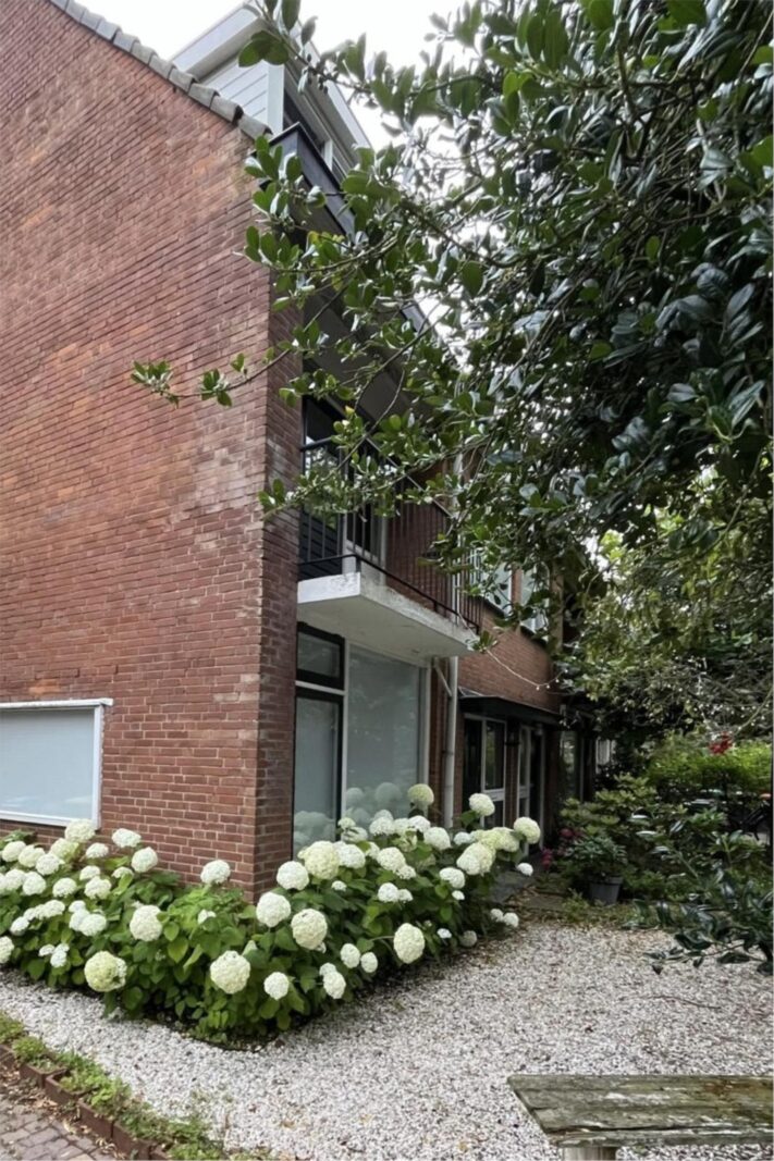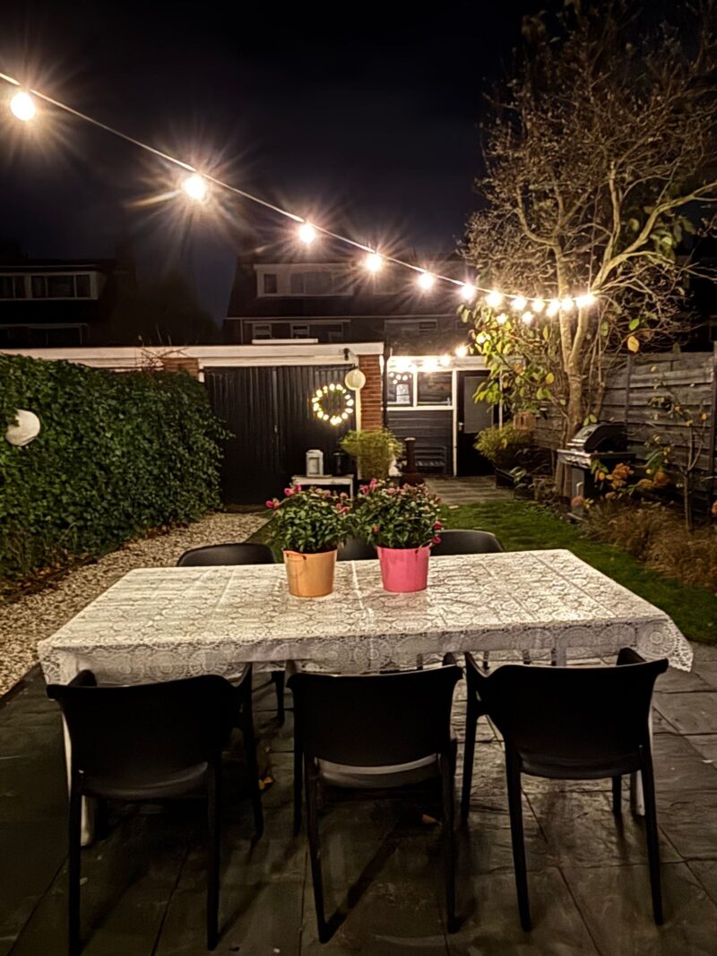 Aan de voorzijde van het huis ligt een voortuin met een roze bloesem, een wintergroene hulstboom en rondom witte bolhortensia’s. Naast het huis loop je door de poort, met fiets en al, de achtertuin in. In 2019 is een deel van het garage pad samen met de buren bij de achtertuinen getrokken en is er een poortdeur geplaatst. Hierdoor is de extra grote en zonnige buitenruimte ontstaan, die bovendien afsluitbaar is.