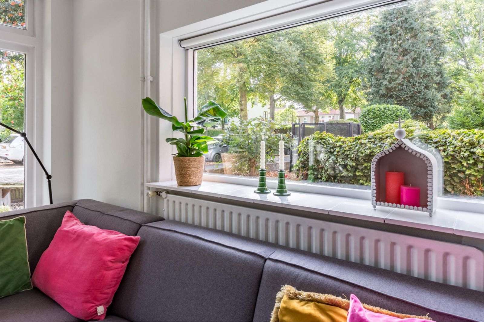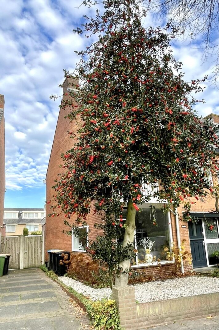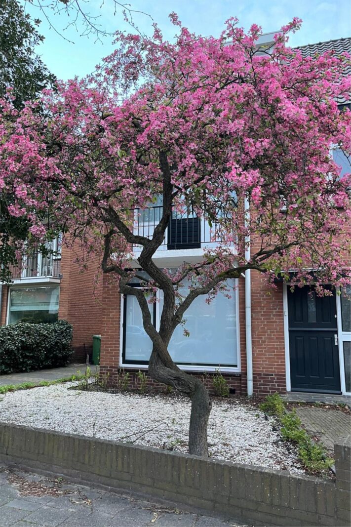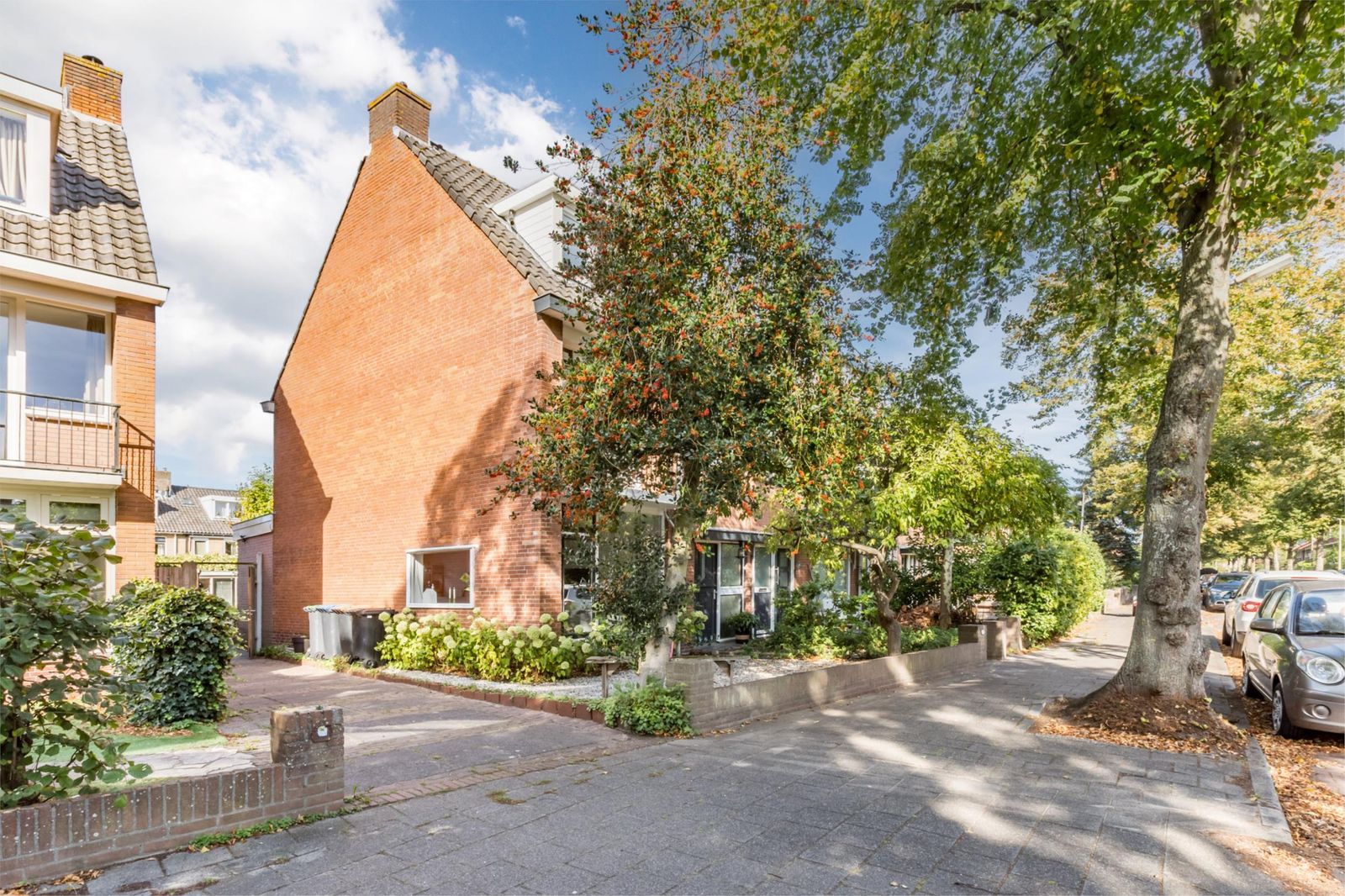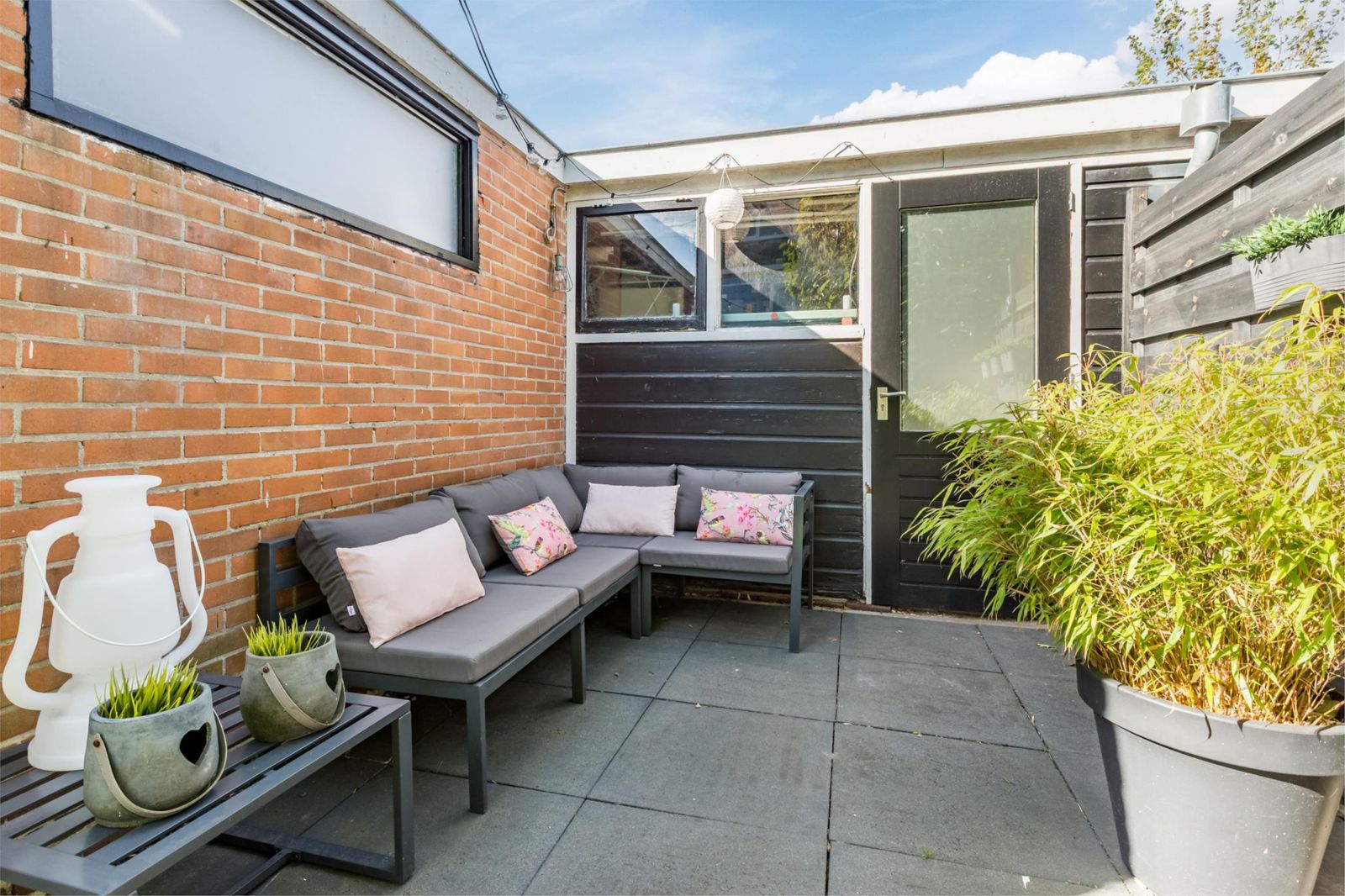 Aan de voorzijde van het huis ligt een voortuin met een roze bloesem, een wintergroene hulstboom en rondom witte bolhortensia’s. Naast het huis loop je door de poort, met fiets en al, de achtertuin in. In 2019 is een deel van het garage pad samen met de buren bij de achtertuinen getrokken en is er een poortdeur geplaatst. Hierdoor is de extra grote en zonnige buitenruimte ontstaan, die bovendien afsluitbaar is.