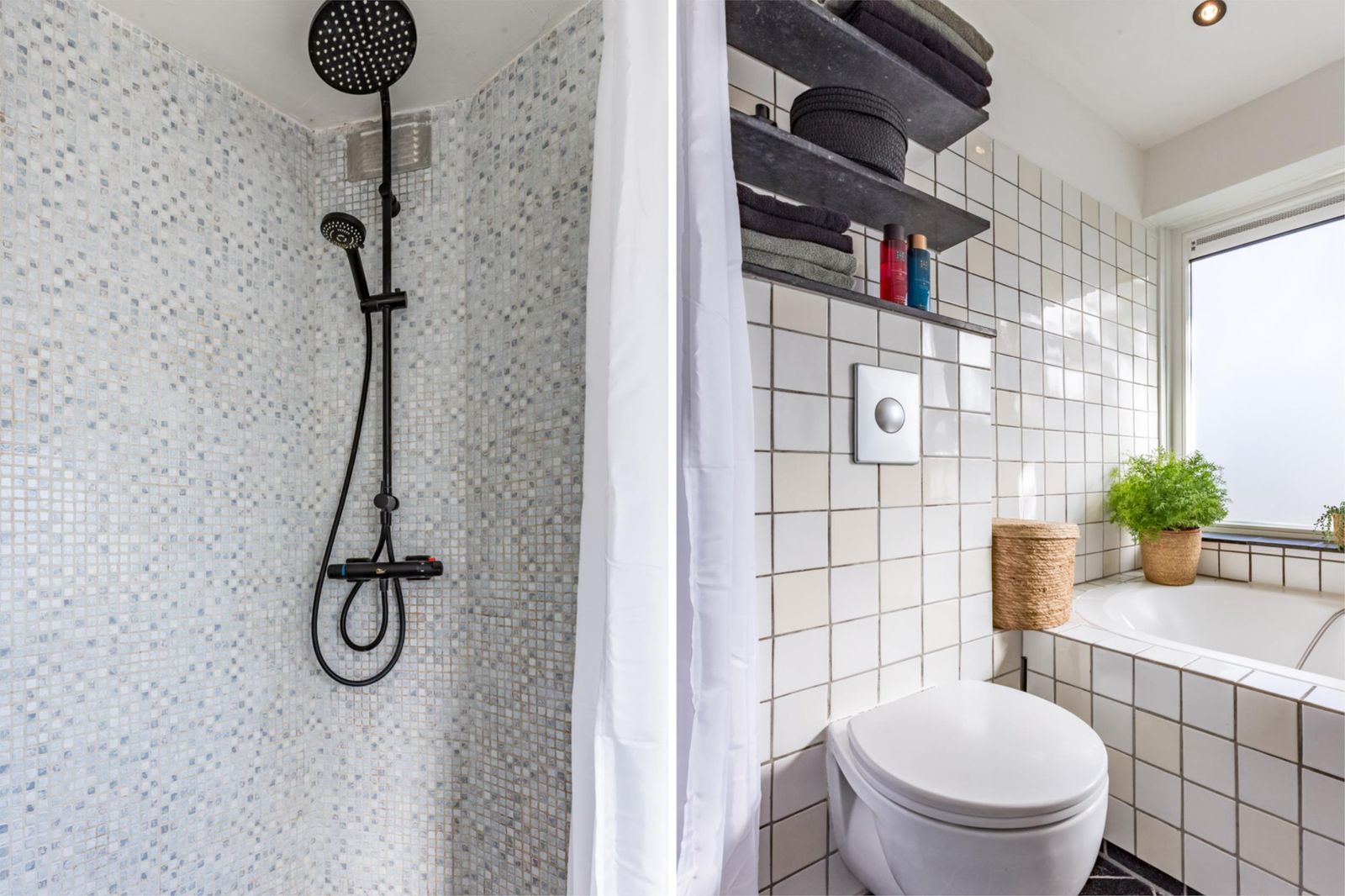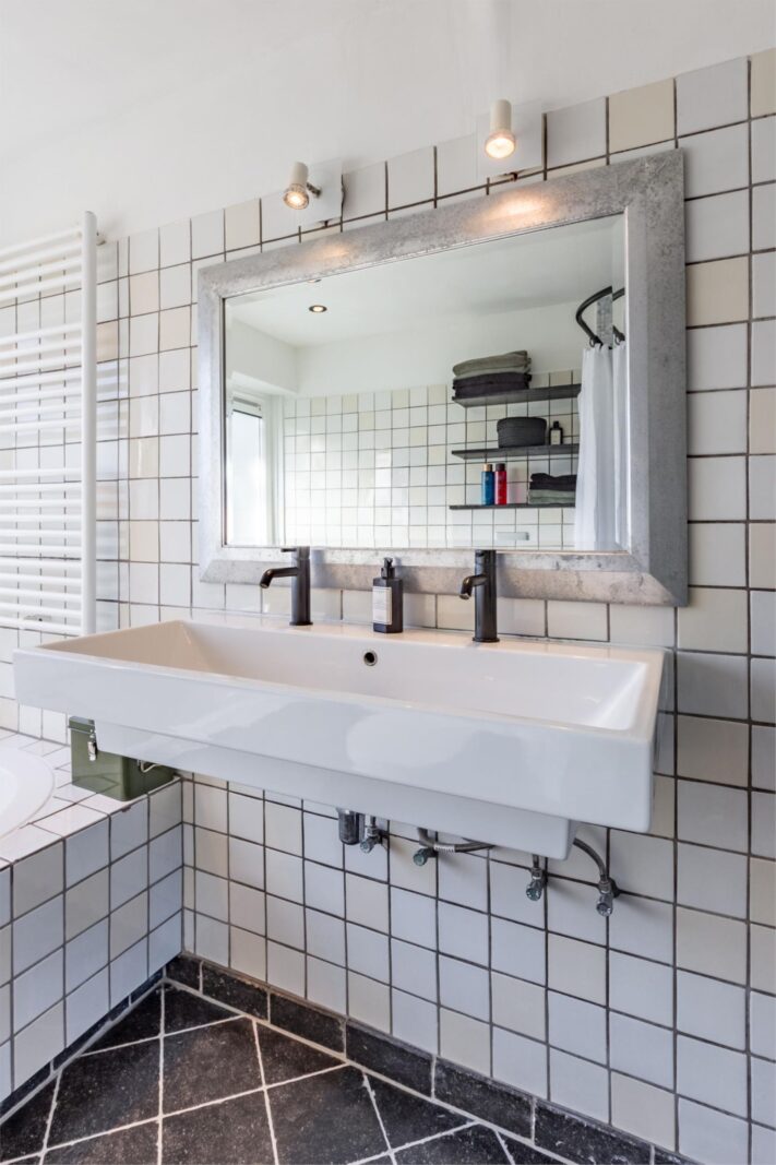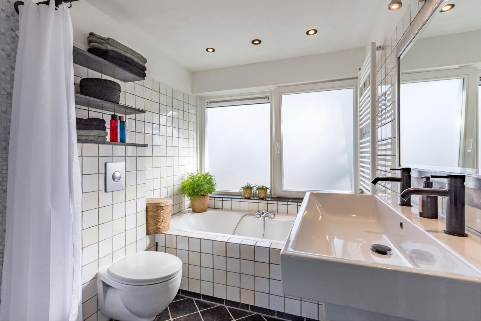 • Een complete badkamer met douche, bad, dubbele wastafel, toilet en vloerverwarming.