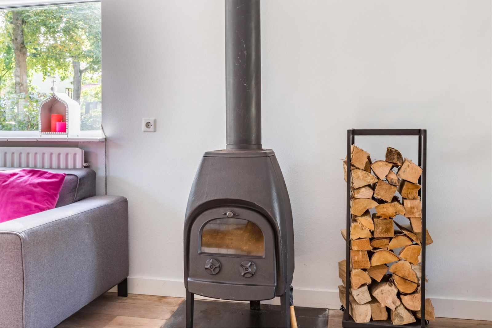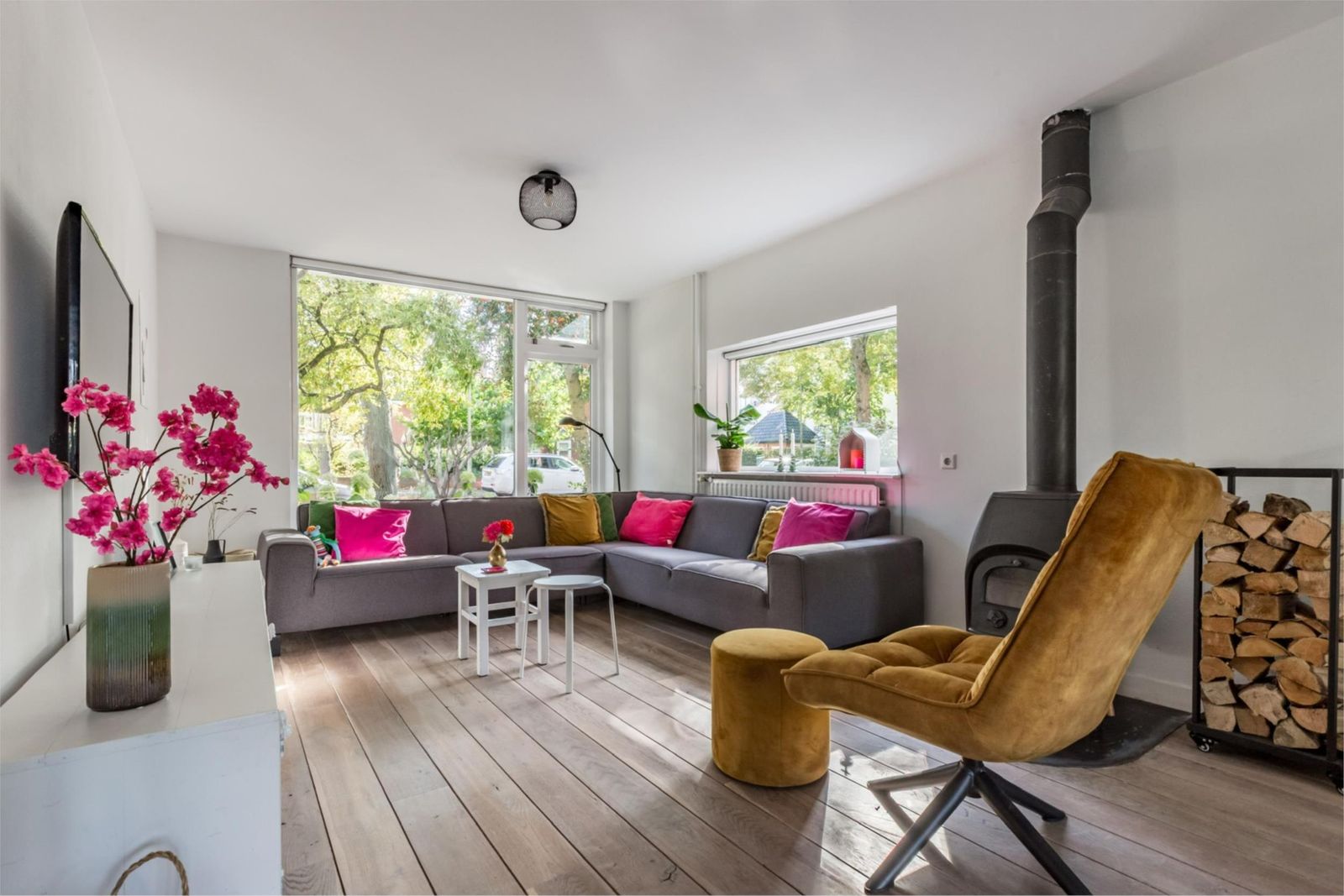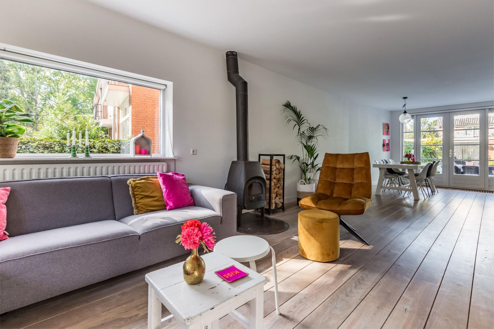 De woonkamer voelt direct uitnodigend: veel licht, ruimte om te leven en een open verbinding met de tuin via openslaande deuren. Extra warmte en sfeer komt van de houtkachel (Jøtul 1).