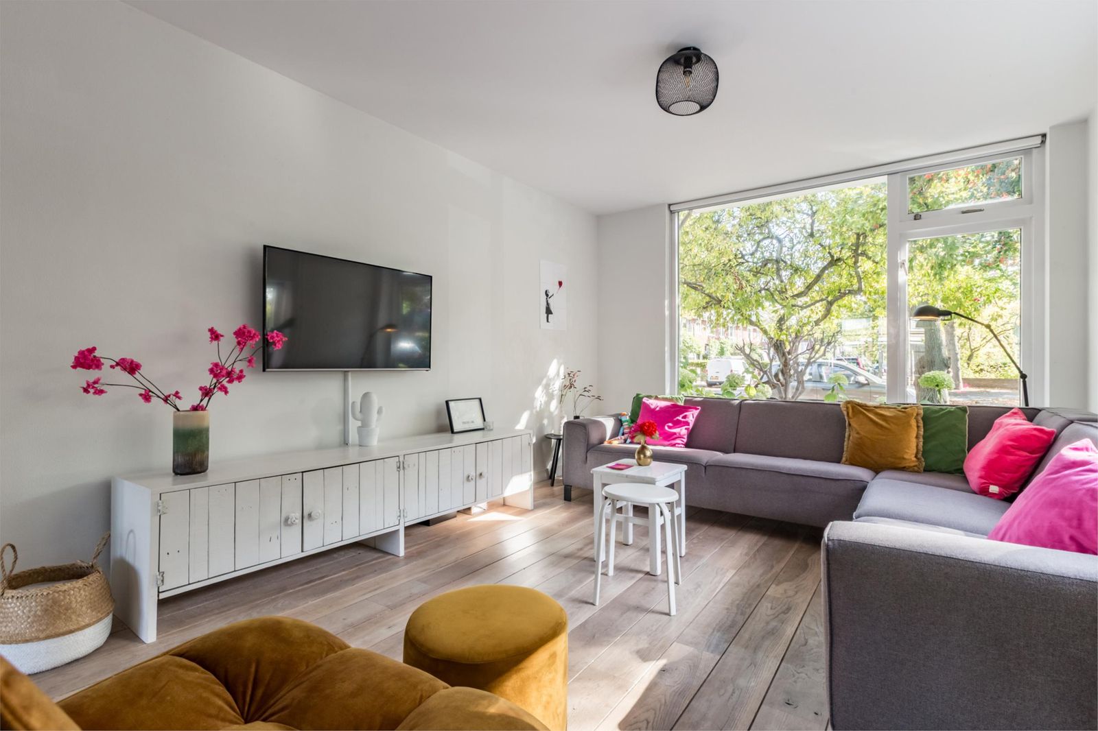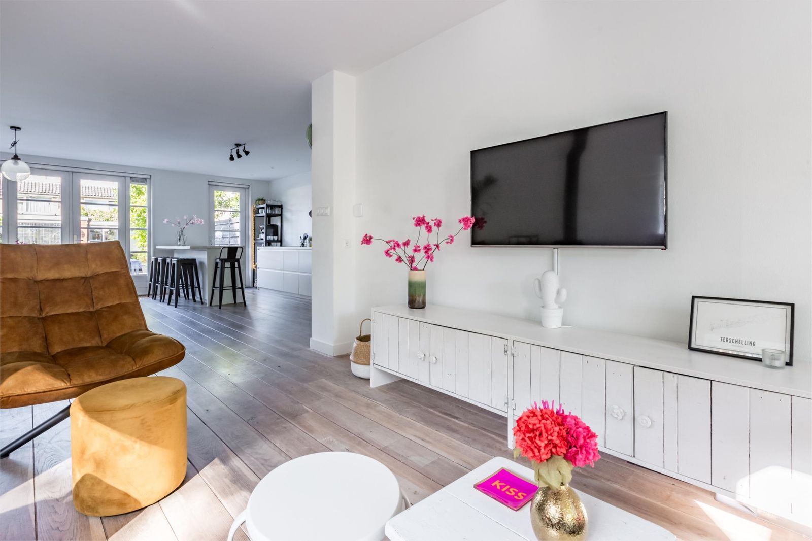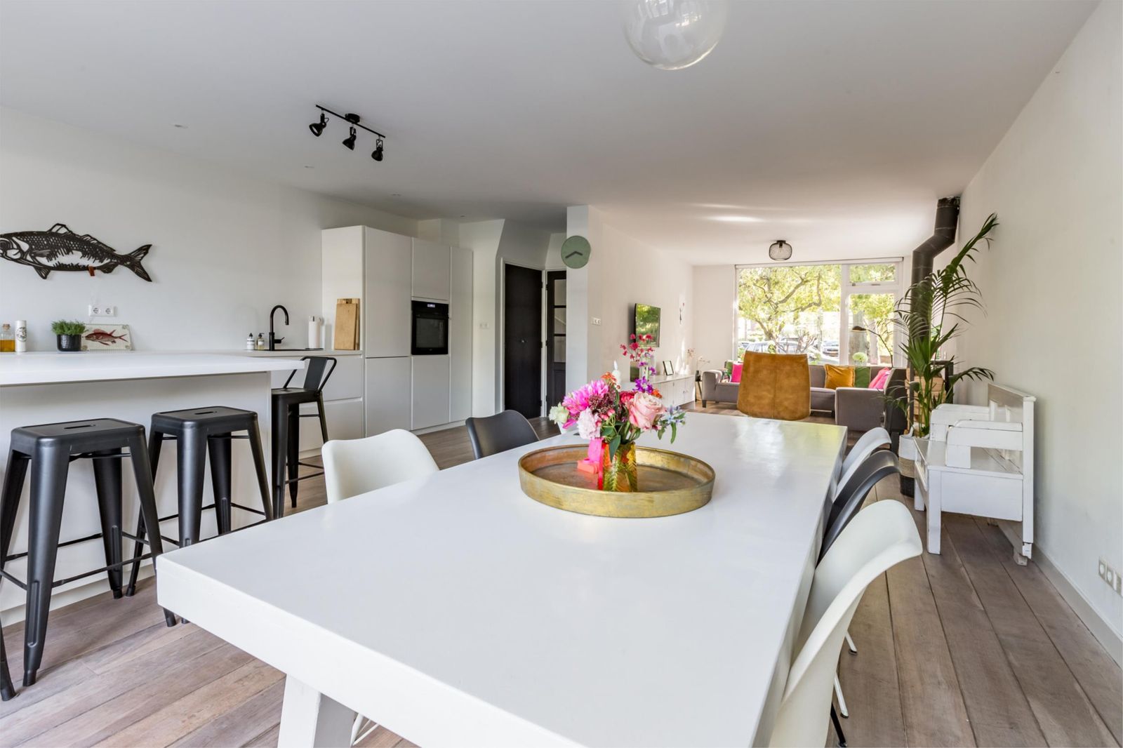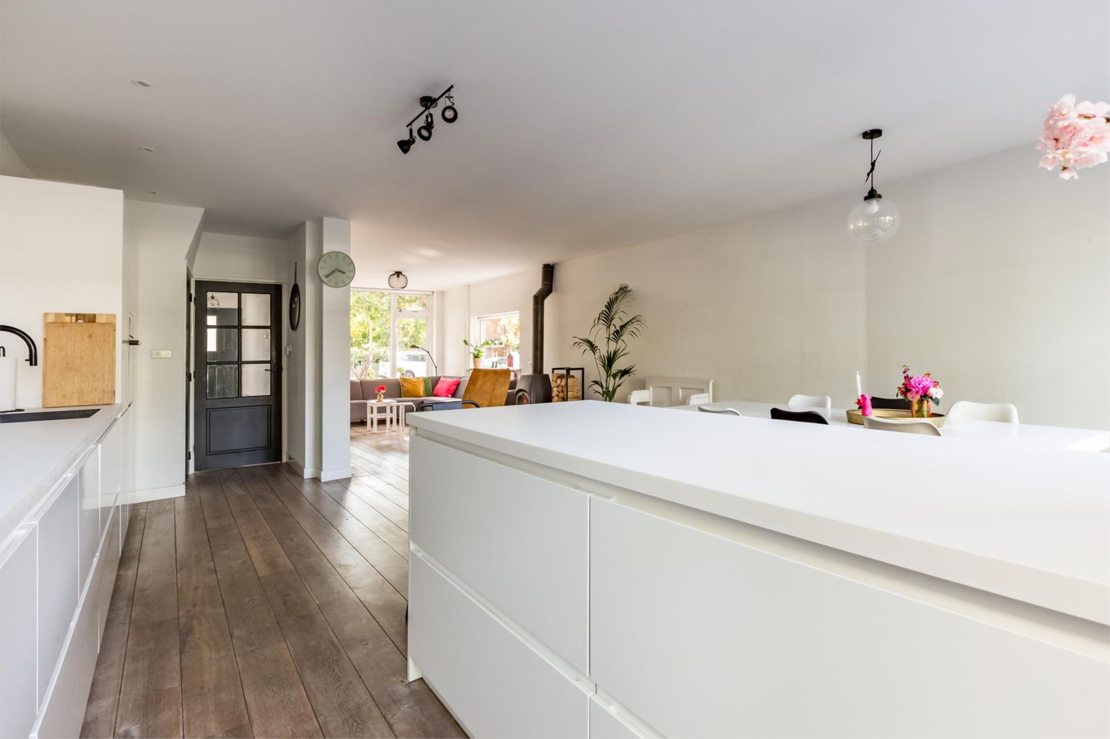 De woonkamer voelt direct uitnodigend: veel licht, ruimte om te leven en een open verbinding met de tuin via openslaande deuren. Extra warmte en sfeer komt van de houtkachel (Jøtul 1).