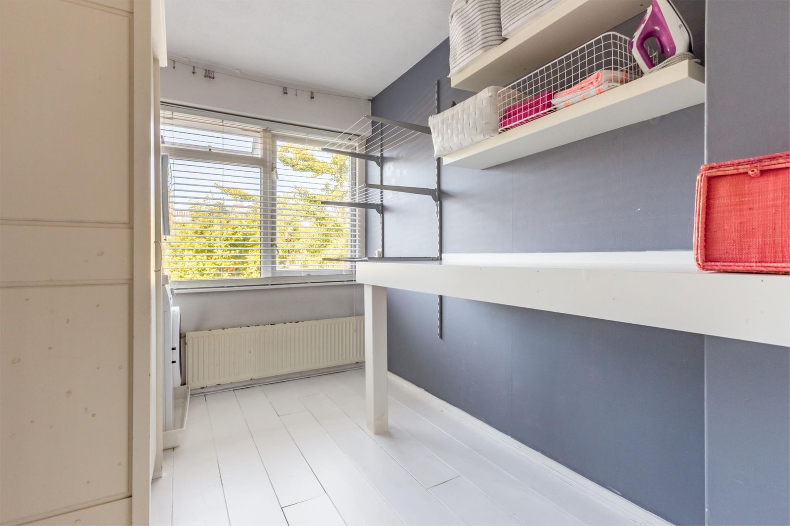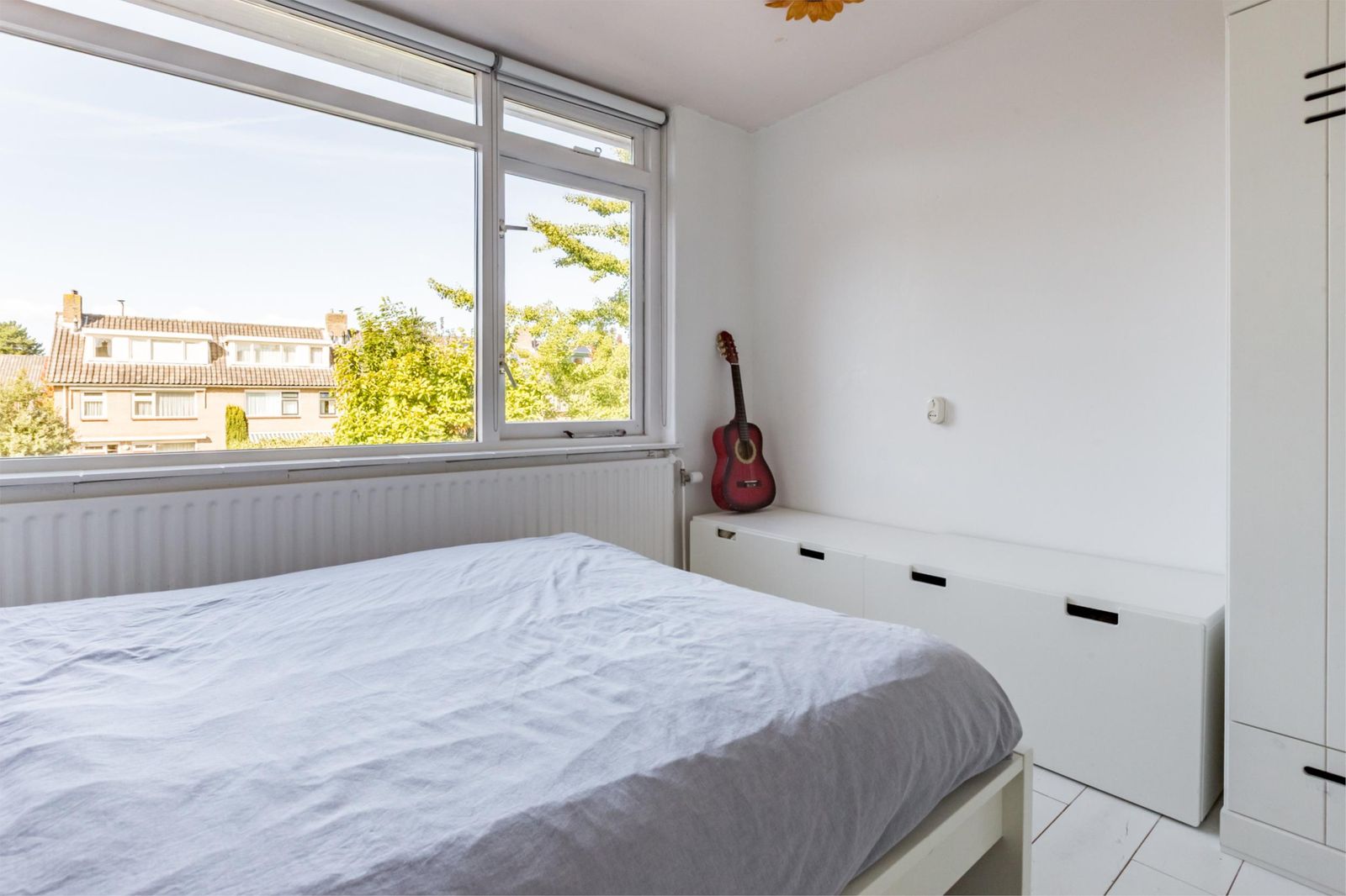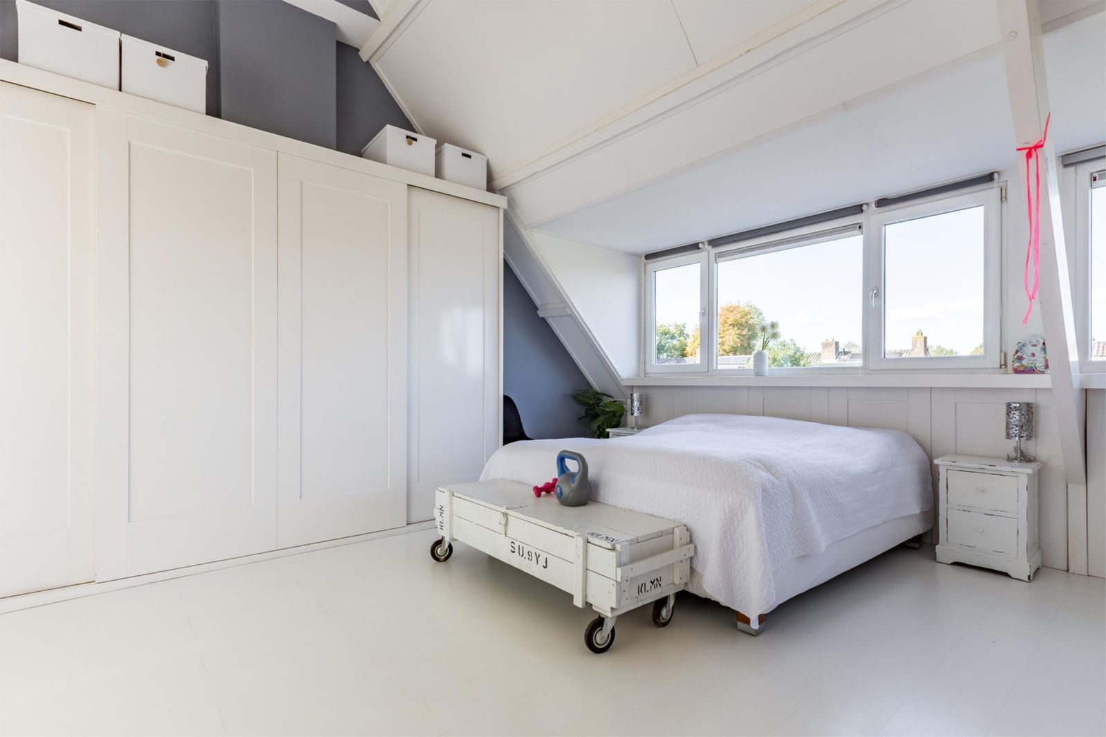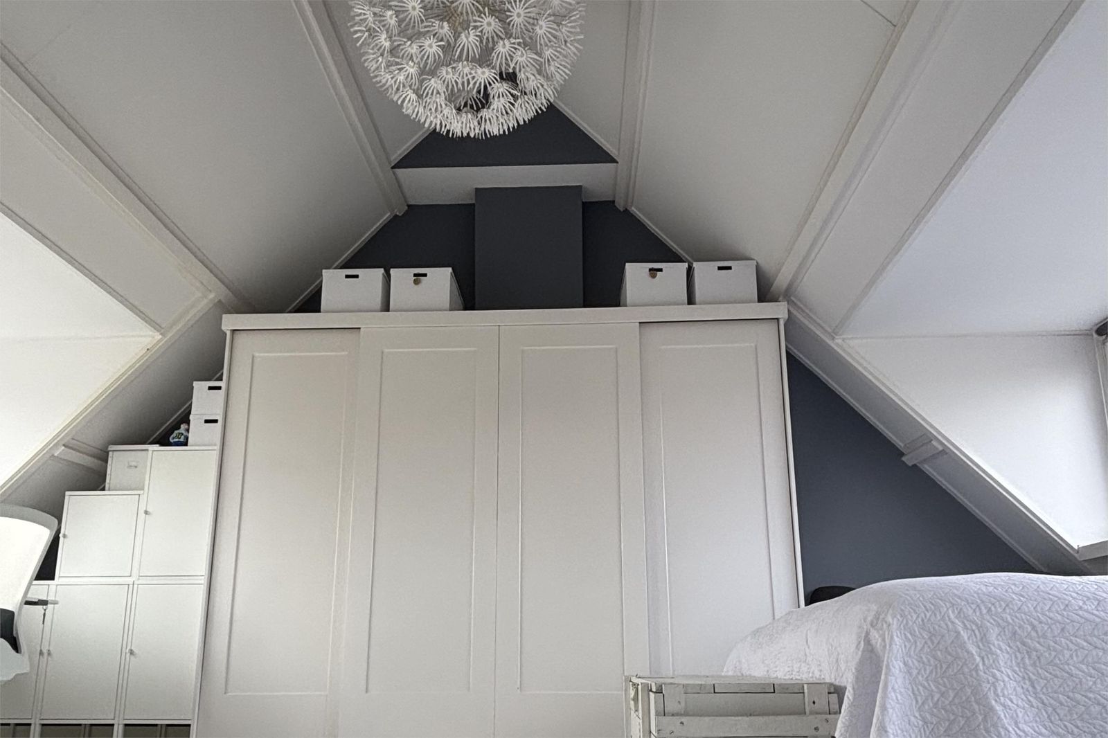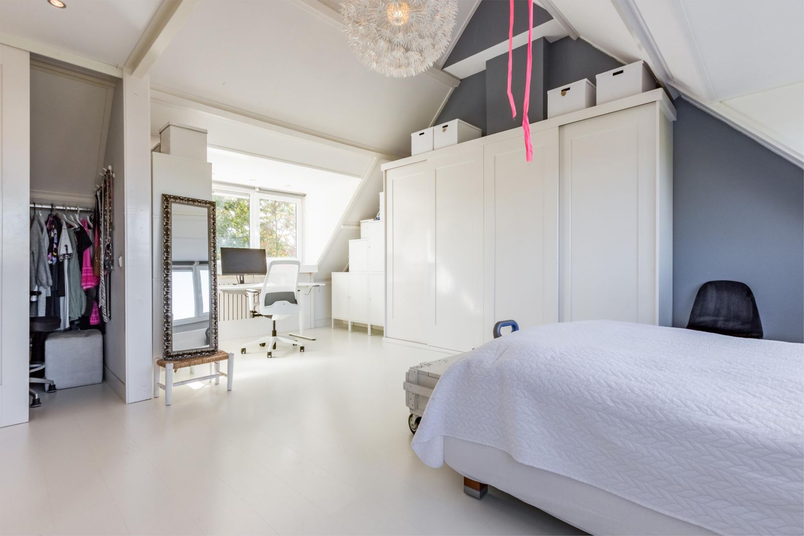 Op de tweede verdieping kom je vanaf de trap door de schuifdeur in een lichte open ruimte, met uitzicht op de bomen: de master slaapkamer met wastafel. Deze etage is voorzien van twee grote onderhoudsvrije dakkapellen die de ruimte enorm vergroten. Je vindt er een mogelijkheid voor een werkhoek en extra bergruimte dankzij een diepe inloopkast, de vide en schottenluiken aan beide kanten. In een schuifkast is de stille Remeha Quinta 35C CV-ketel geplaatst.