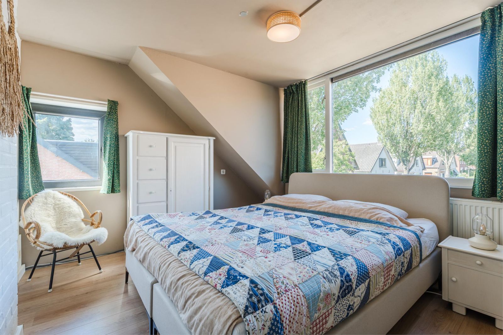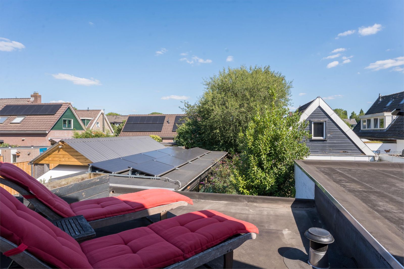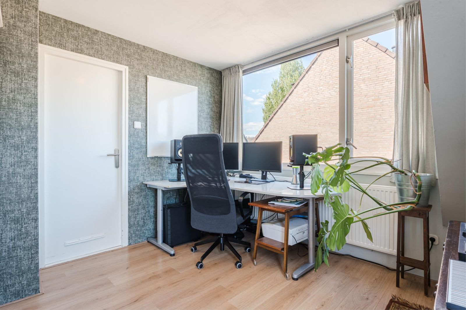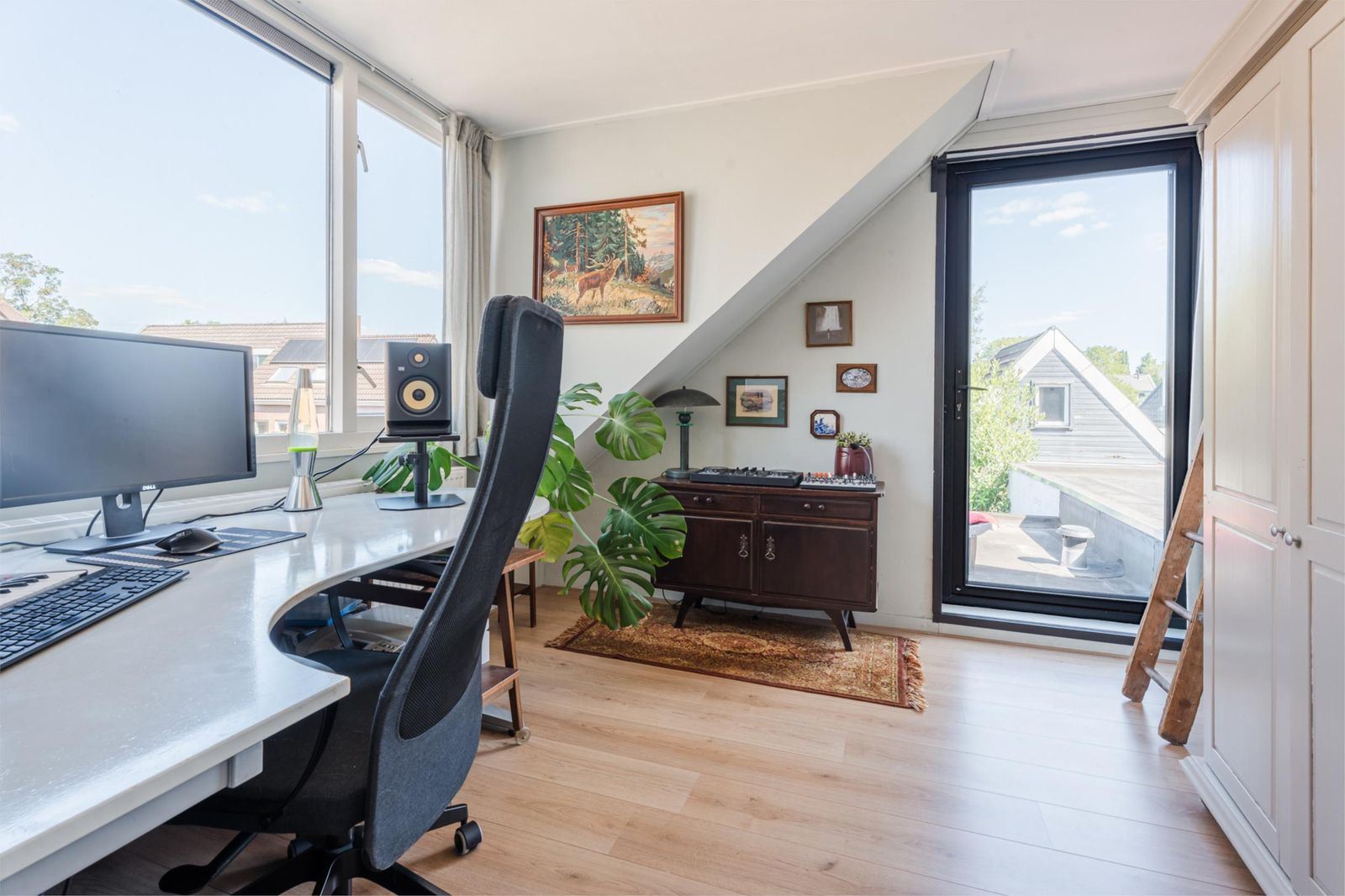 Op de bovenverdieping vind je drie slaapkamers, ieder heerlijk licht dankzij de grote dakkapel. Twee vertrekken zijn momenteel ingericht als comfortabele werkruimtes, perfect voor thuiswerken of hobby’s, maar lenen zich net zo goed als gezellige kinderkamers. Via een deur is het platte dak bereikbaar, perfect voor wie plannen heeft voor een extra uitbreiding in de vorm van een dakterras.