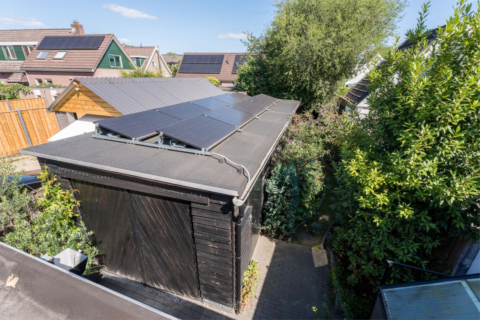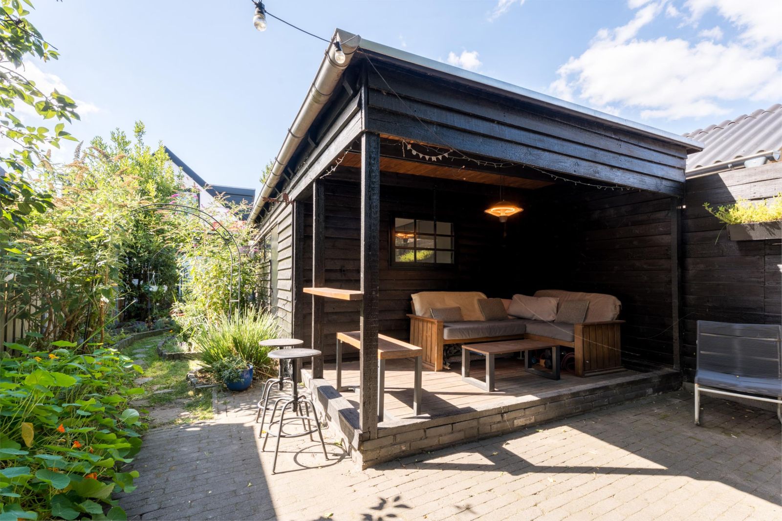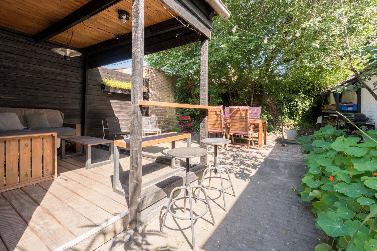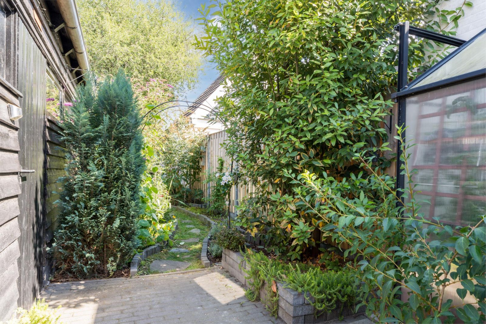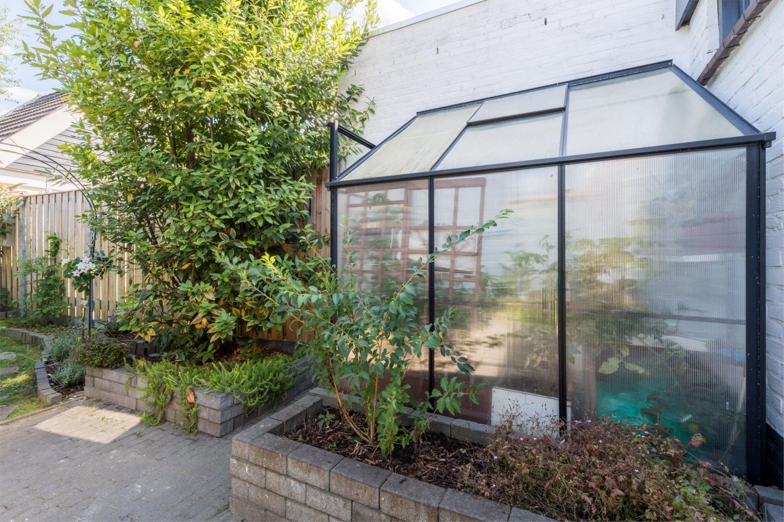 De zonnige, fraai aangelegde biodiverse tuin van 175 m2 nodigt uit tot buitenleven, met een tuinkas voor eigen groenten, beplante borders en meerdere zitplekken om steeds dat perfecte zonplekje op te zoeken. Achterin vind je een gezellige veranda met een zithoek, een groene oase waar je ontspannen kunt genieten. Een overdekte houtopslag is aanwezig.