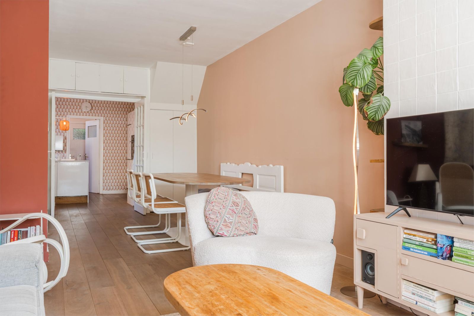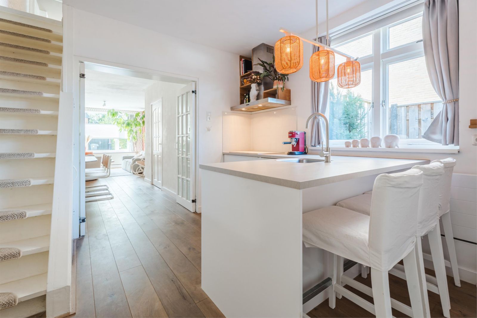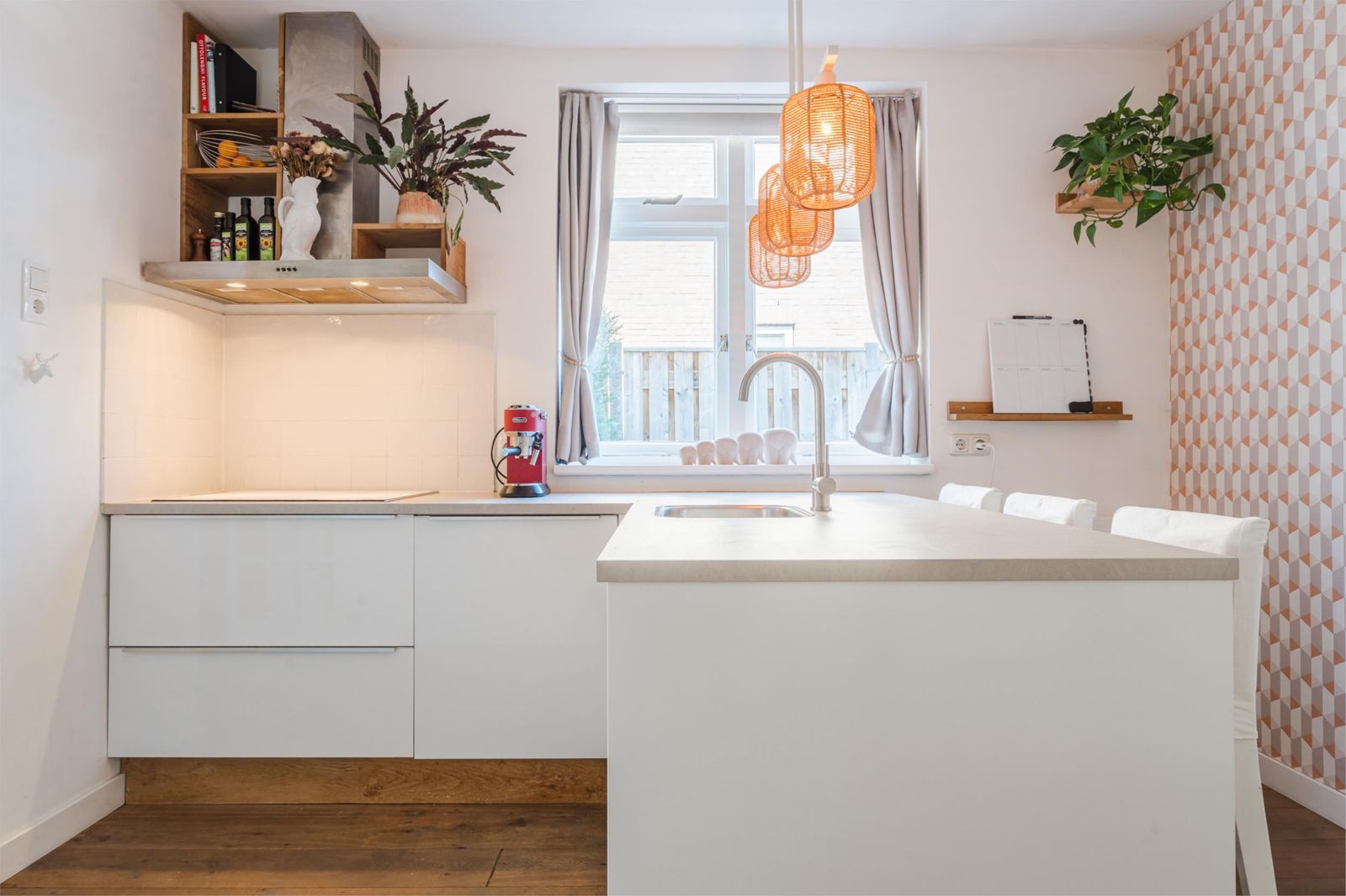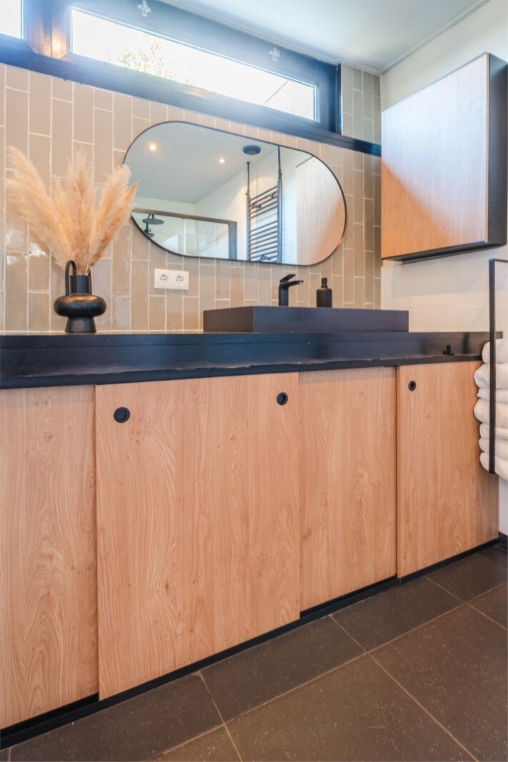 De woning is een mix van authentieke details met modern comfort. De vernieuwde badkamer is uitgerust met een strakke stalen douchedeur, regen- en handdouche, zwart granieten wasbak en stijlvolle zwarte accenten. In de moderne witte keuken vind je een gezellige bar, nieuwe inductieplaat, koelkast en complete inbouwapparatuur. De authentieke ensuite-deuren en de praktische inbouwkasten in zowel woonkamer als keuken versterken de charme van de woning. De lichte woonkamer is voorzien van een op maat gemaakt wandmeubel bijpassend bij de vloer en de schouw met witjes geeft de woonkamer nét dat beetje extra.