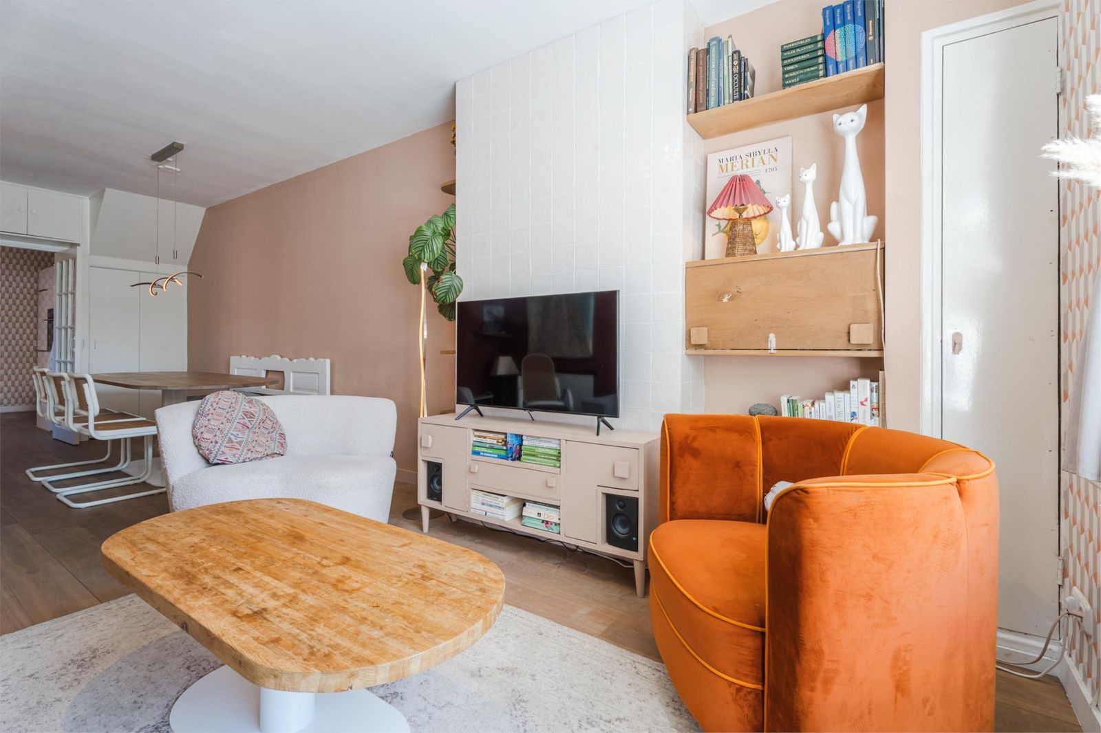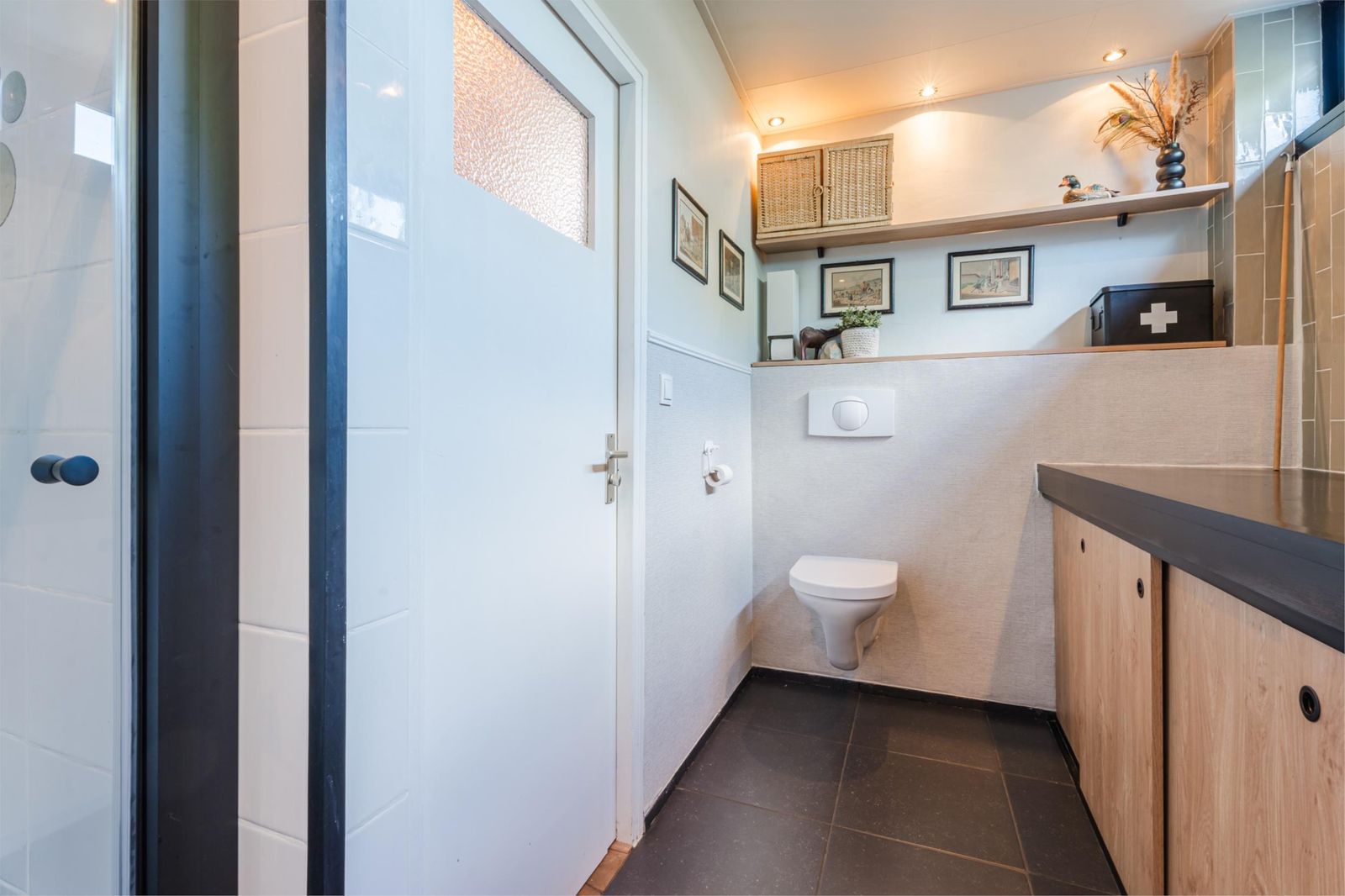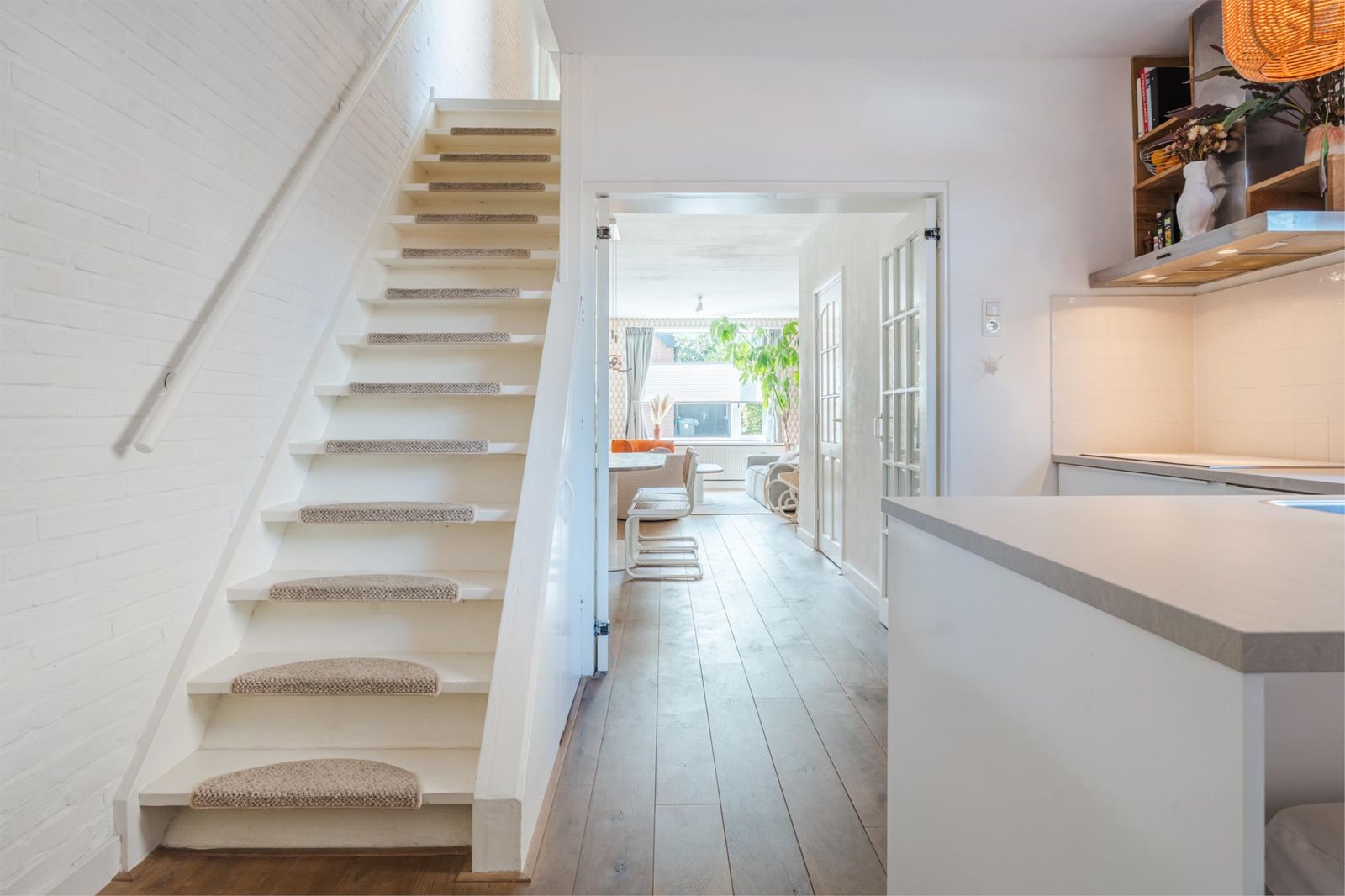 De woning is een mix van authentieke details met modern comfort. De vernieuwde badkamer is uitgerust met een strakke stalen douchedeur, regen- en handdouche, zwart granieten wasbak en stijlvolle zwarte accenten. In de moderne witte keuken vind je een gezellige bar, nieuwe inductieplaat, koelkast en complete inbouwapparatuur. De authentieke ensuite-deuren en de praktische inbouwkasten in zowel woonkamer als keuken versterken de charme van de woning. De lichte woonkamer is voorzien van een op maat gemaakt wandmeubel bijpassend bij de vloer en de schouw met witjes geeft de woonkamer nét dat beetje extra.