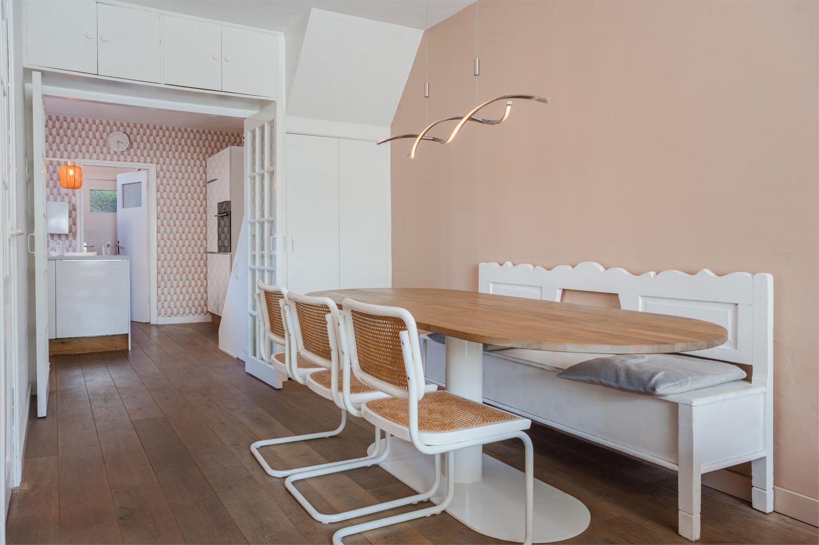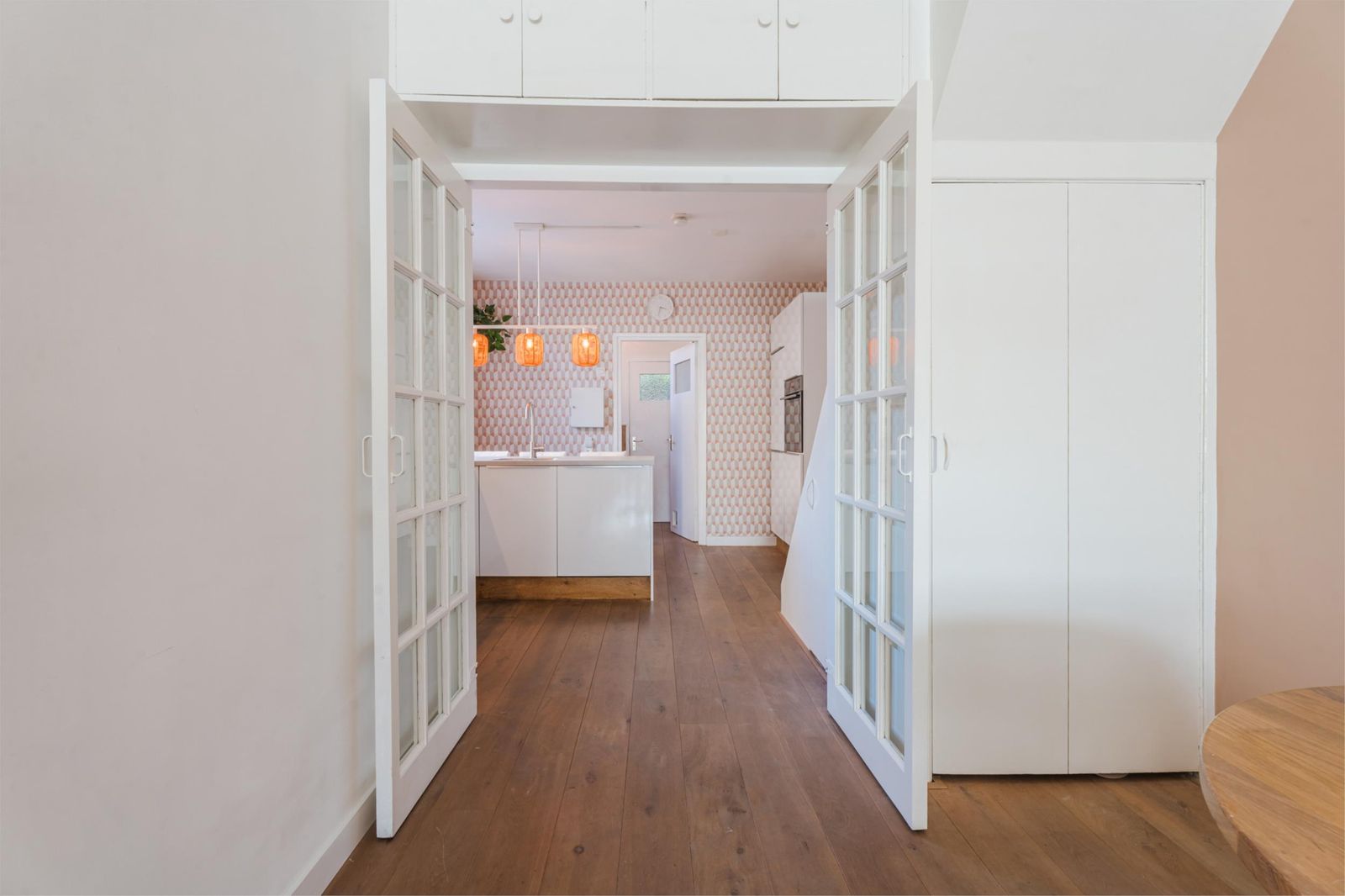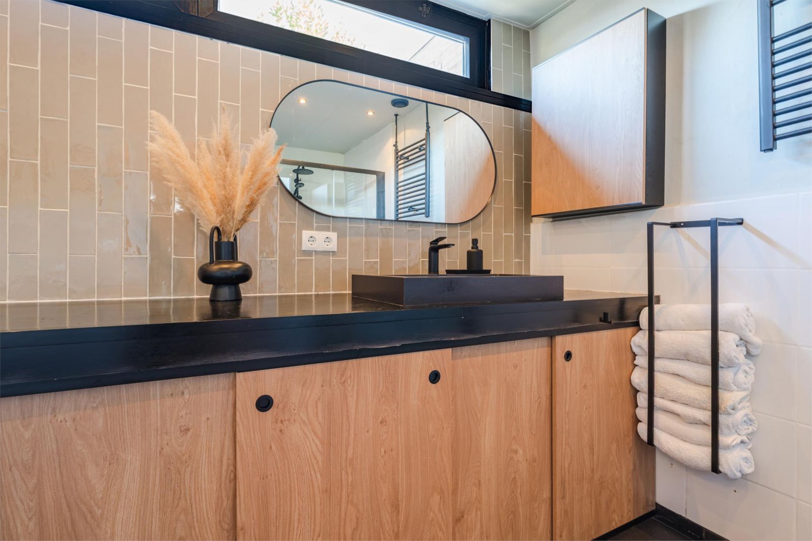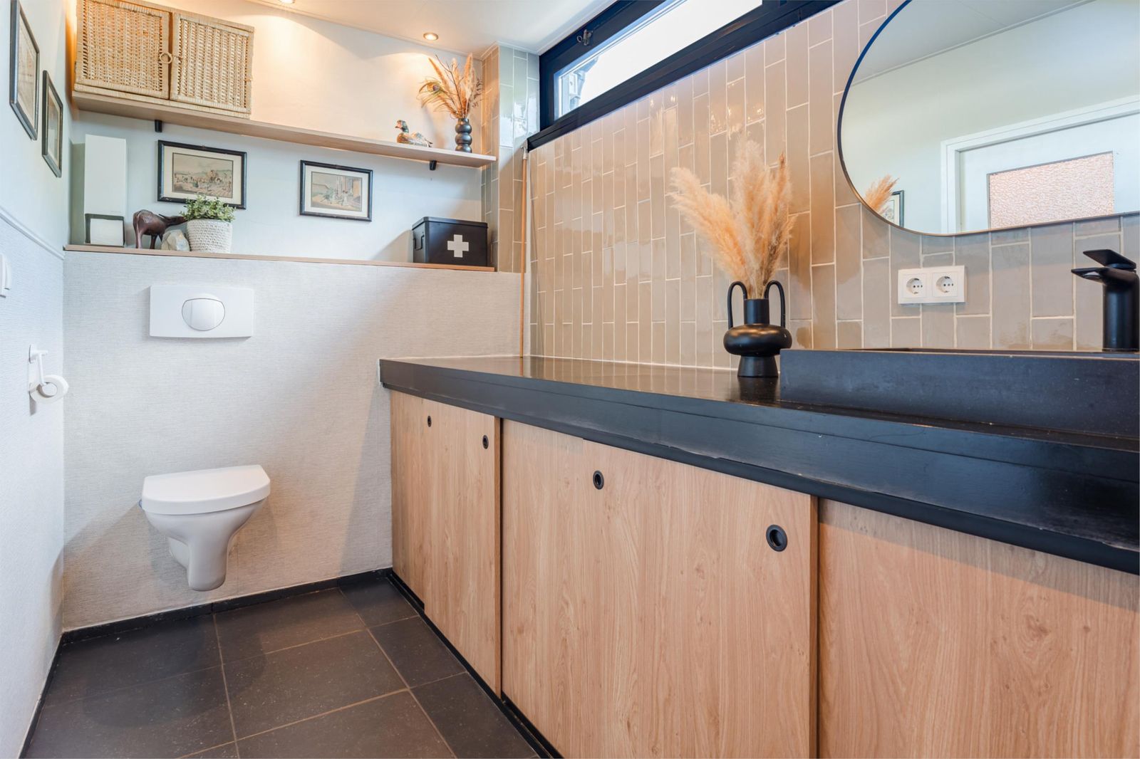 De woning is een mix van authentieke details met modern comfort. De vernieuwde badkamer is uitgerust met een strakke stalen douchedeur, regen- en handdouche, zwart granieten wasbak en stijlvolle zwarte accenten. In de moderne witte keuken vind je een gezellige bar, nieuwe inductieplaat, koelkast en complete inbouwapparatuur. De authentieke ensuite-deuren en de praktische inbouwkasten in zowel woonkamer als keuken versterken de charme van de woning. De lichte woonkamer is voorzien van een op maat gemaakt wandmeubel bijpassend bij de vloer en de schouw met witjes geeft de woonkamer nét dat beetje extra.