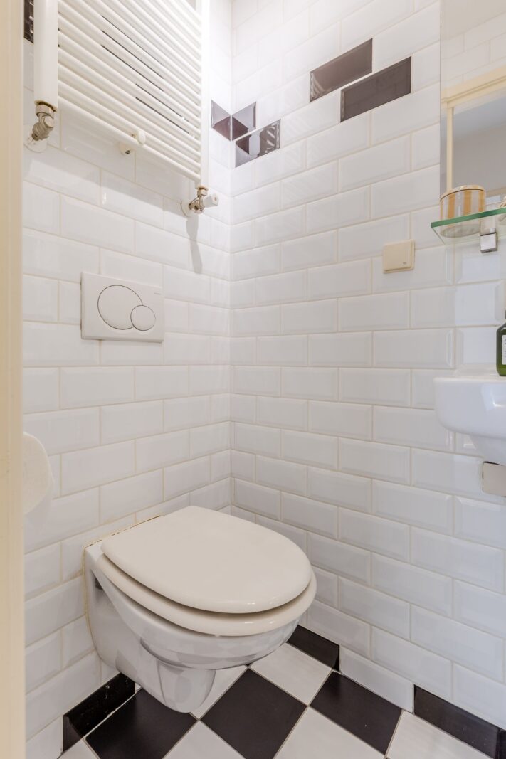 Via the well-maintained stairwell, you reach the second floor. Upon entering the front door, you are welcomed into a wonderfully bright and spacious living room with a modern open kitchen. At the rear are two well-sized bedrooms overlooking a quiet inner courtyard. The fresh and timeless bathroom with wall-mounted toilet complements the well-kept character of the home. There is also a practical separate laundry room.